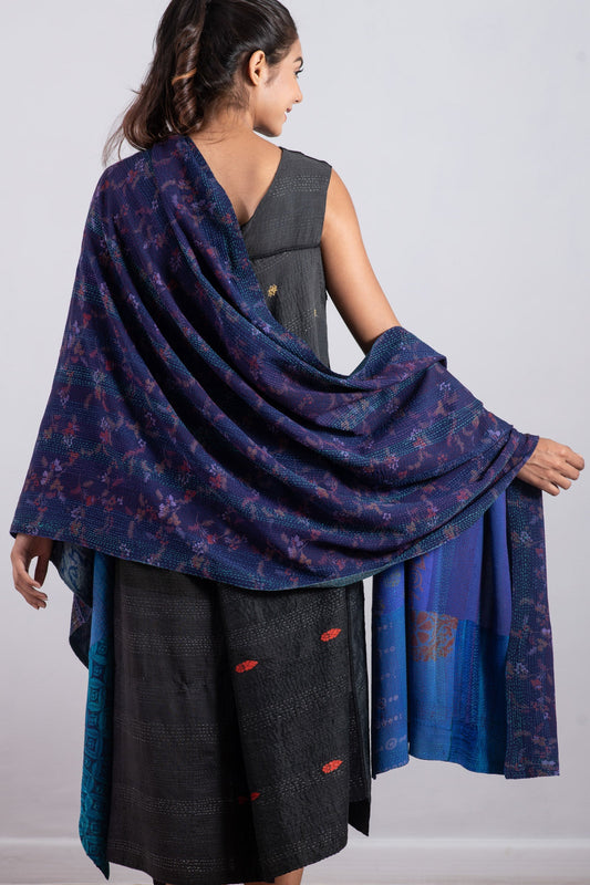 COTTON SILK SW PATCH KANTHA SHAWL X-LARGE - ws2804-nvy -