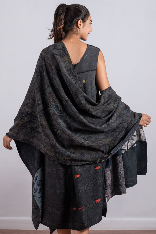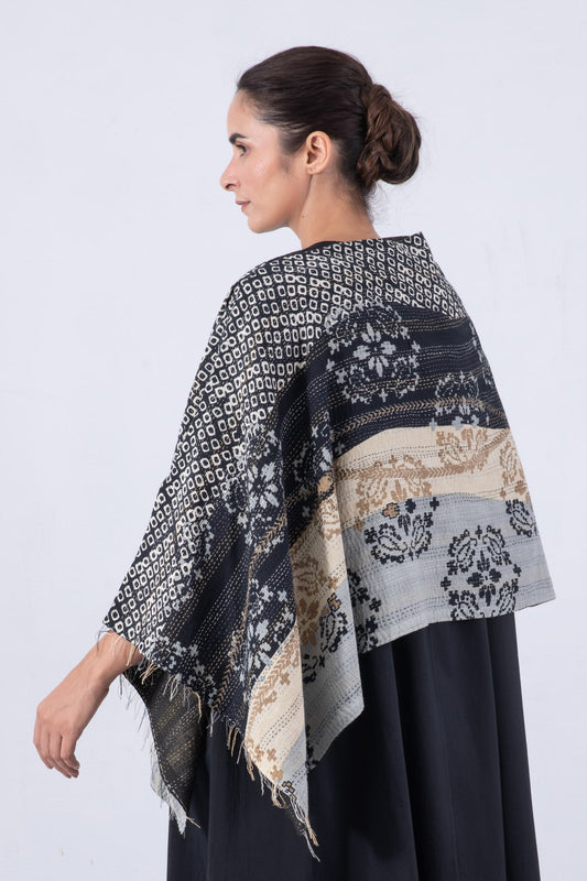 KIMONO PRINT KANTHA SHAWL LARGE - kp2803-blk -