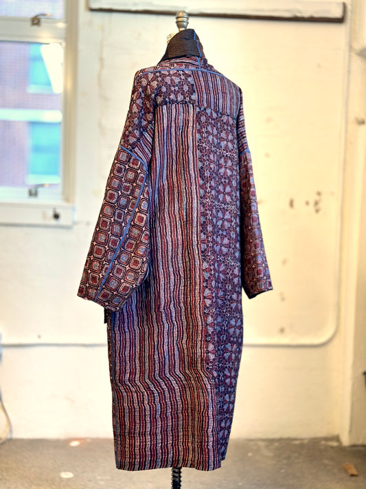 AJRAKH PRINT AND SILK COTTON PATCH KANTHA NEW SHAWL POCKET COAT LONG - az4363-brn -