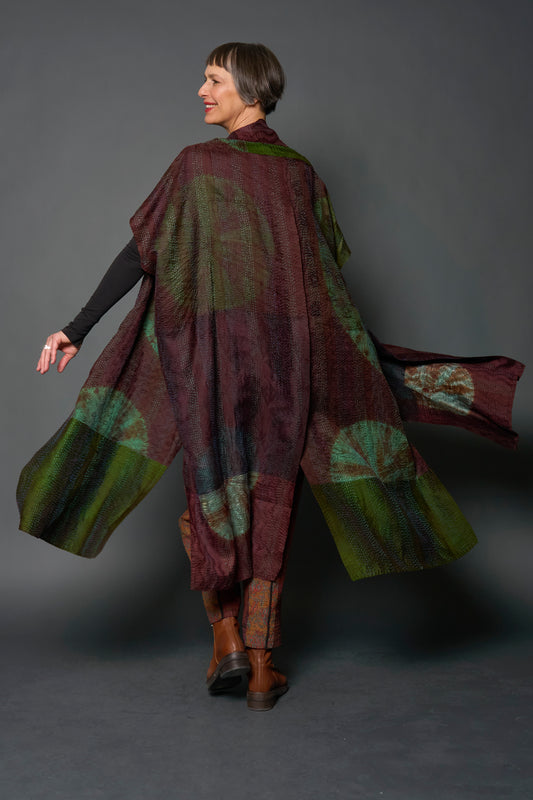 JACQUARD SILK PATCH TIE DYE CIRCLE SHIBORI KANTHA PONCHO TOP - wj2568-grn -