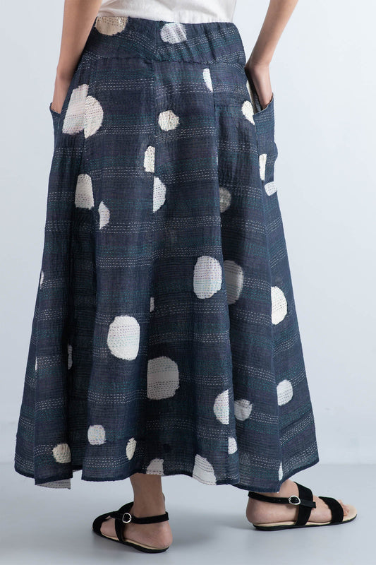 CUT THROUGH DOT AND HOLES KANTHA PANELED FLARE SKIRT - cd2630-blu -