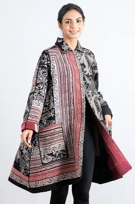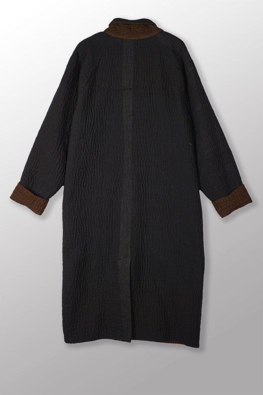 QUILTED VINTAGE COTTON WITH FLANNEL KANTHA RAGLAN SLEEVE COAT - fq5337-blk -