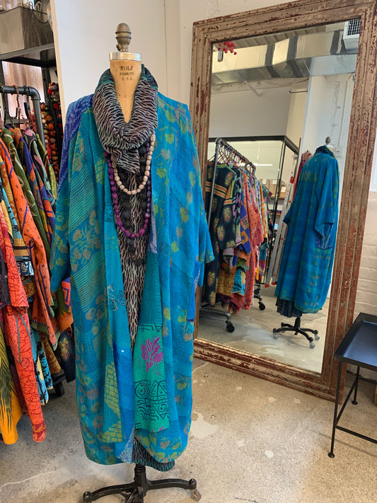 GEORGETTE VINTAGE SILK PATCH KANTHA KIMONO MAXI - gs2318-tuq -