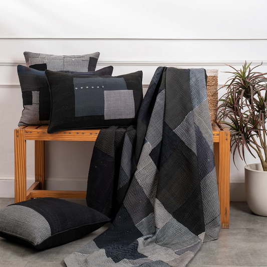 Monotone Ikat Handmade Vintage Kantha Throw -Monotone Black -