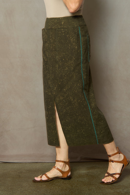 DUCK SUN DYE WITH PATCH KANTHA FRONT VENT PENCIL SKIRT - us2666-grn -