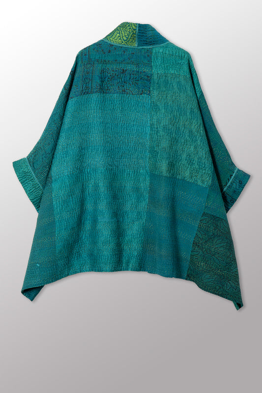 GEORGETTE JACQUARD VINTAGE SILK PATCH KANTHA DOUBLE COLLAR PONCHO - gj4323-grn -