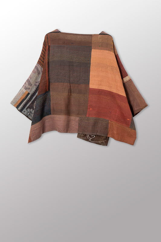 GEORGETTE JACQUARD VINTAGE SILK PATCH KANTHA DOUBLE COLLAR PONCHO - gj4323-org -