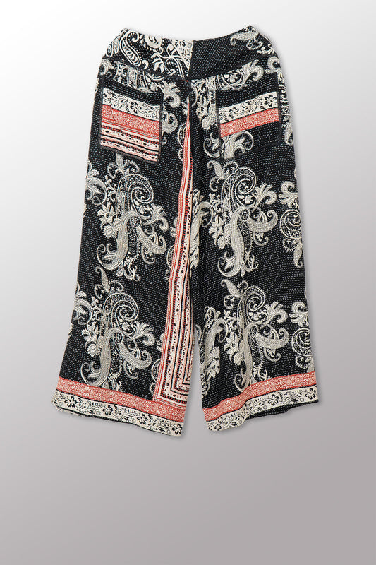 COTTON PAISLEY KANTHA MID RISE WIDE LEG PANTS - cp2665-blk -