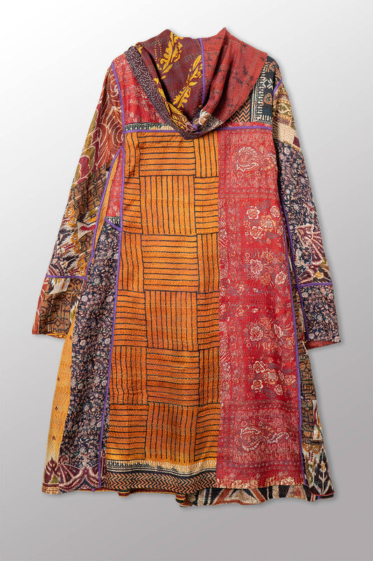 VINTAGE SILK KANTHA HOODED A-LINE LONG COAT - sv2306-0004a -