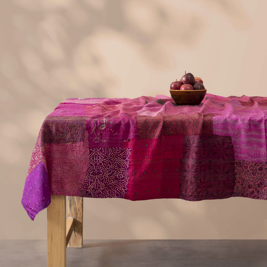 Printed Fray Vintage Cotton Kantha Table Cover -Pink-