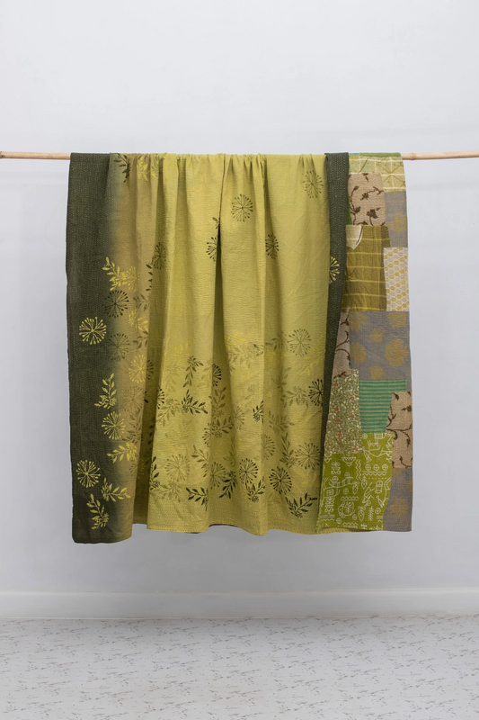 Vintage Fray Patch & Ombre Kantha Table Cover -Avocado -