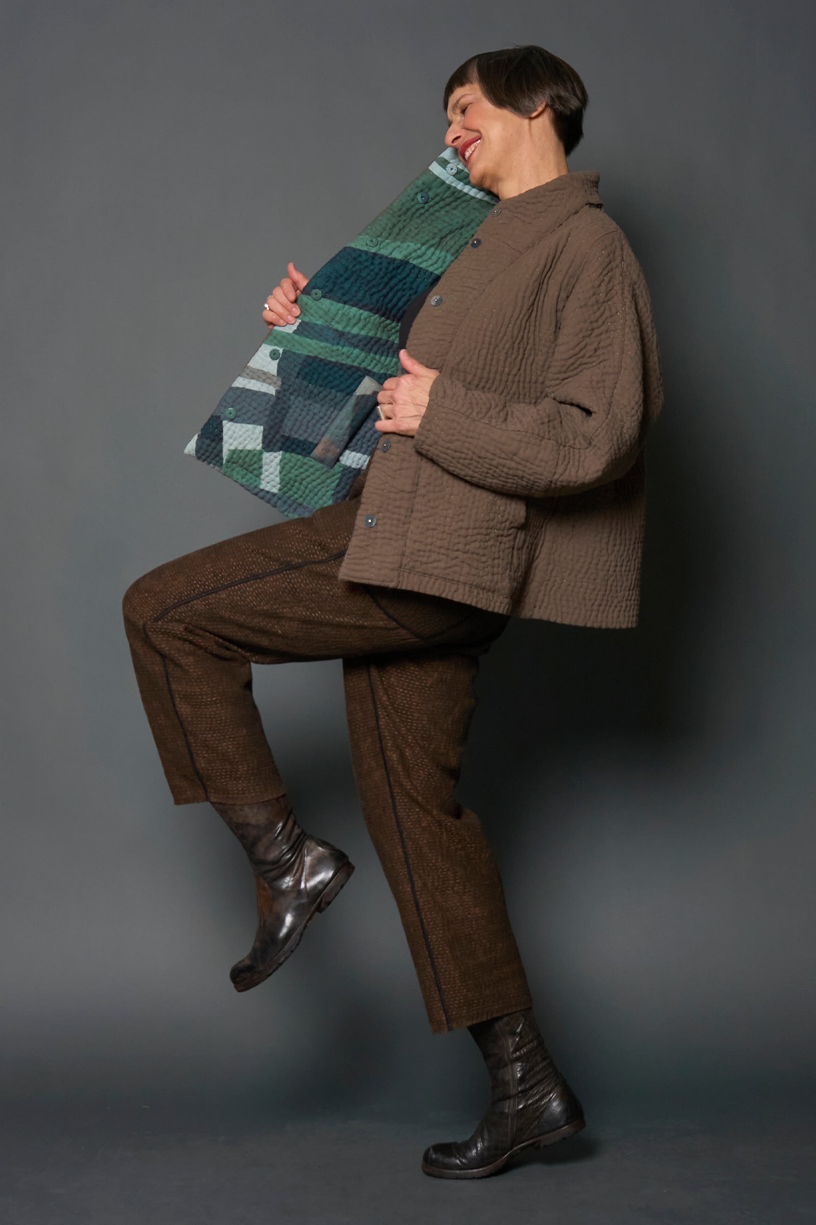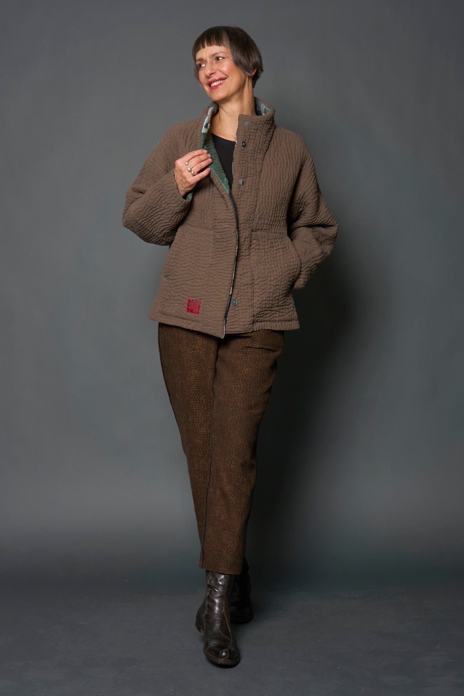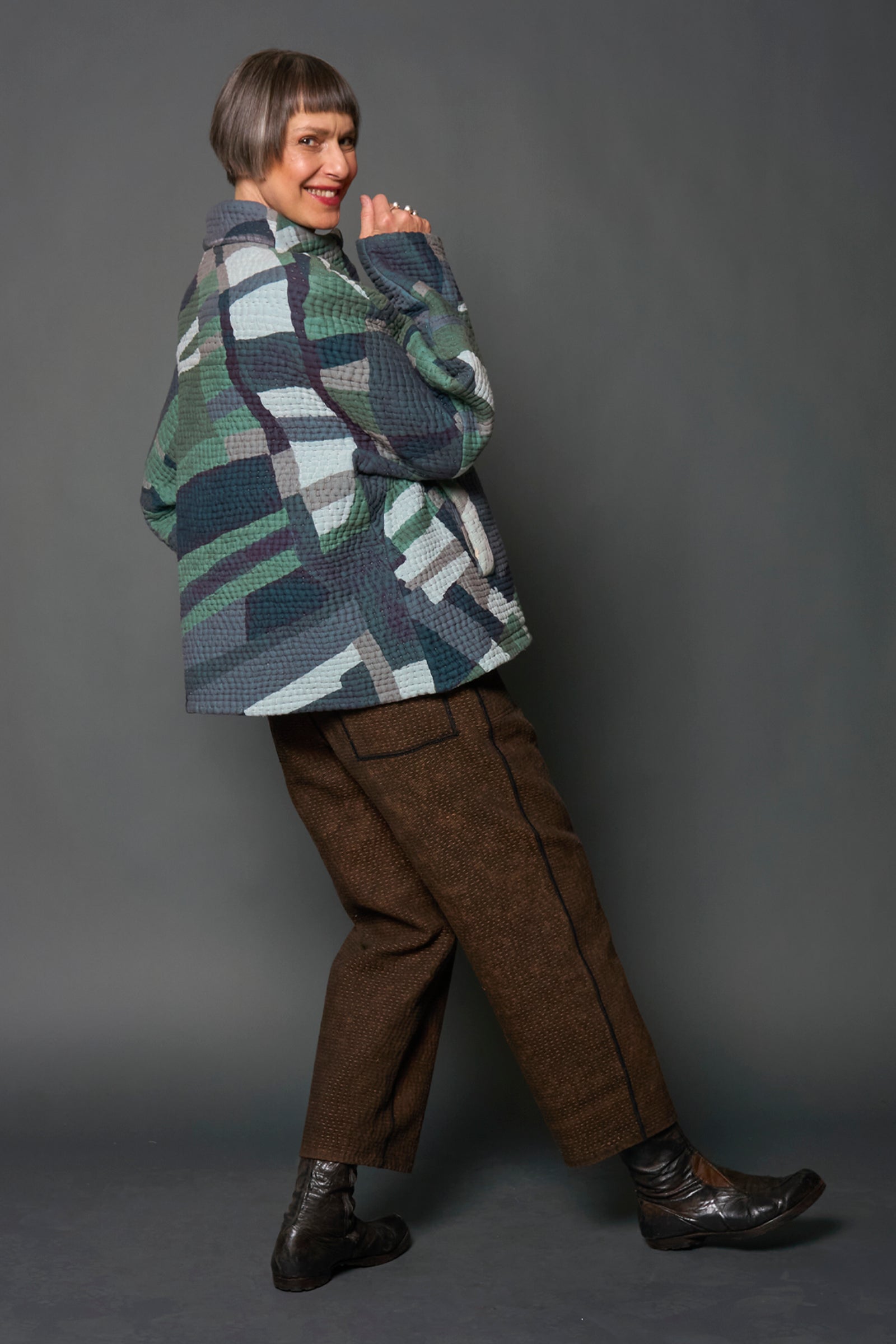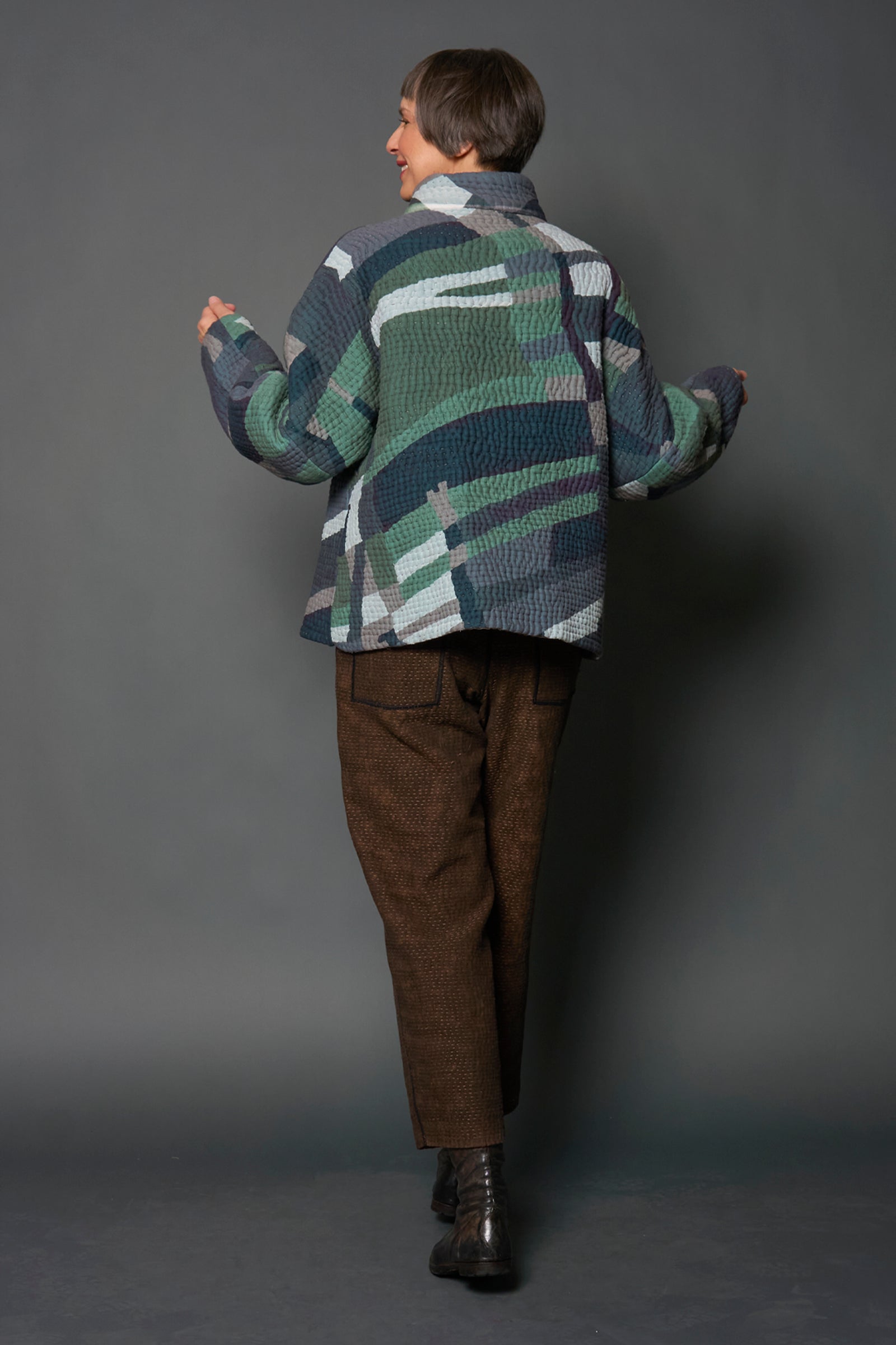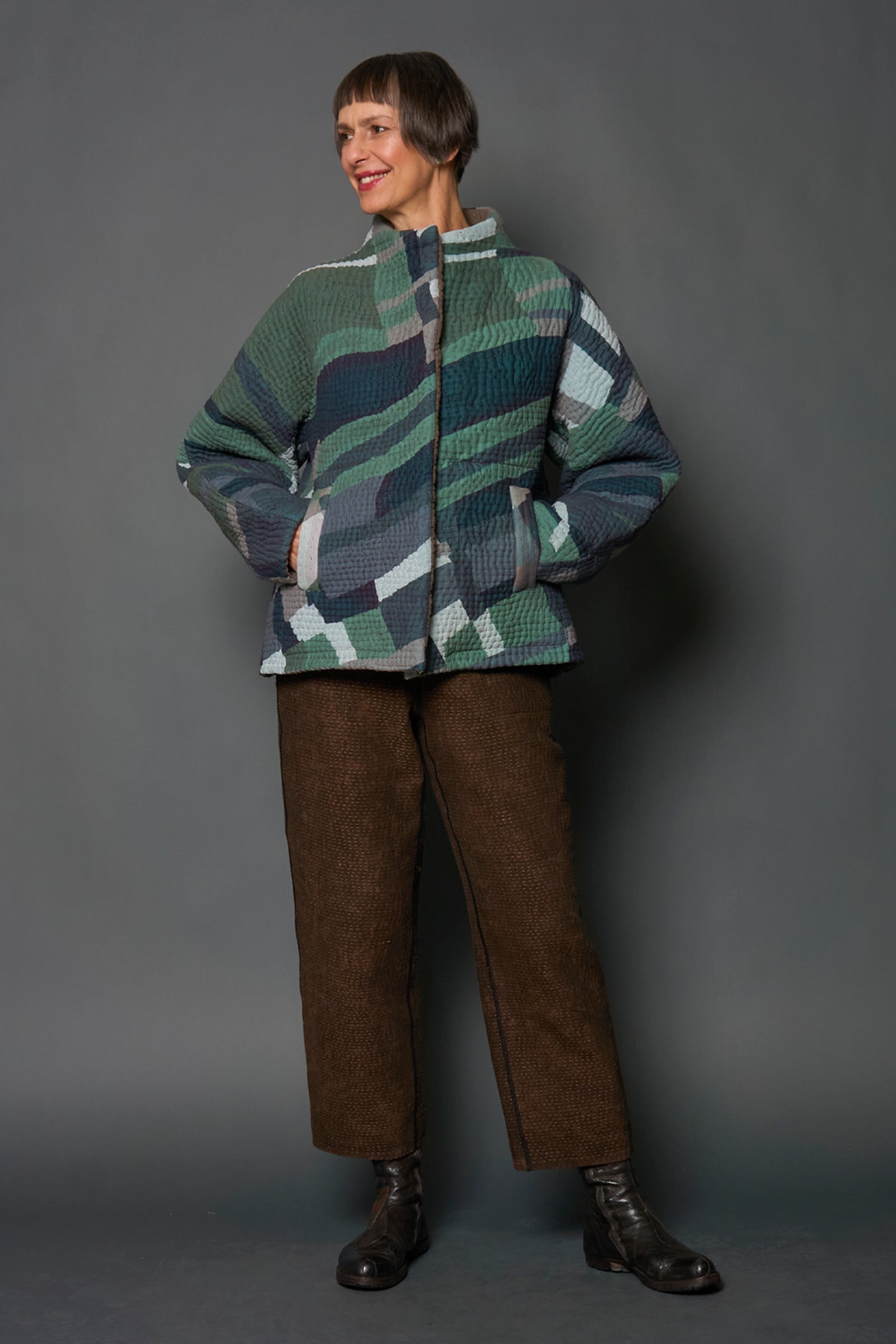ABSTRACT AND DUCK CLOTH KANTHA HIGH-NECK CROPPED JACKET - ap5095-grn -