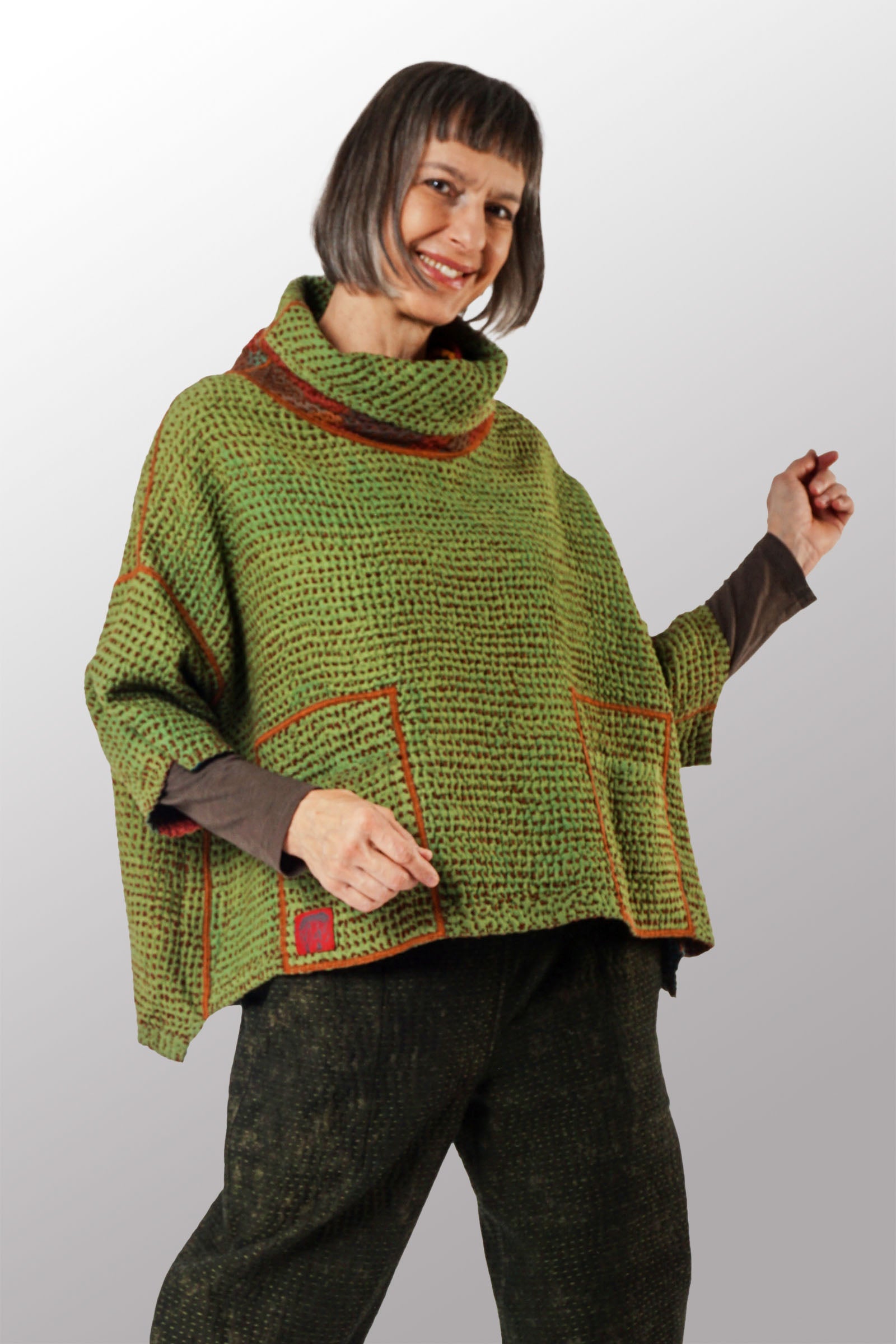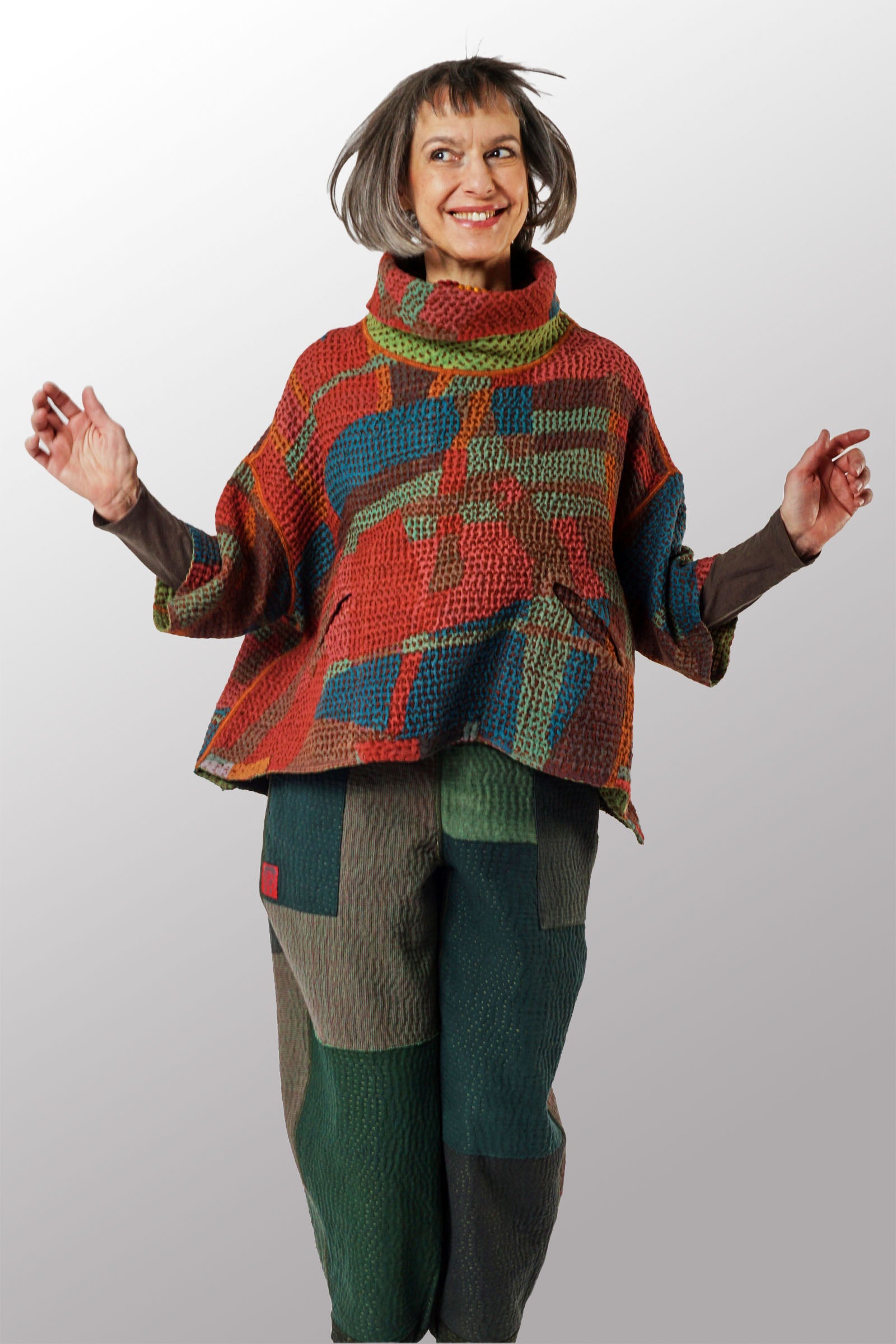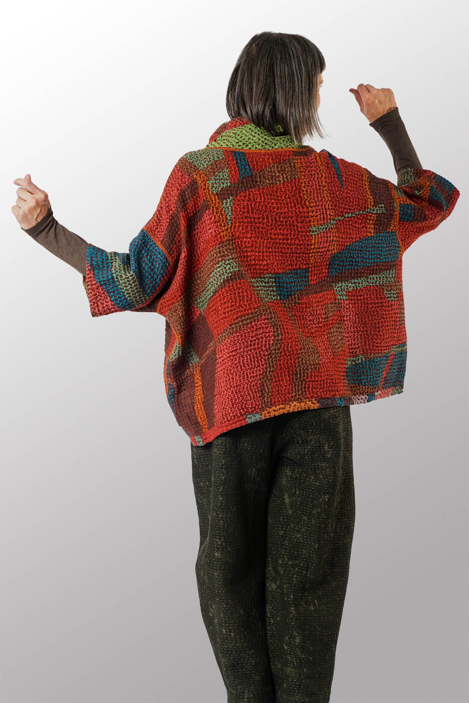 ABSTRACT WAFFLE KANTHA COWL NECK PONCHO - bw3061-red -
