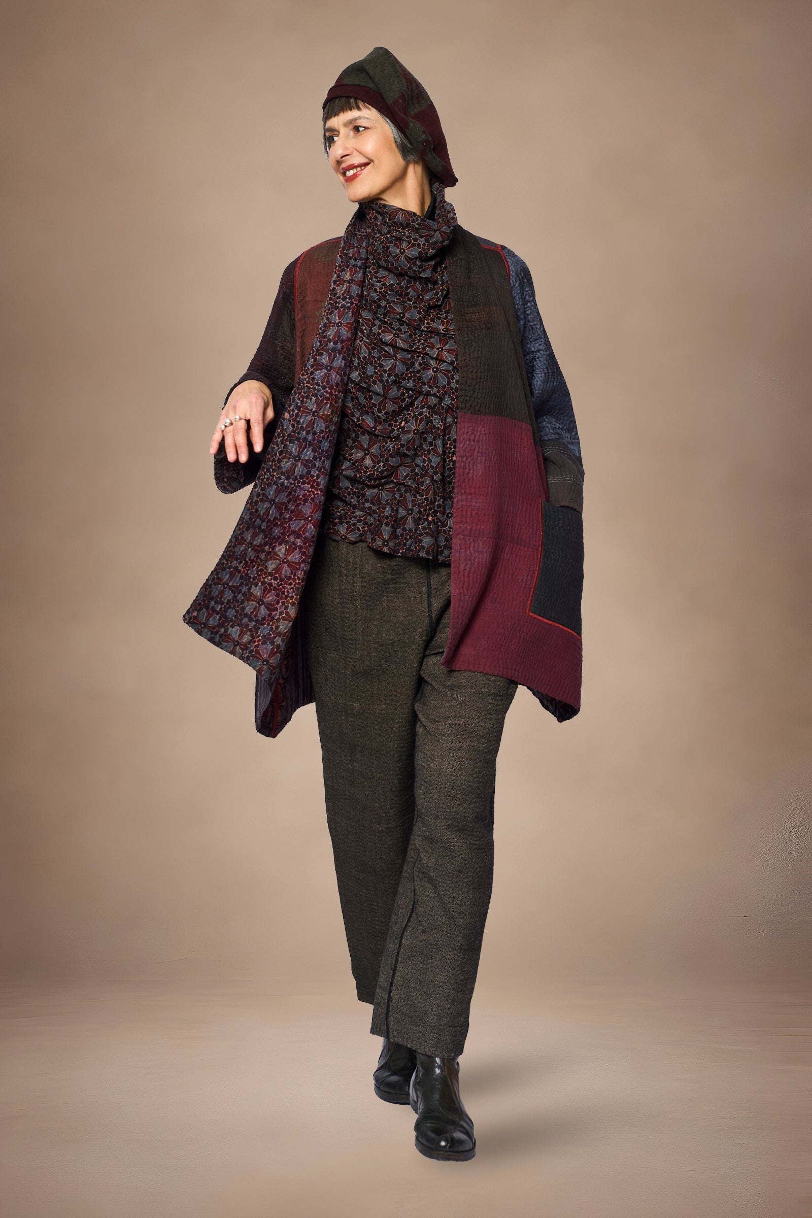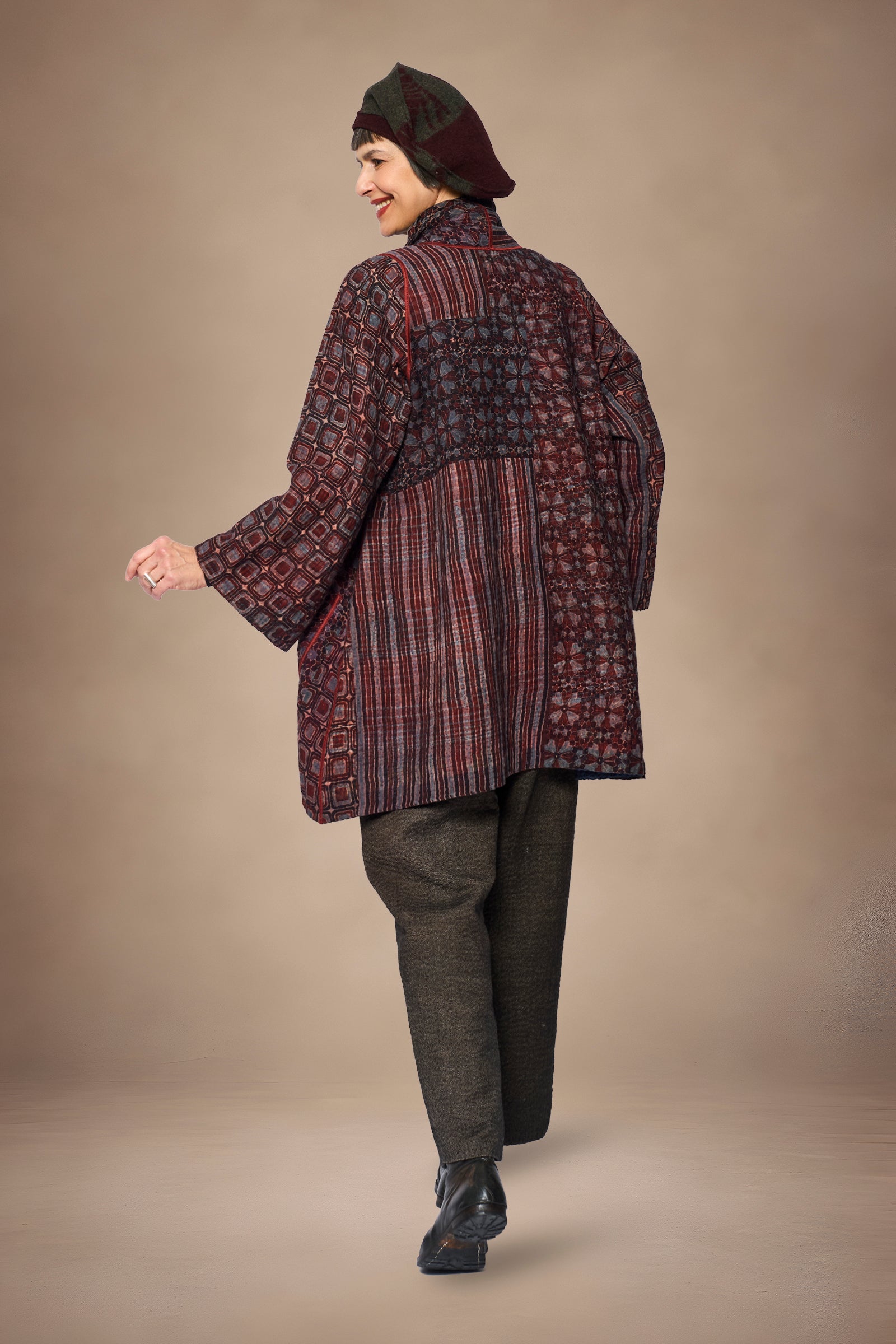 AJRAKH PRINT AND SILK COTTON PATCH KANTHA A-LINE JACKET - az4003-brn -