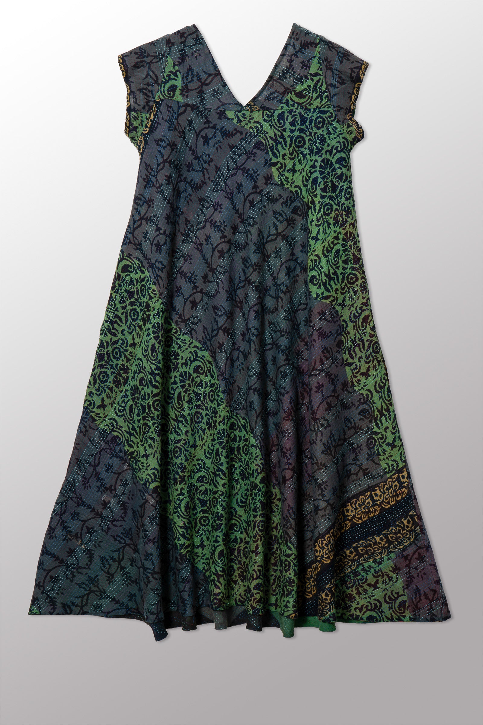 BAGH PRINT KANTHA CAP SLV. FLARE DRESS - bg2425-grn -