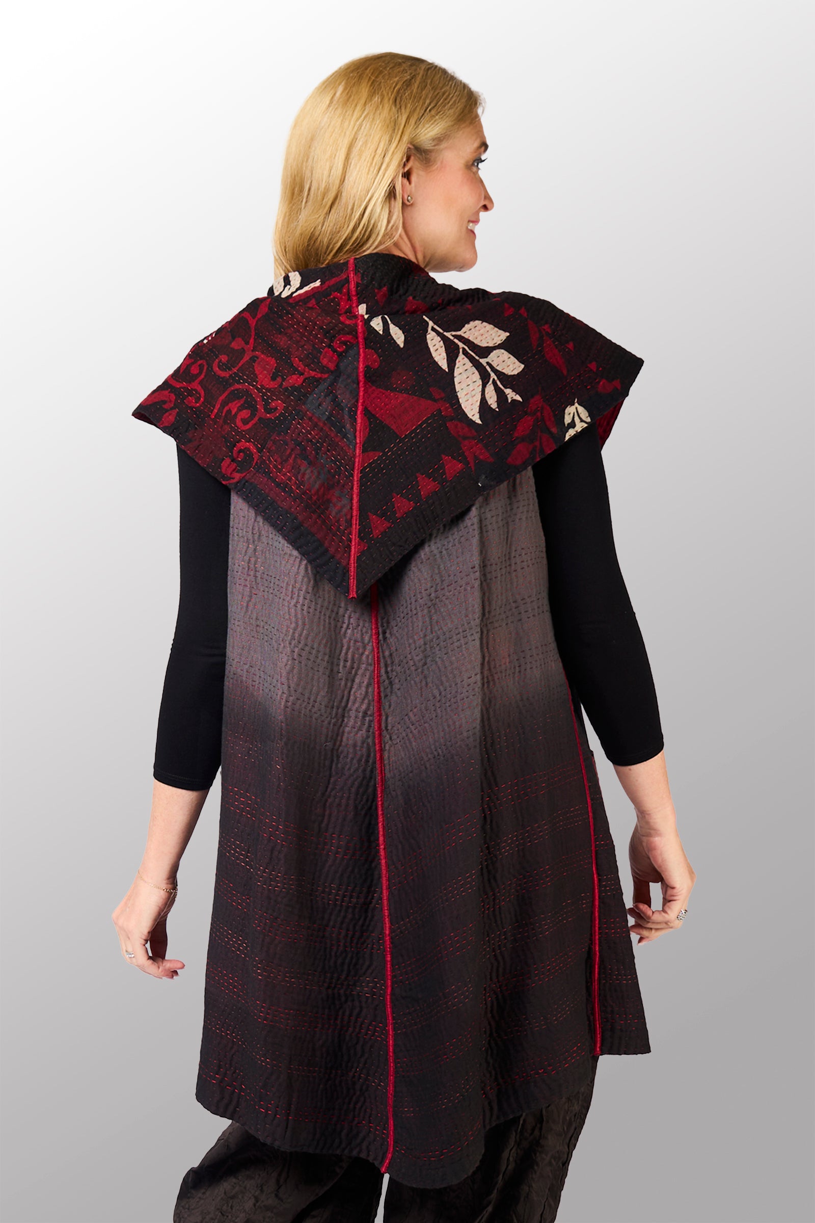 BIG PRINTED PATCH WITH OMBRE BACKING KANTHA CIRCULAR VEST - px4201-red -