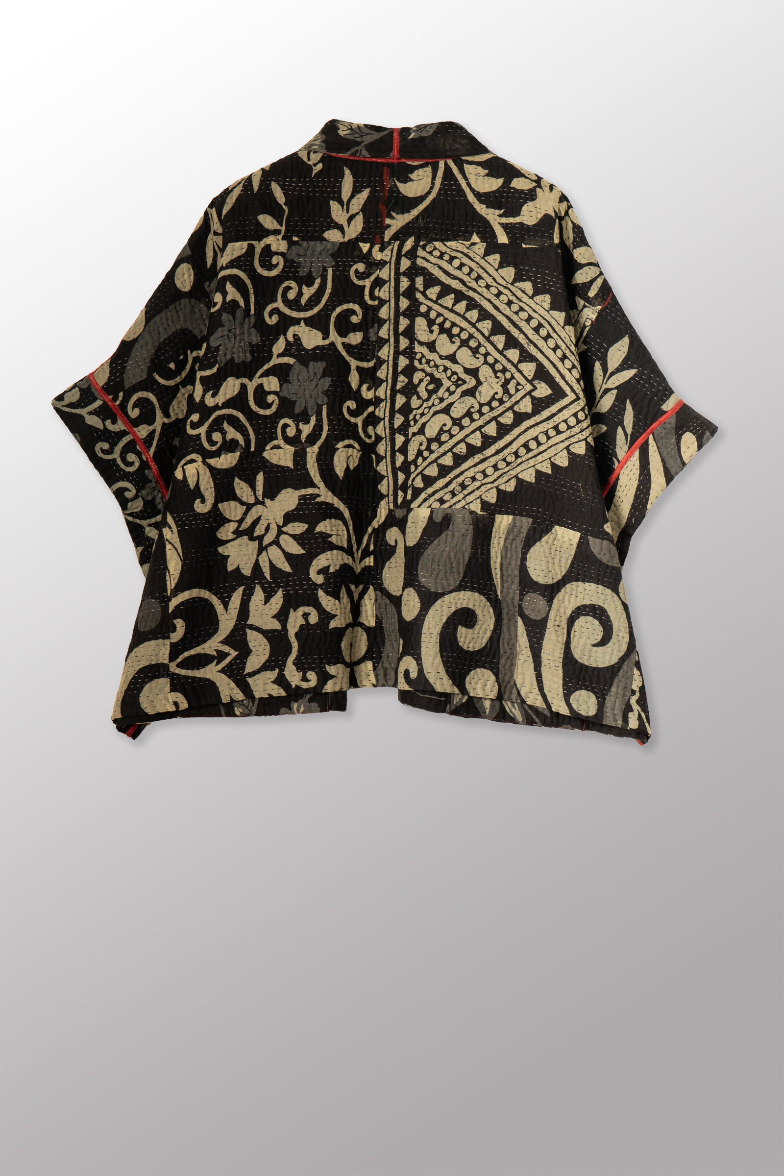 BLACK AND WHITE PRINT PATCH KANTHA MINI PONCHO - pn4060-blk -