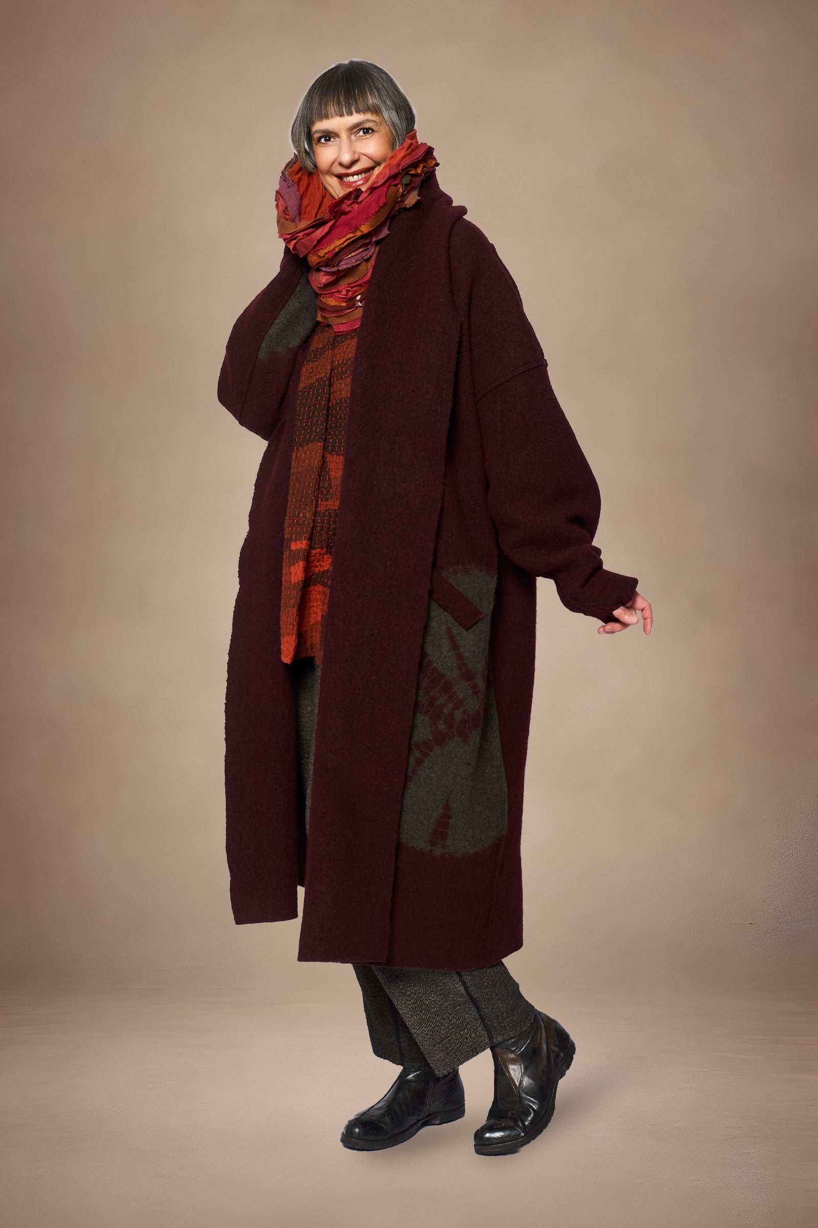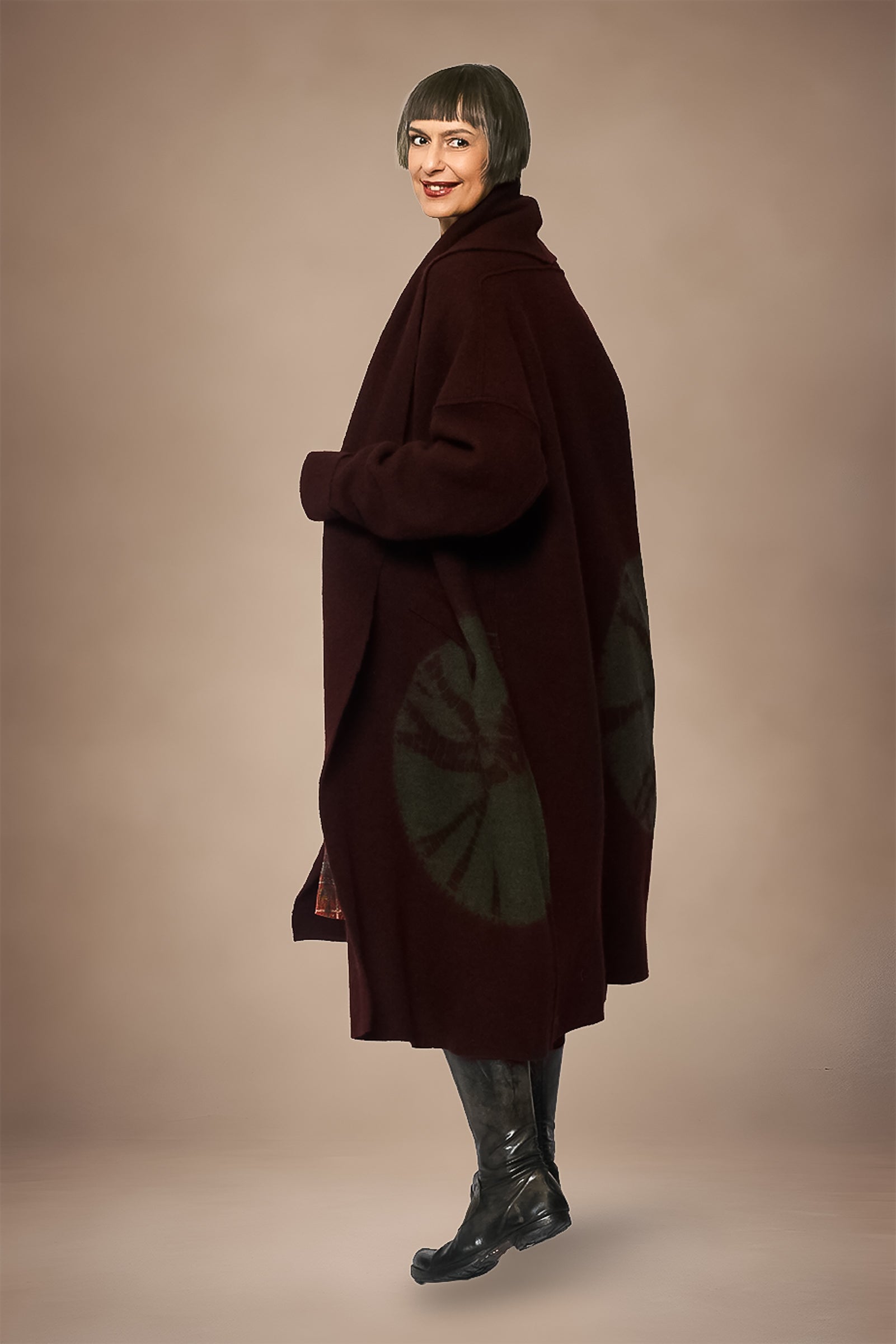 CIRCLE TIE DYE BOILED WOOL NEW SHAWL COAT LONG - tw1362-brn -