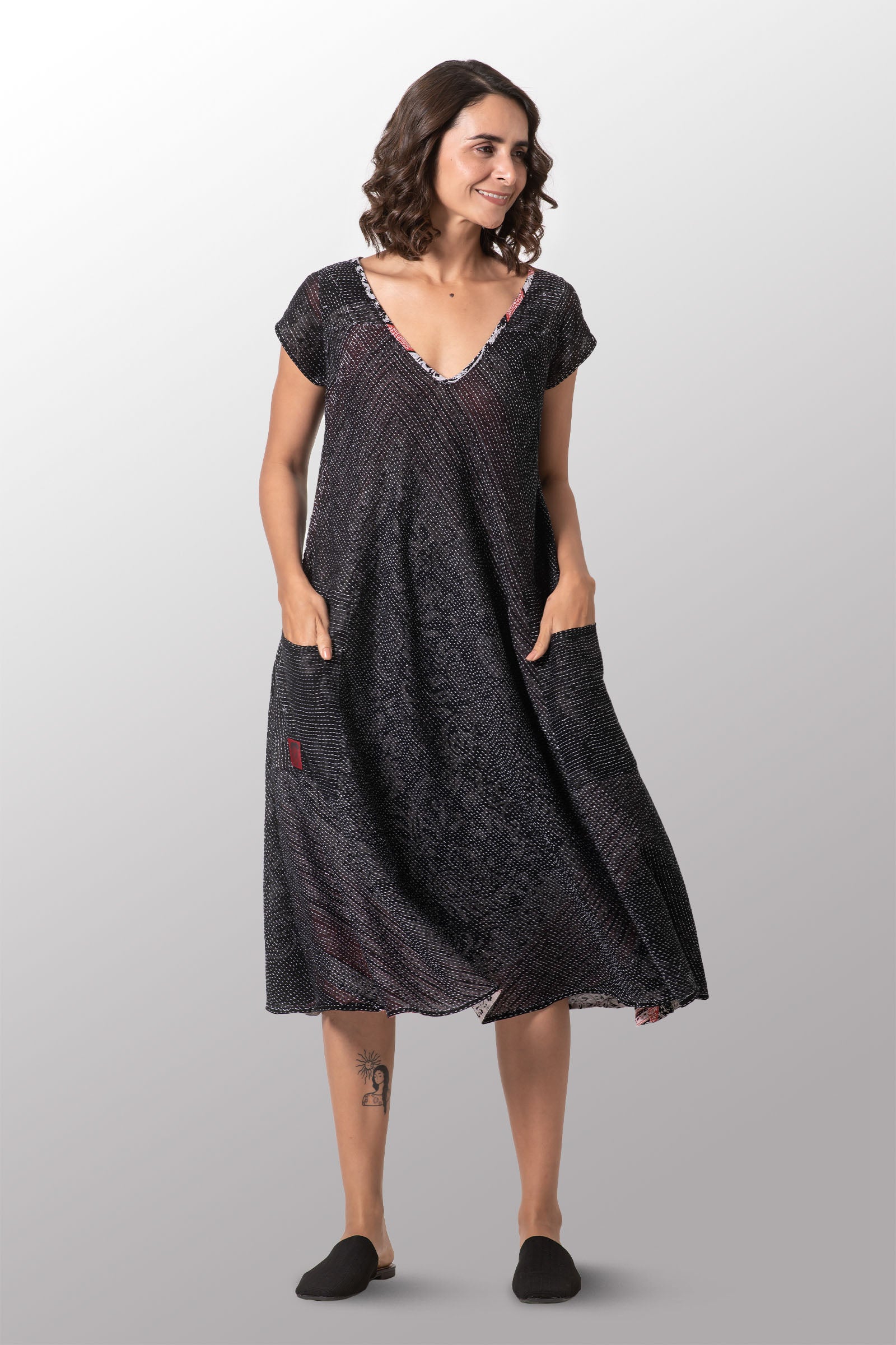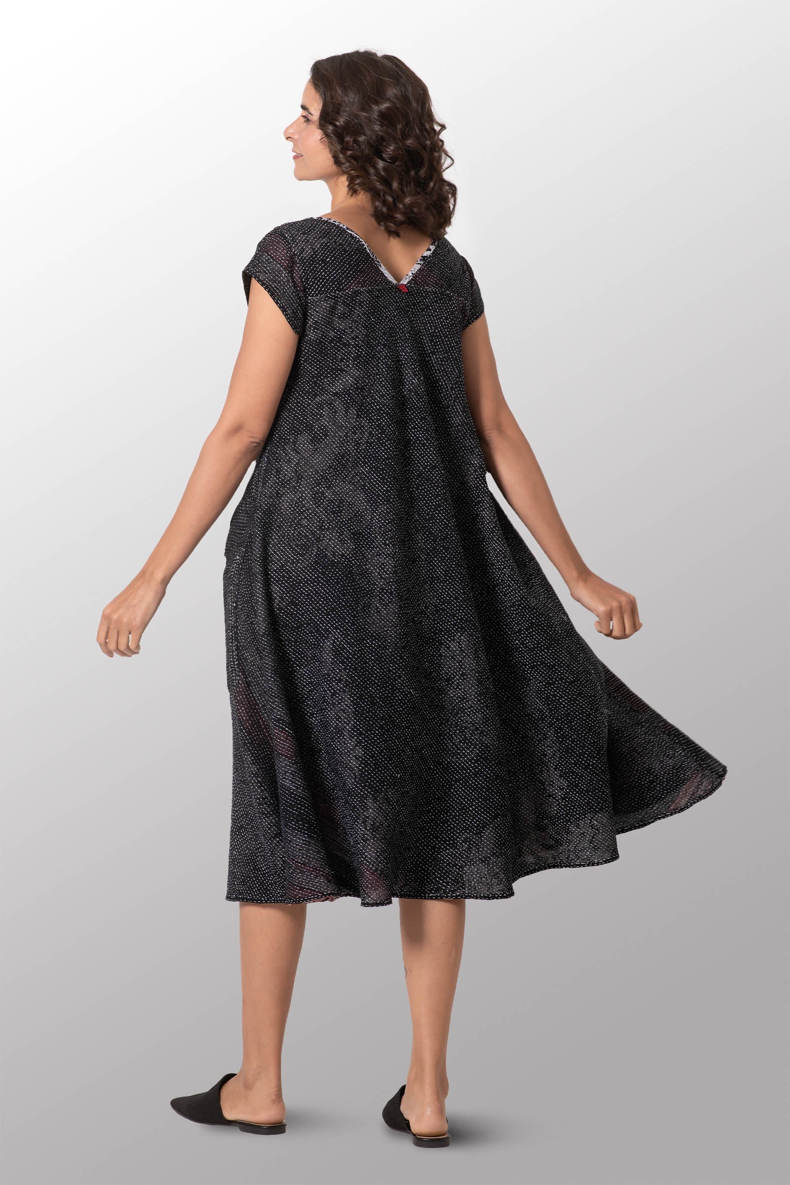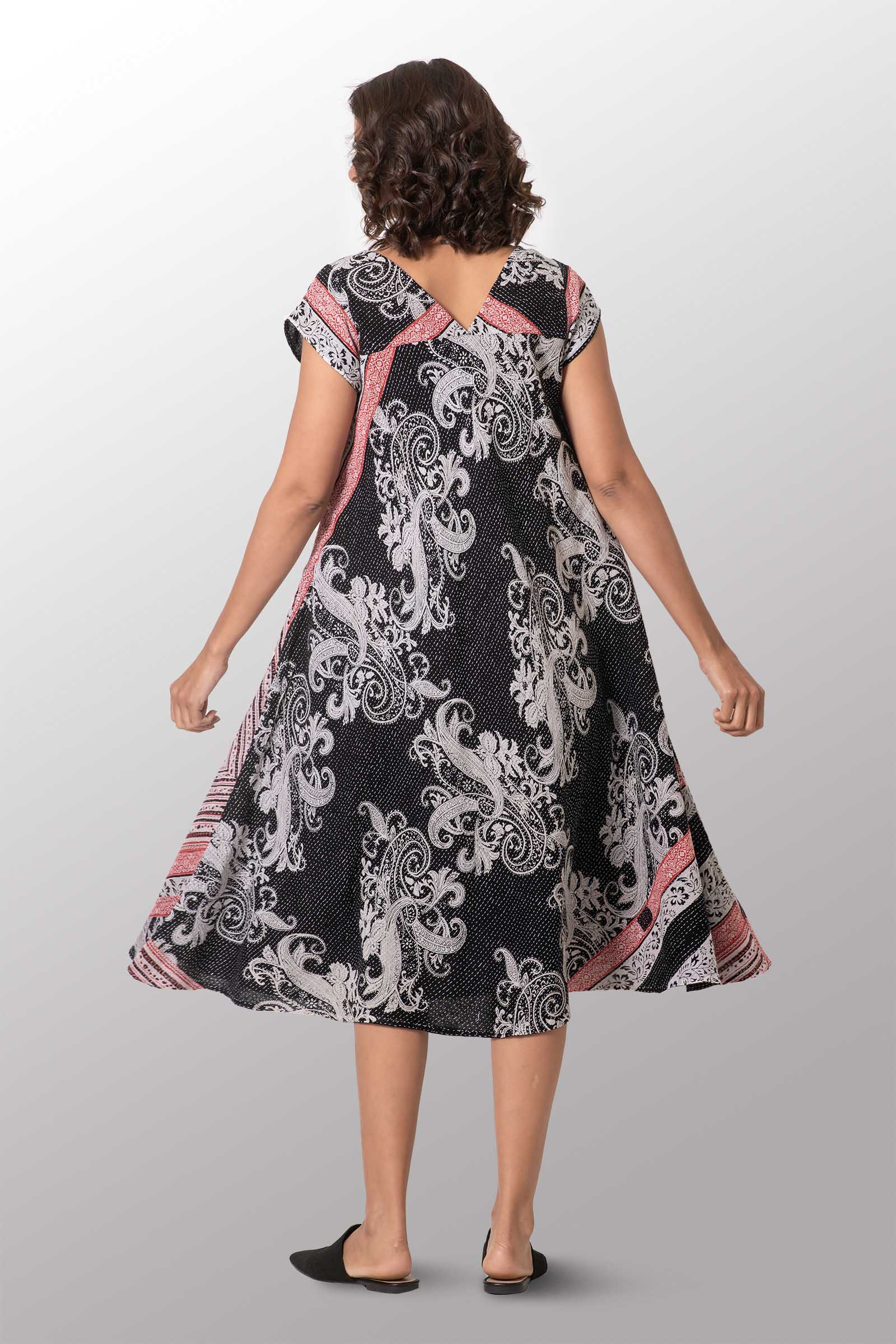 COTTON PAISLEY KANTHA CAP SLV. FLARE DRESS - cp2425-blk -