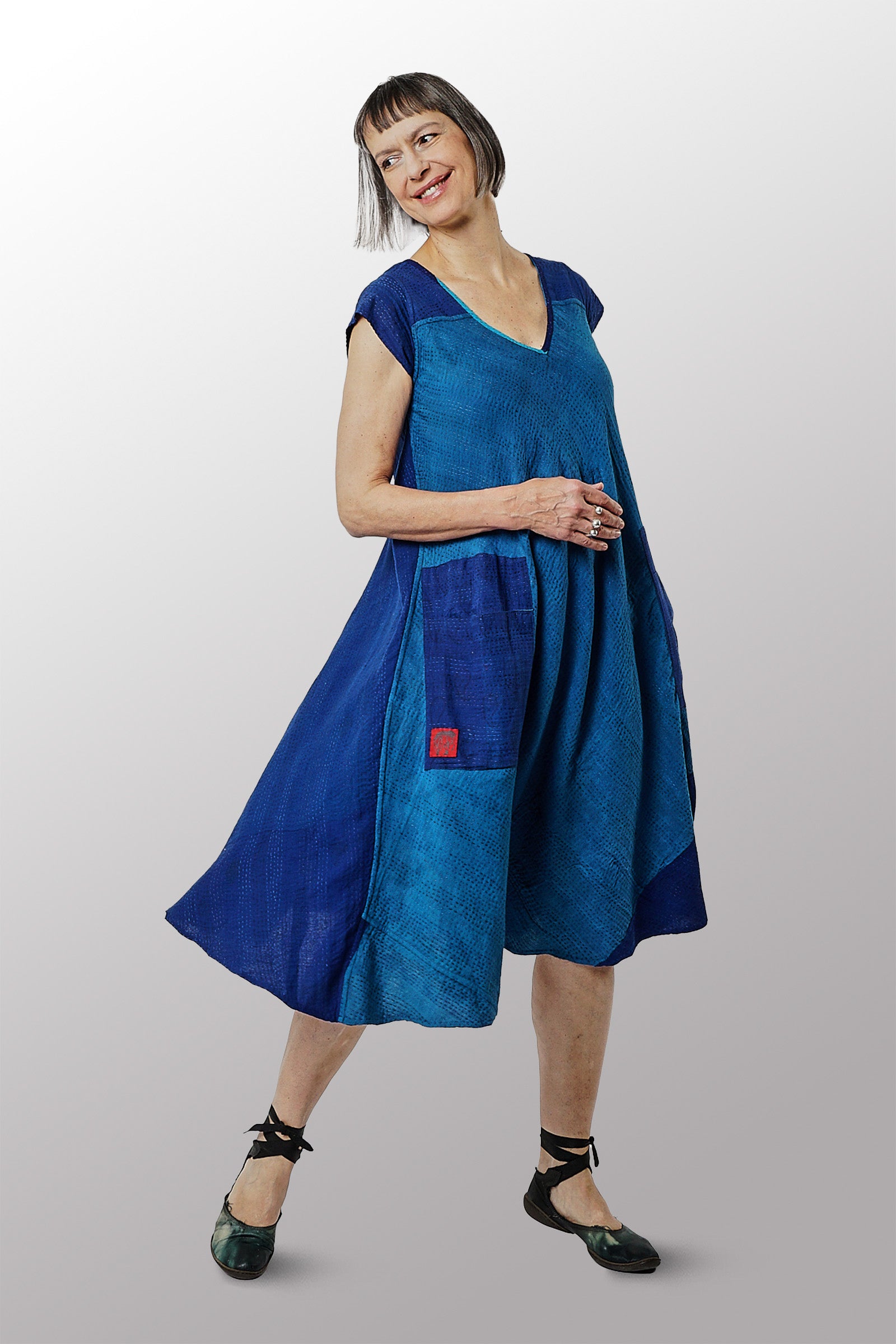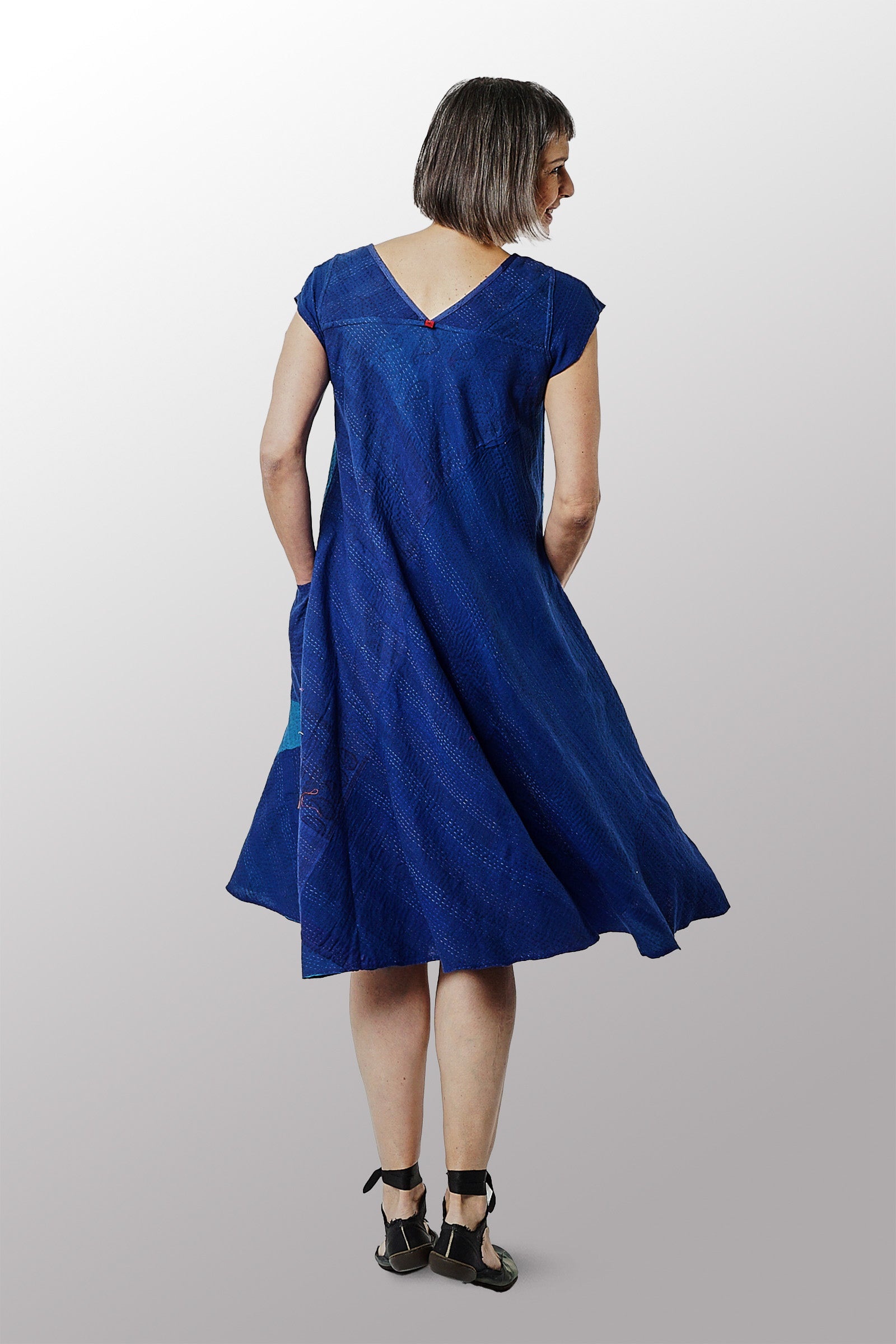 COTTON SILK SW PATCH OMBRE KANTHA CAP SLV. FLARE DRESS - wo2425-blu -