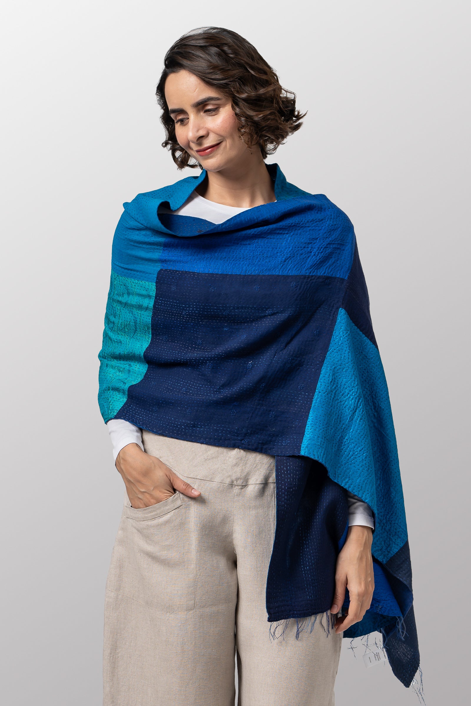 COTTON SILK SW PATCH OMBRE KANTHA SCARF STANDARD - wo2801-blu -