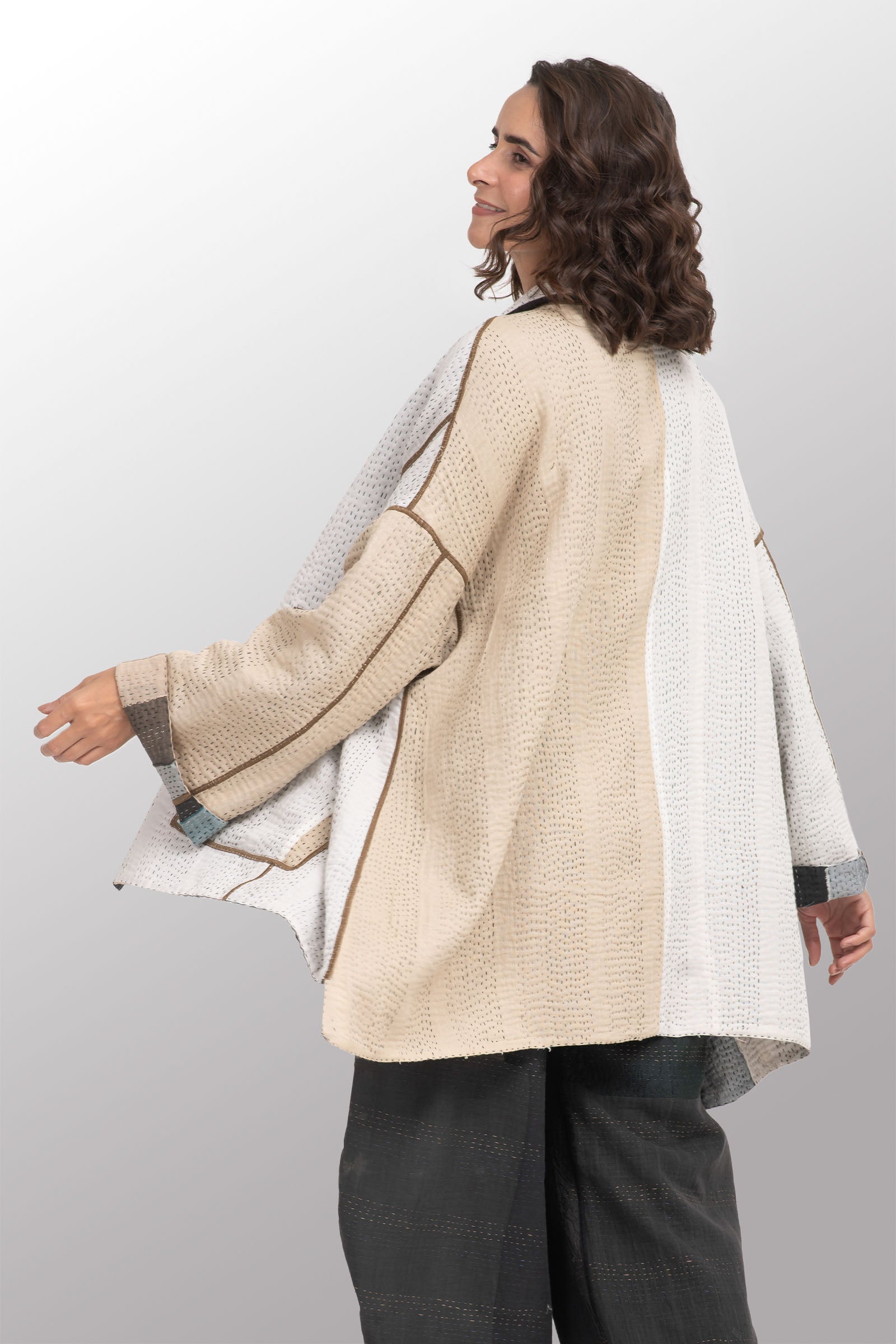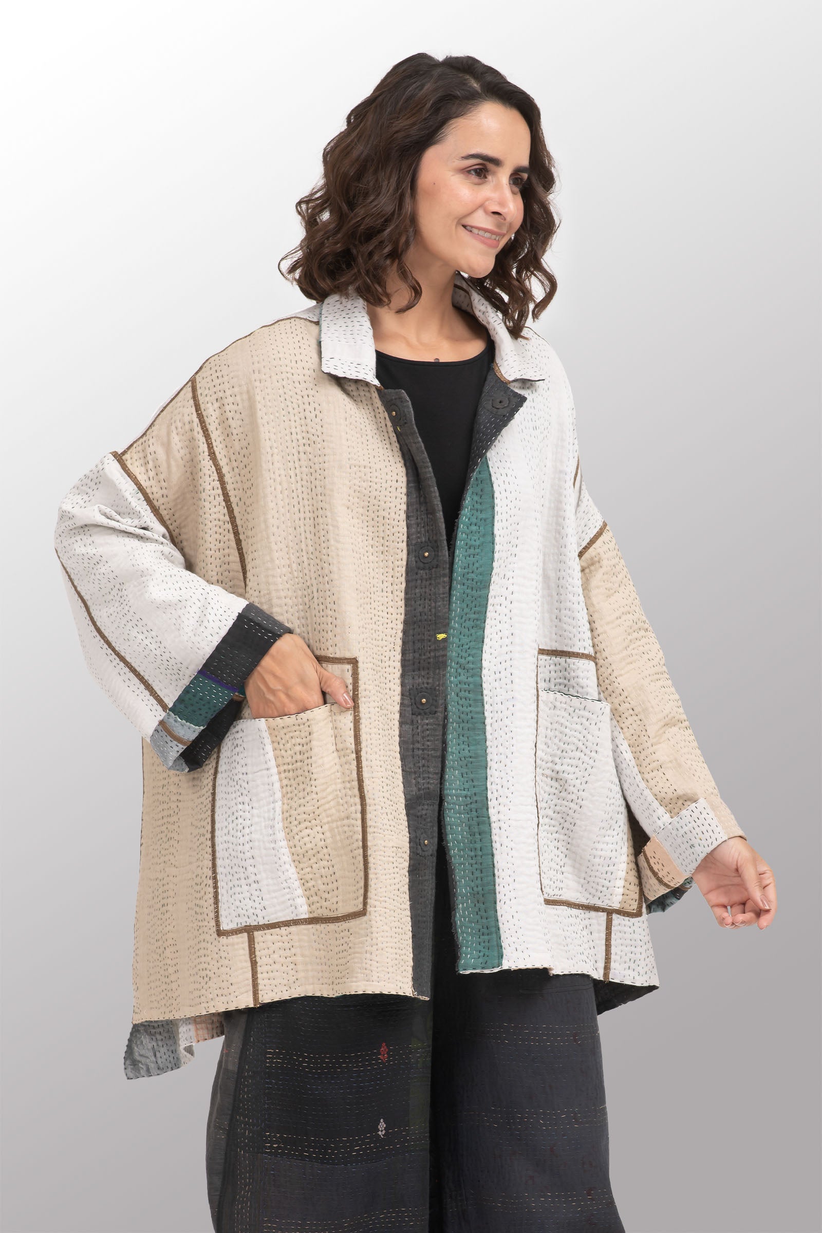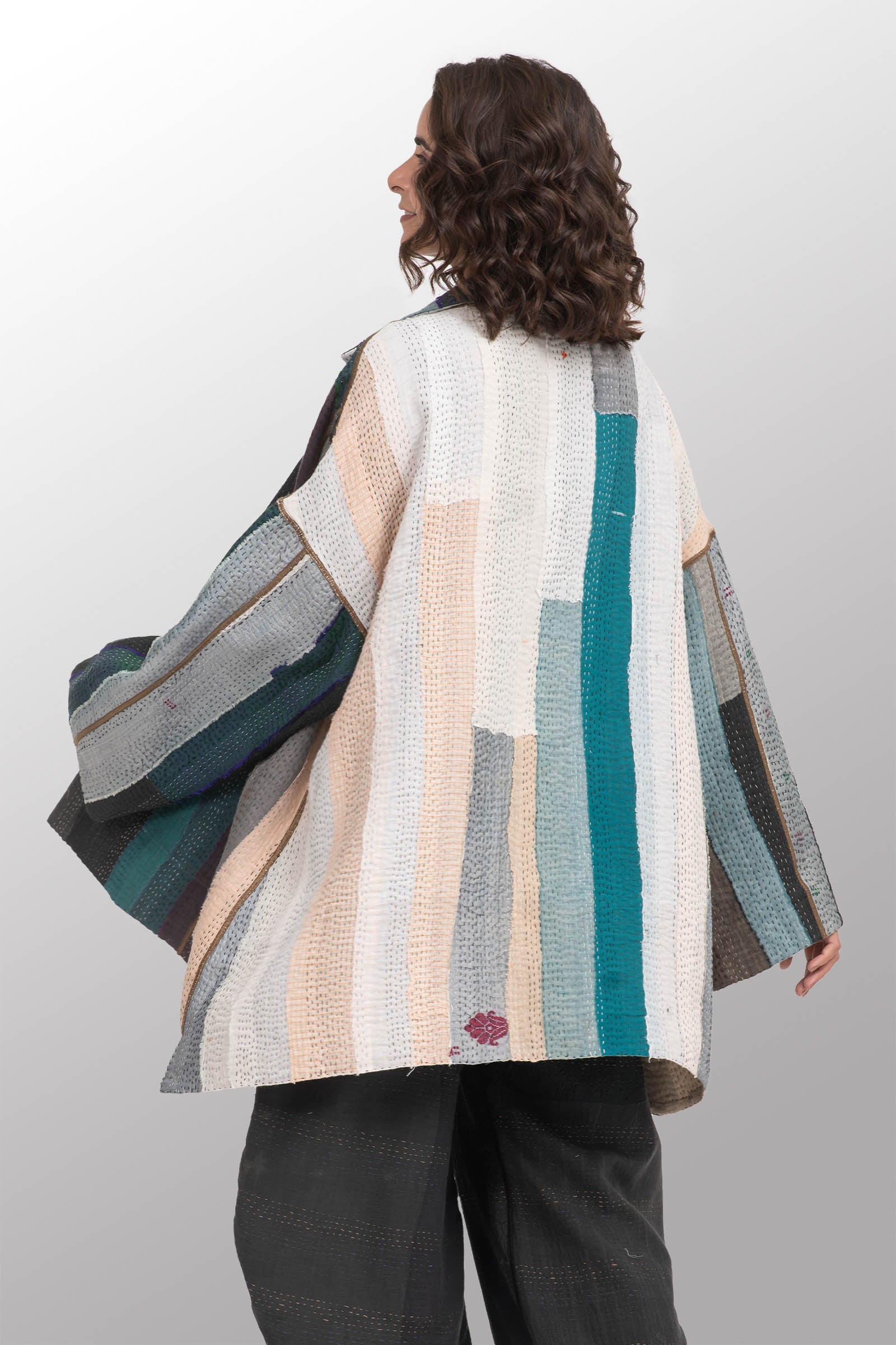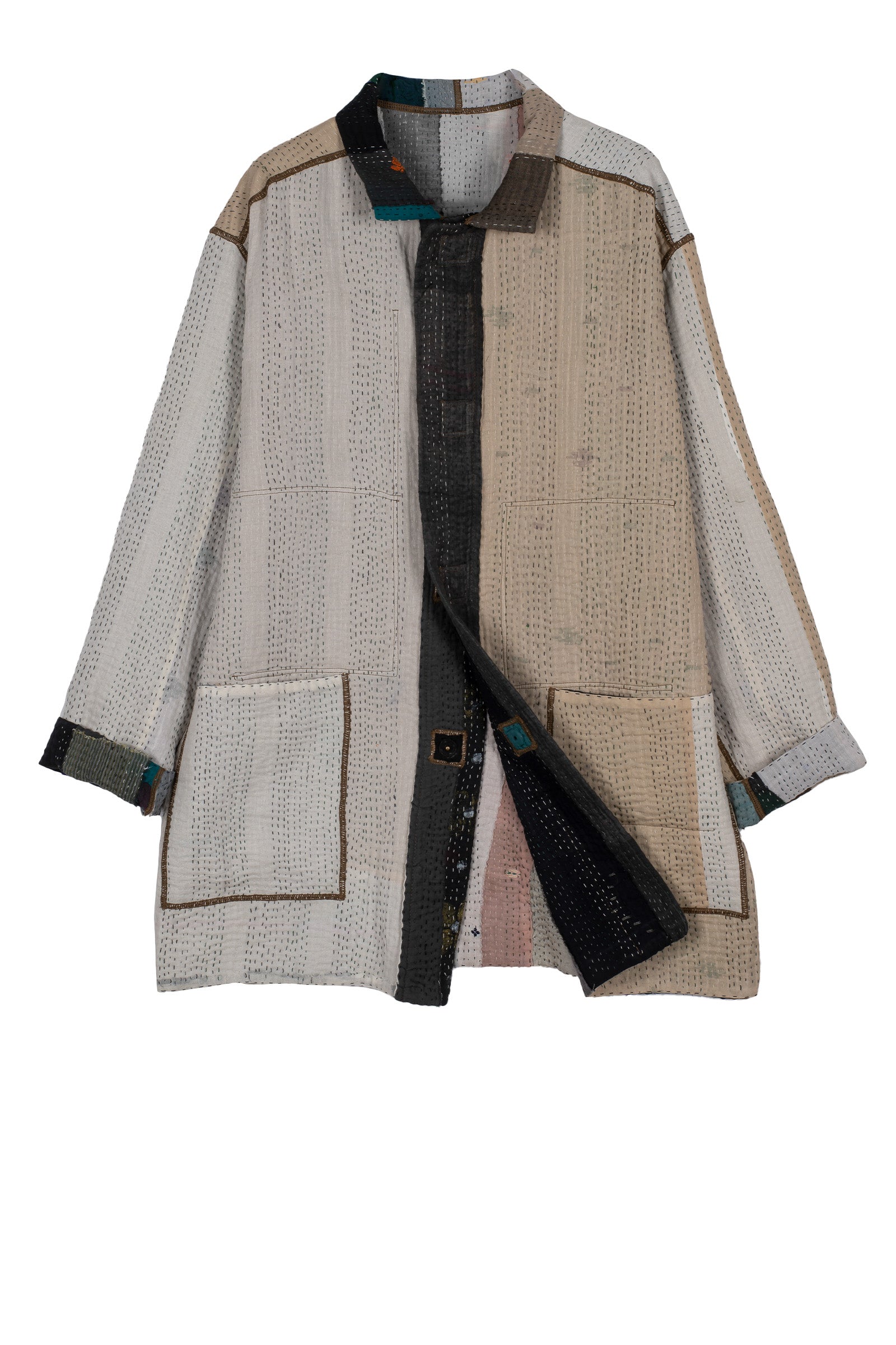 COTTON STRIPE PATCH KANTHA OVERSIZED MINI COAT - cs4332-grn -