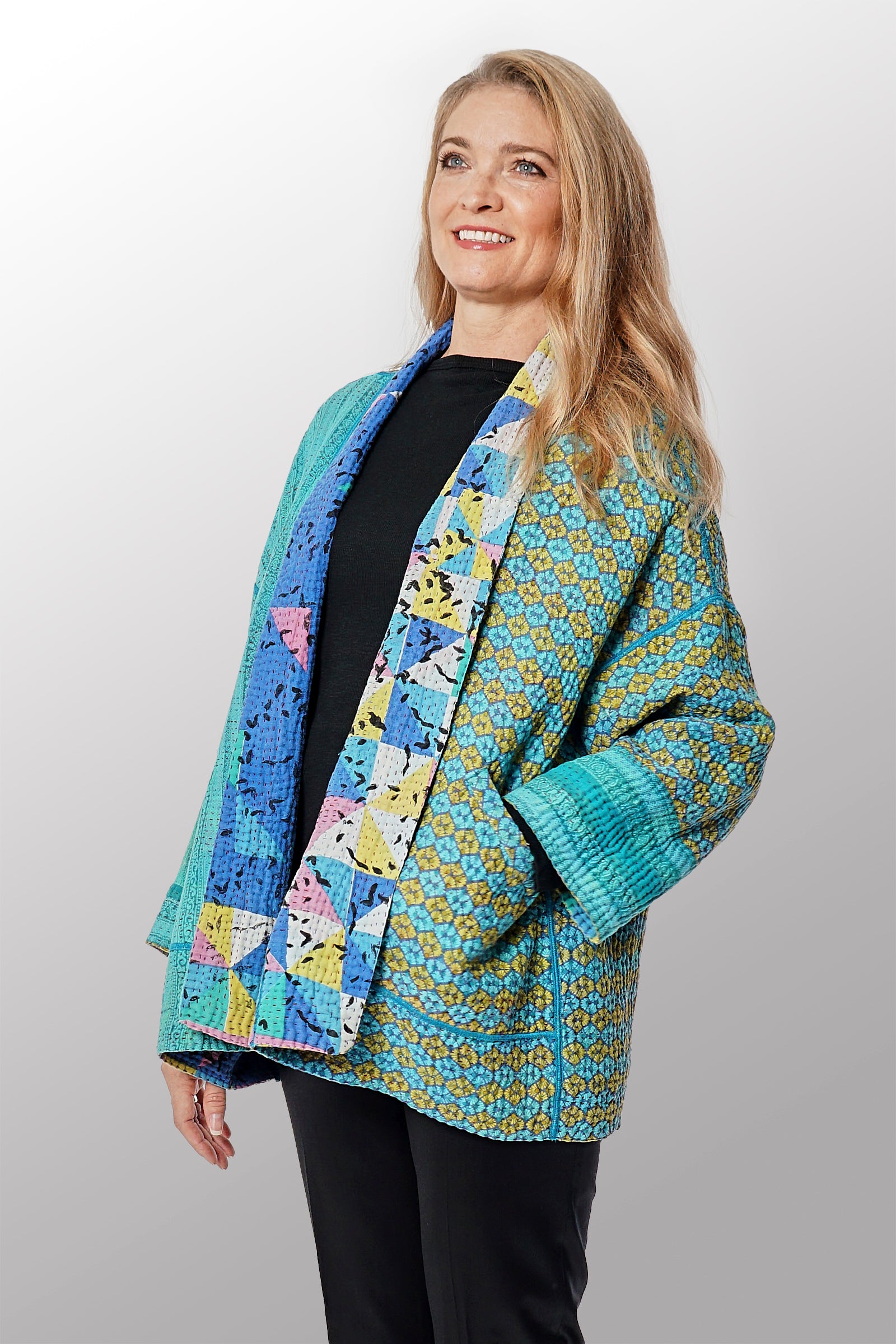 4 Layer Vintage Saris with Hand Stitches on Entire Garment - Reversible