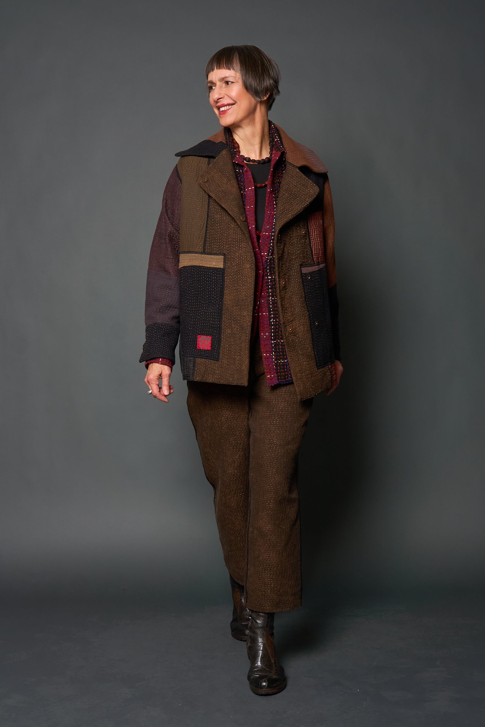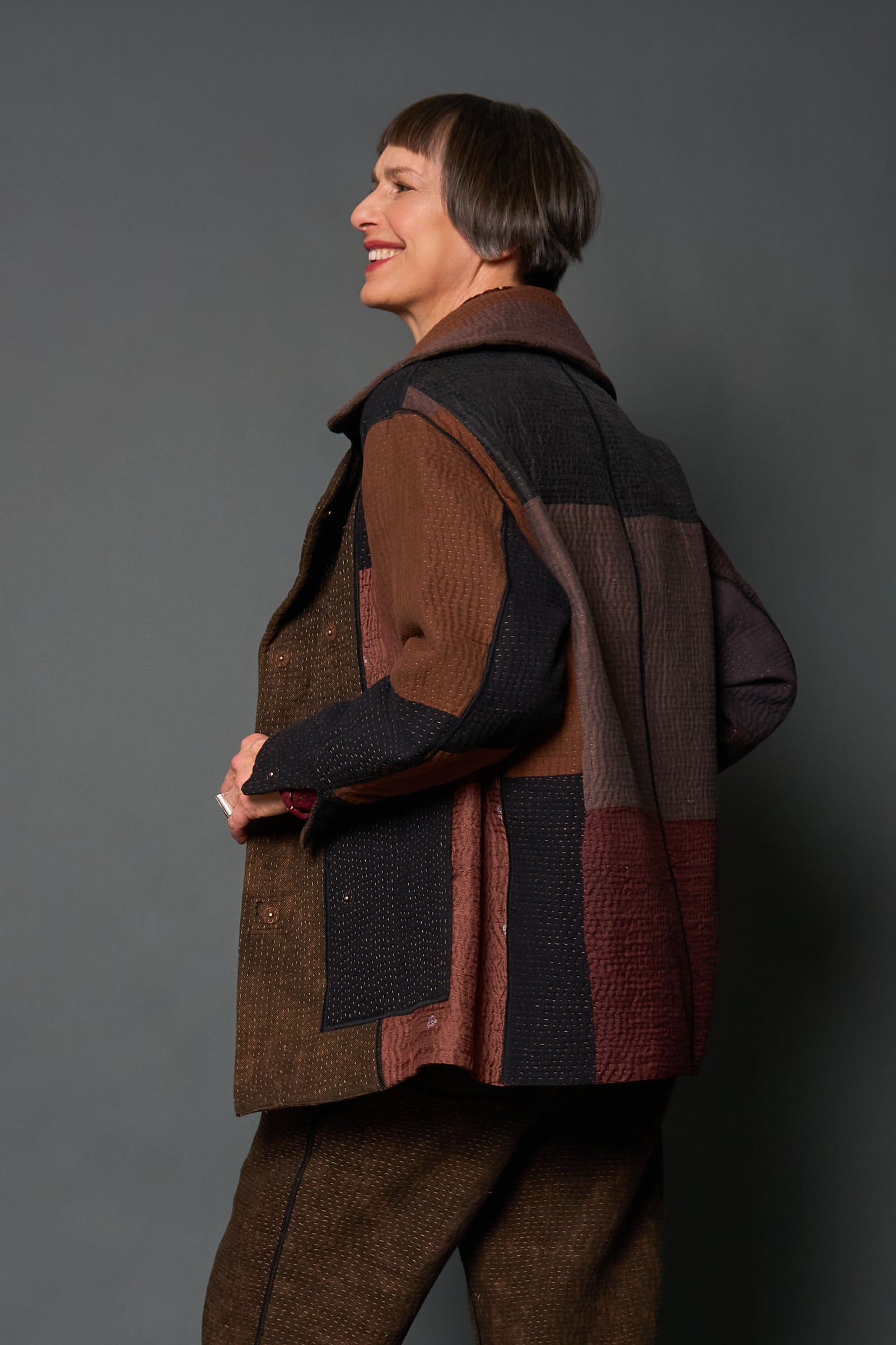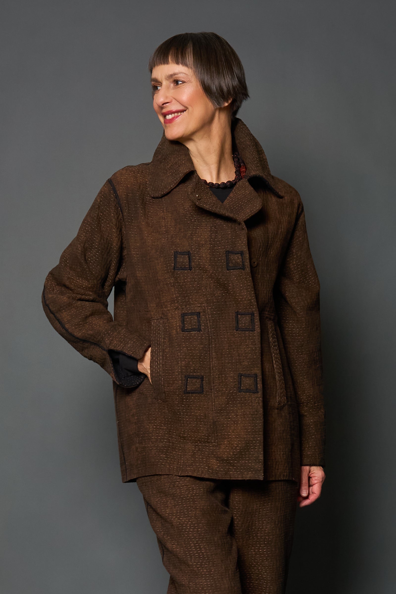 DENIM SUN-DYE KANTHA PEA COAT - ds3349-brn -