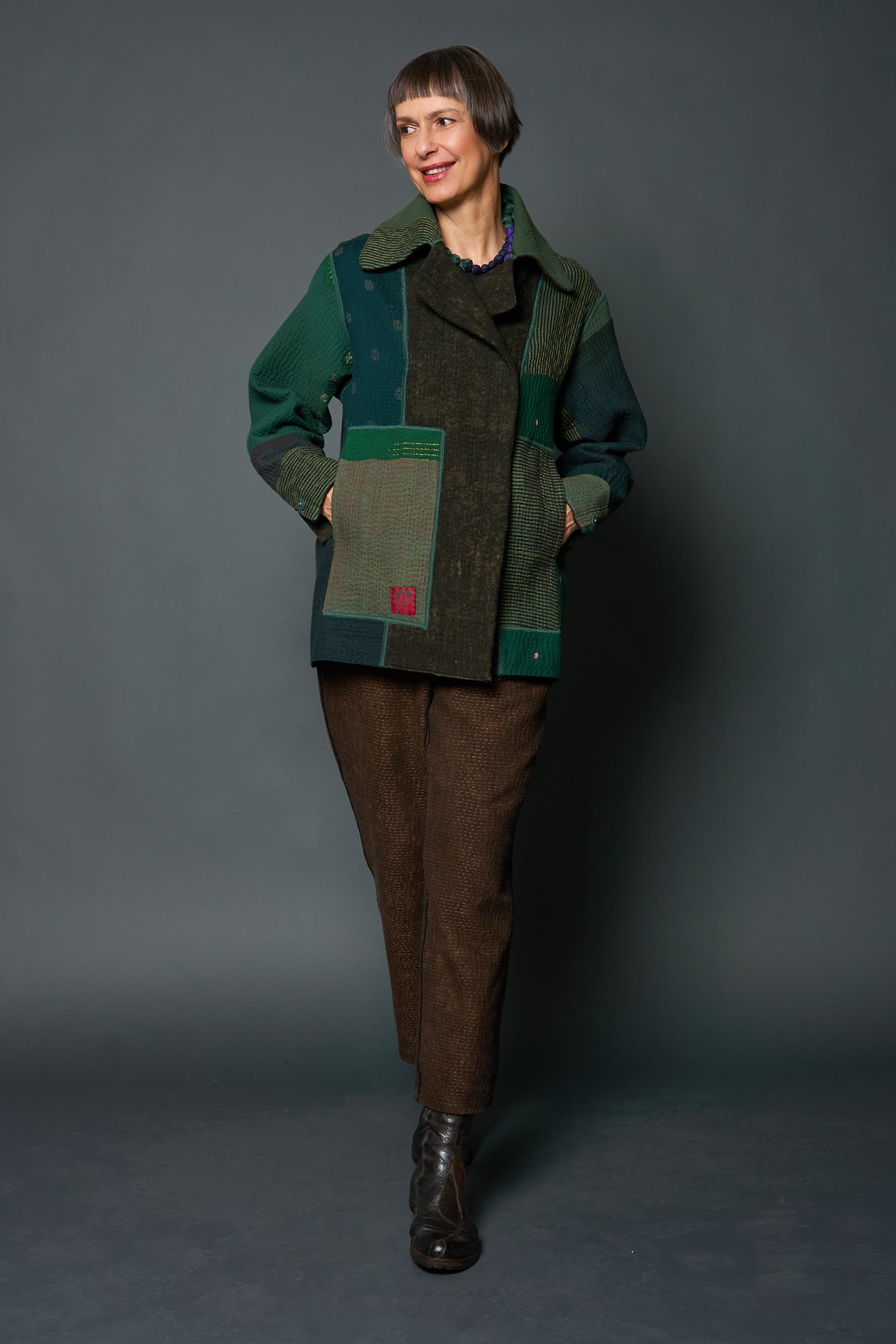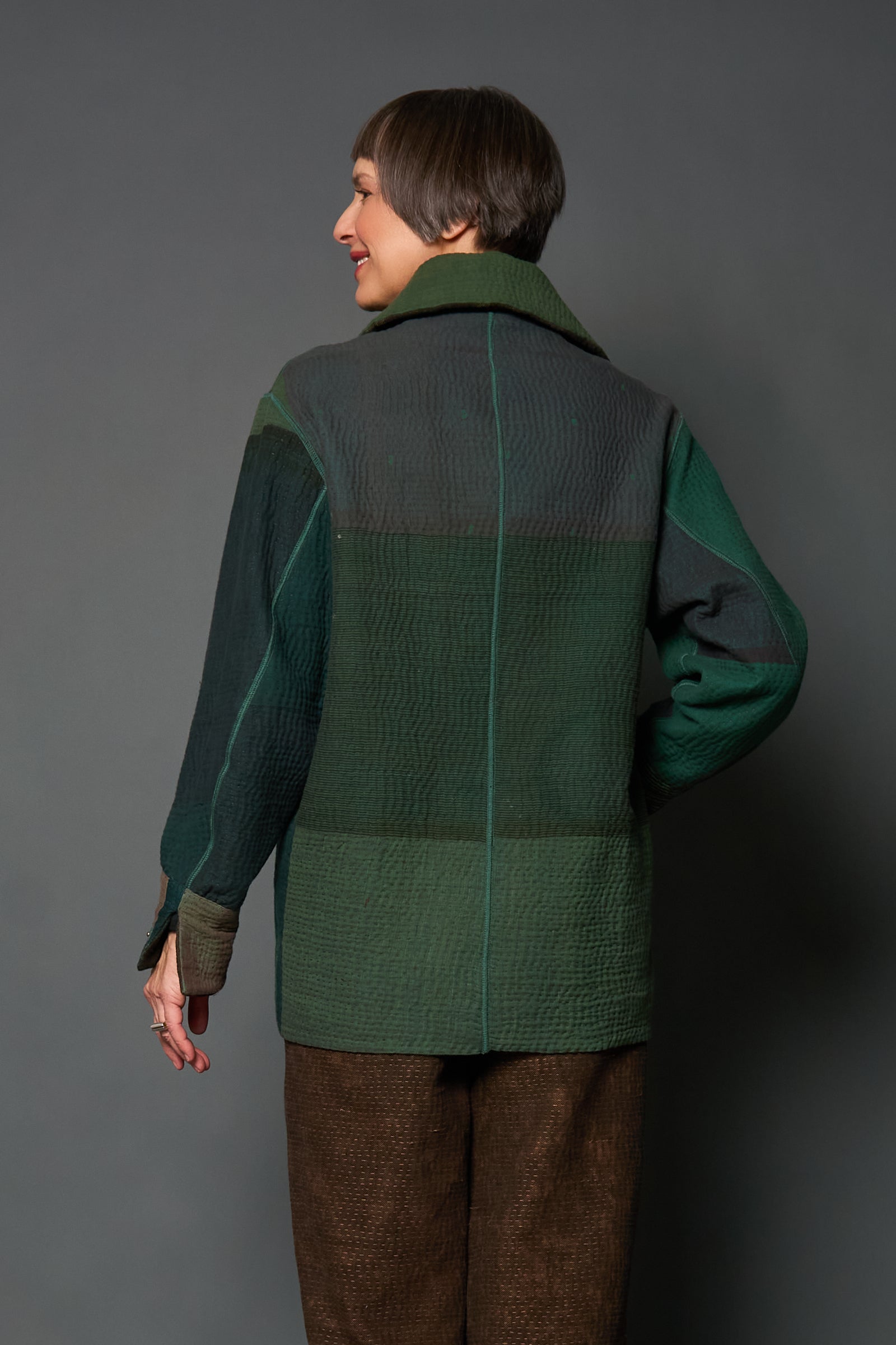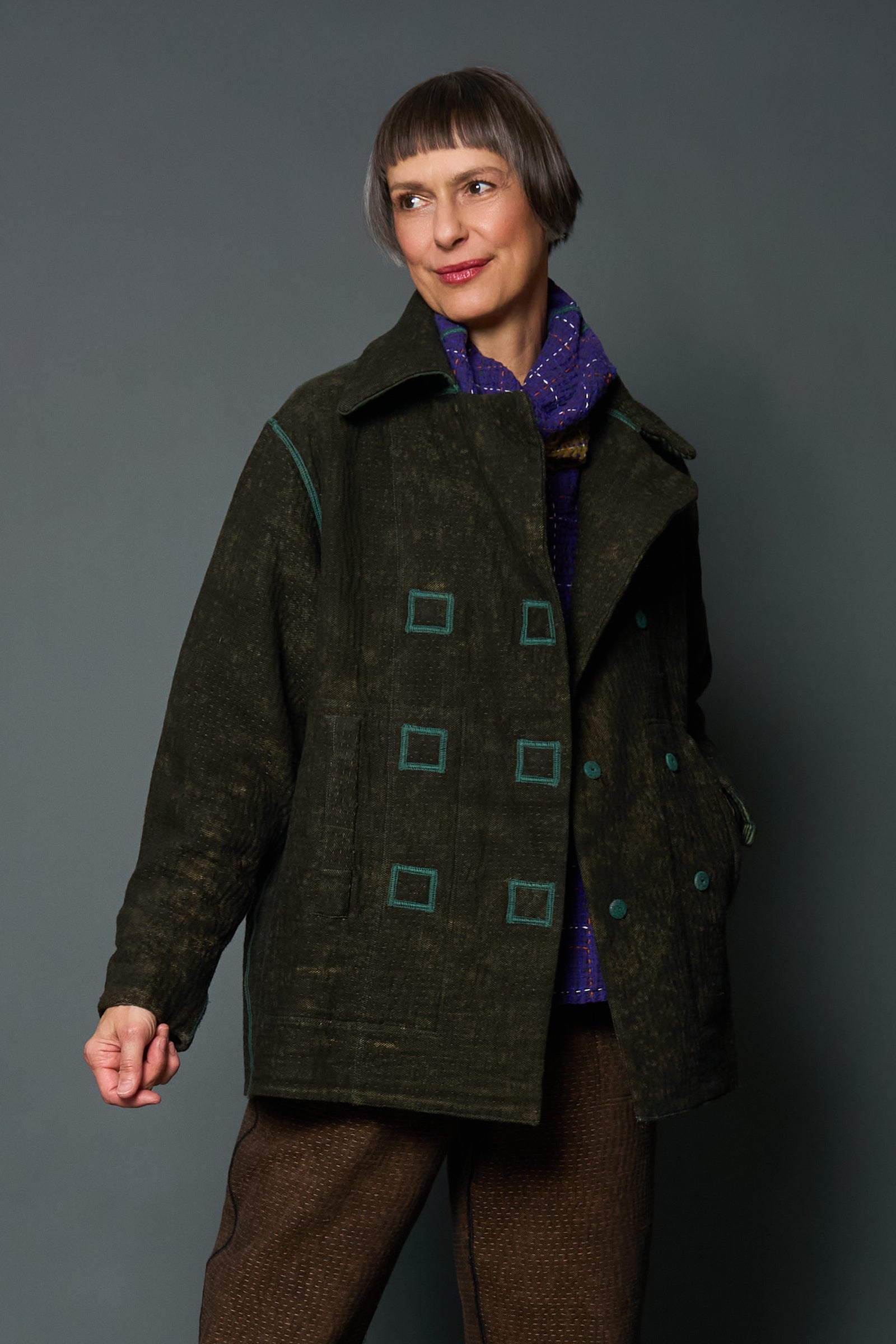 DENIM SUN-DYE KANTHA PEA COAT - ds3349-grn -