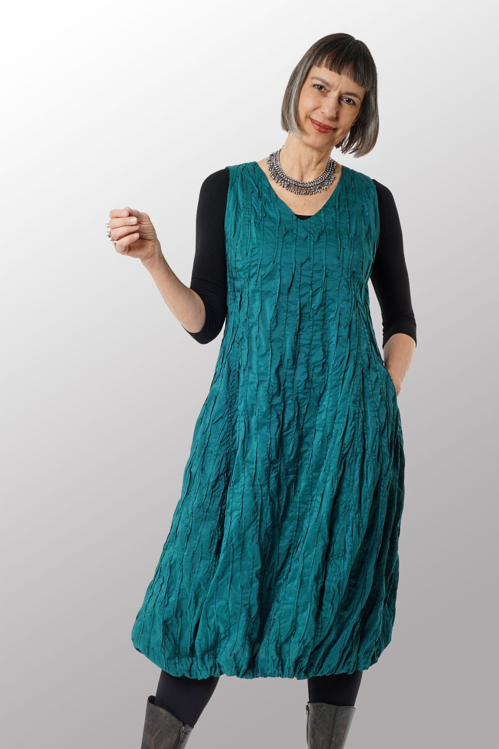 DYED COTTON SILK HEAVY VOILE RANDOM TUCK V-NECK BALLOON DRESS - dr1451-grn -