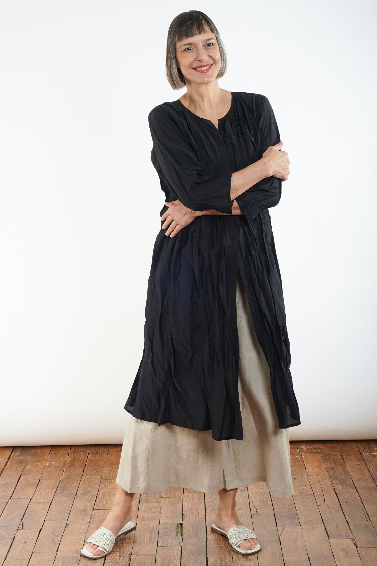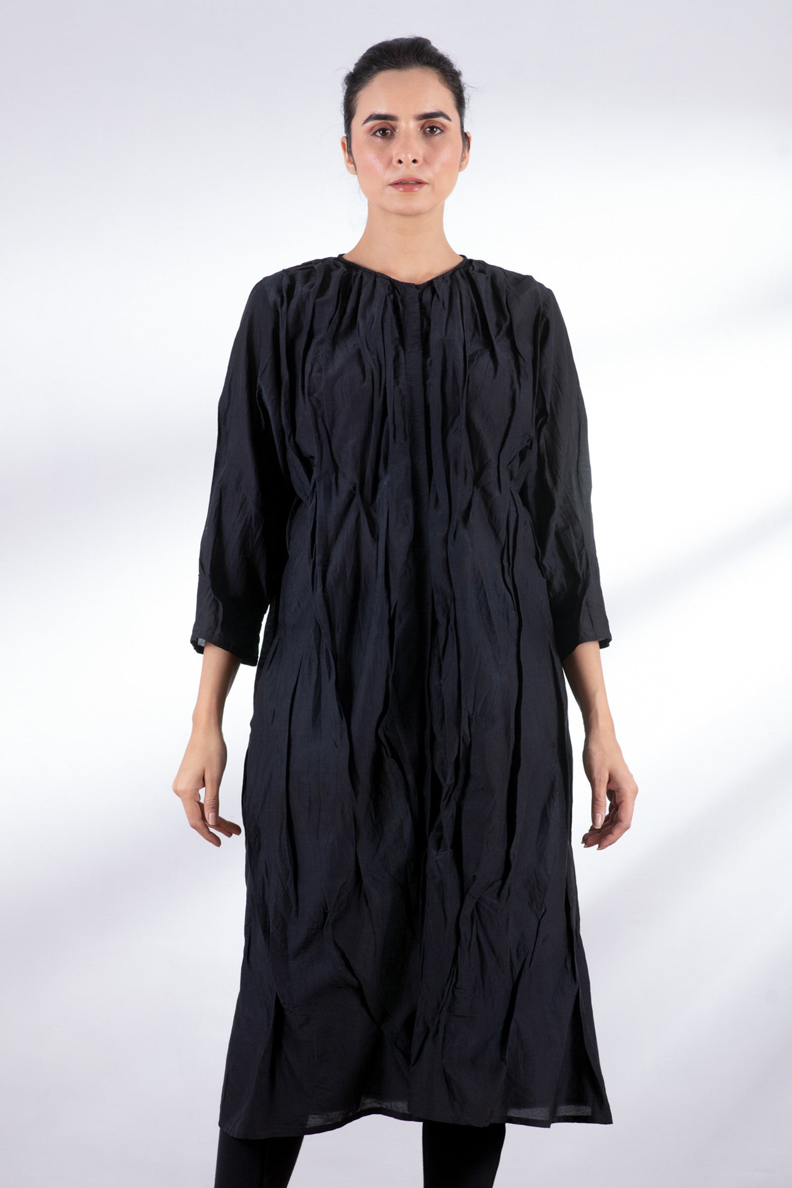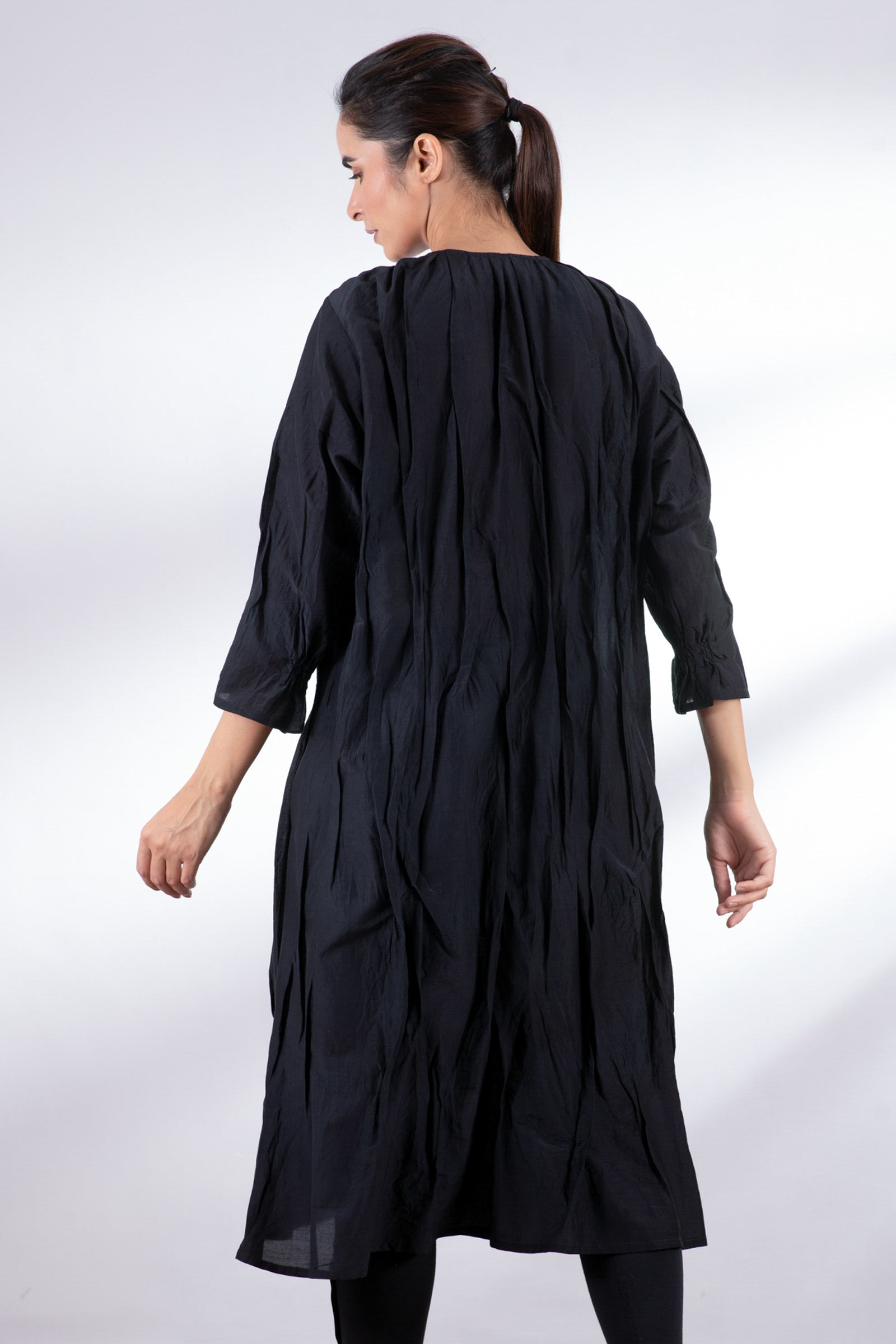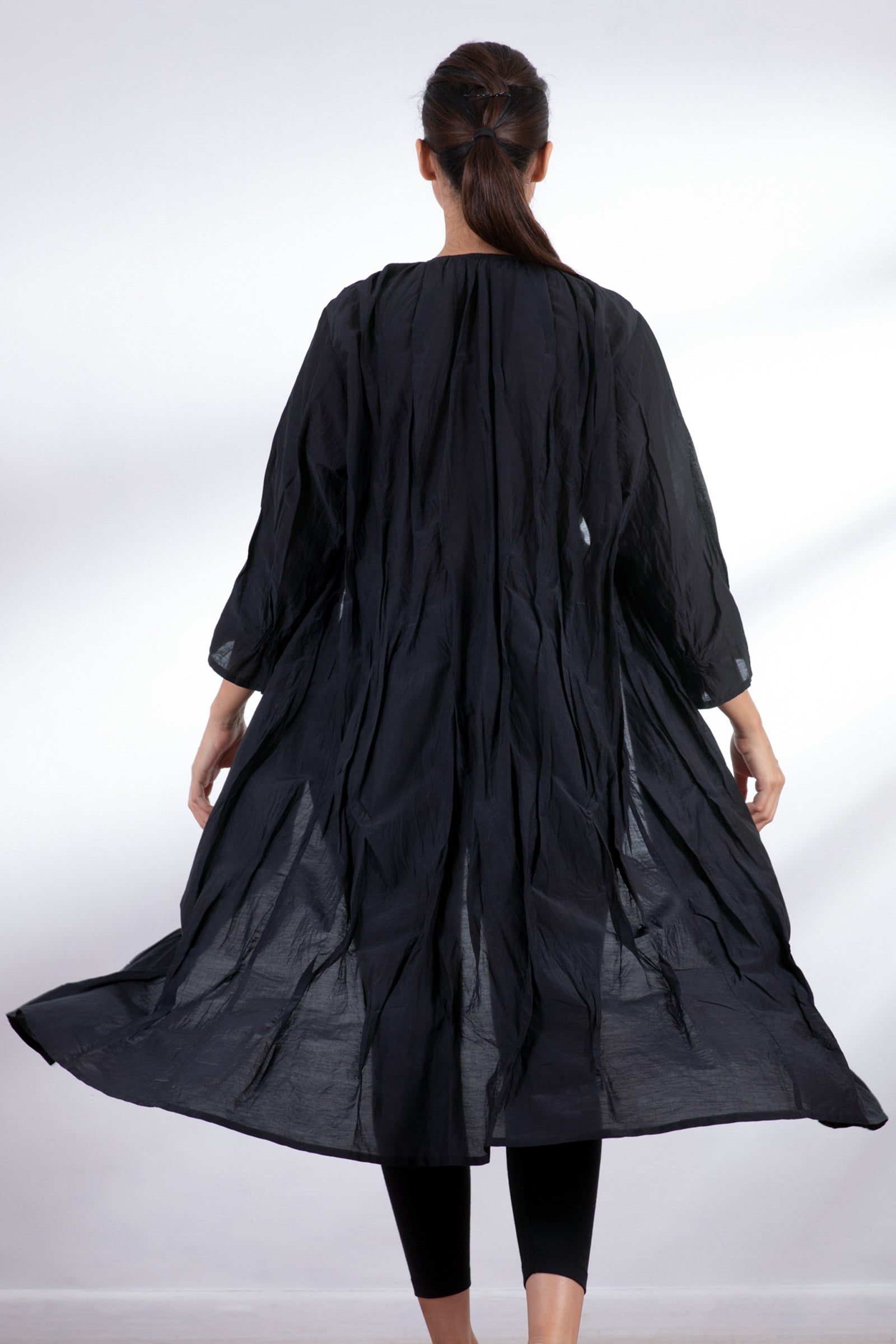 DYED COTTON SILK VOILE WAVY TUCK CROPPED SLV. DRESS - dc1434-blk -
