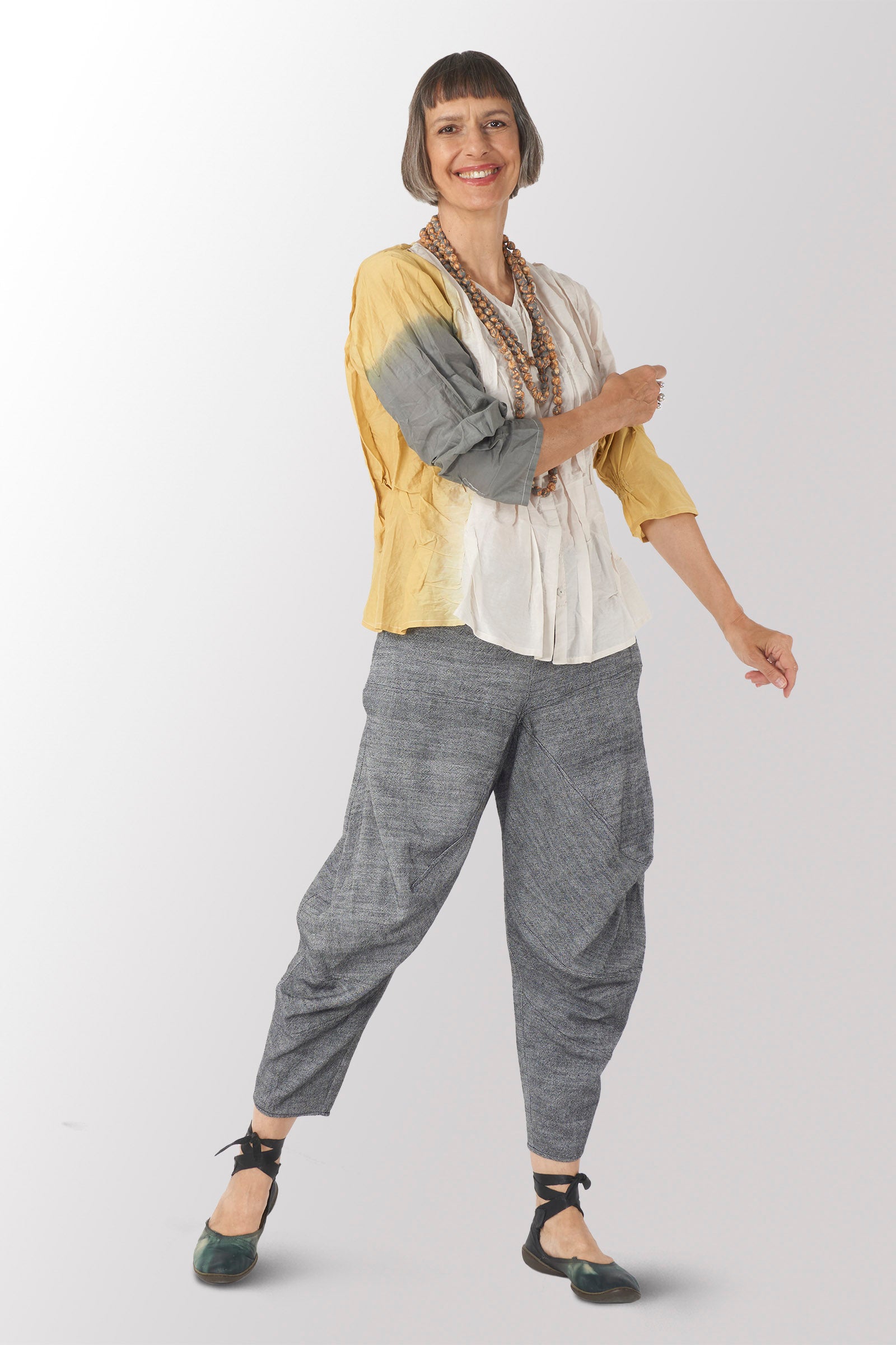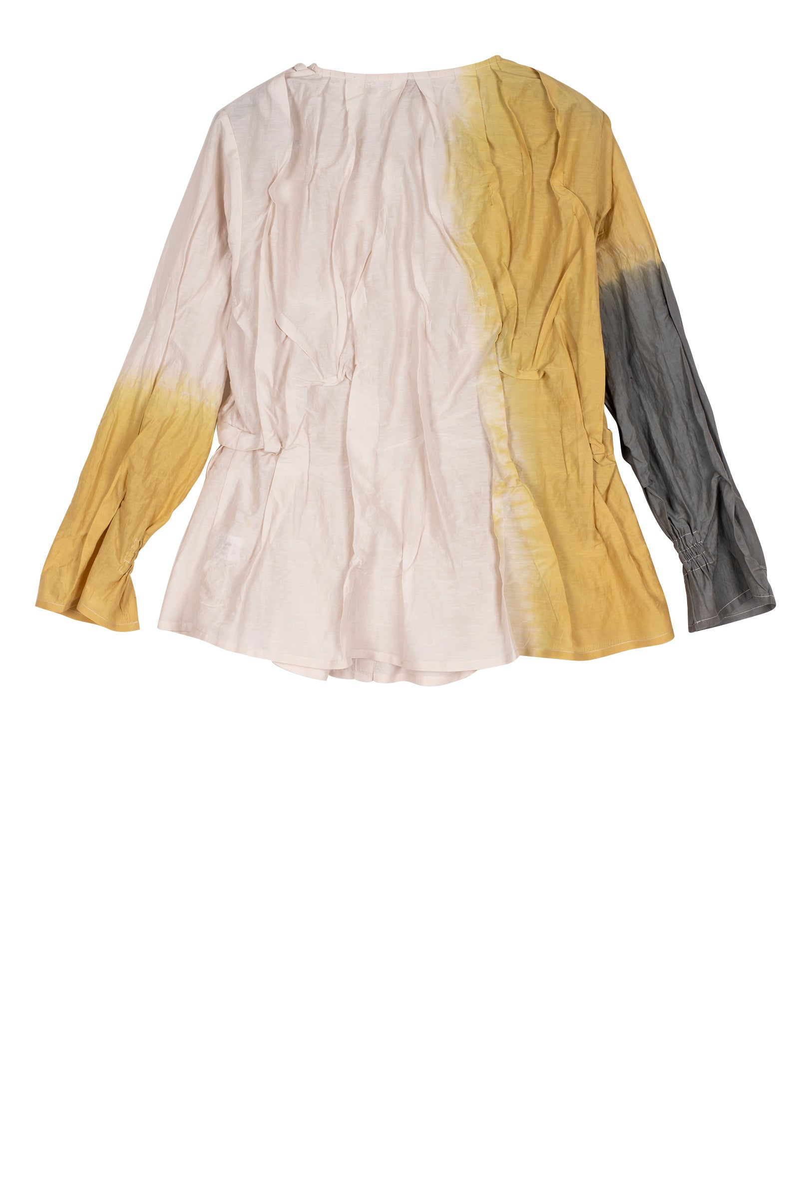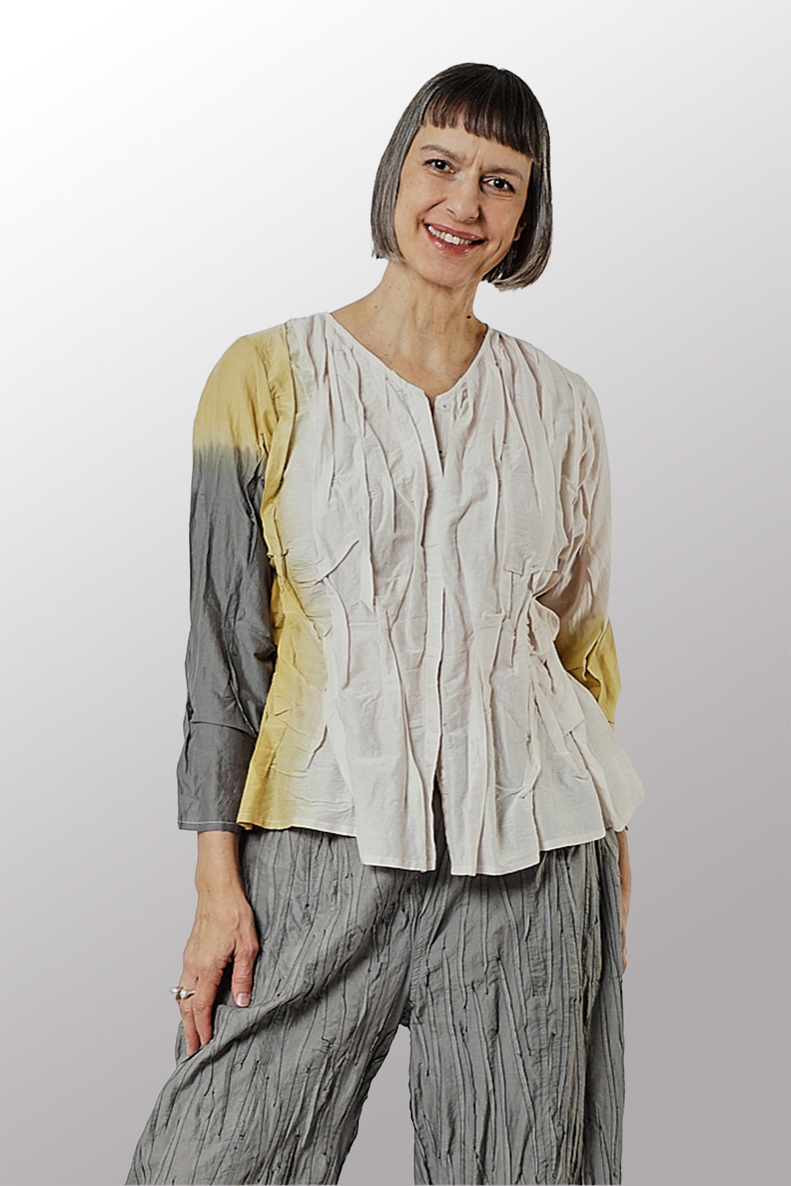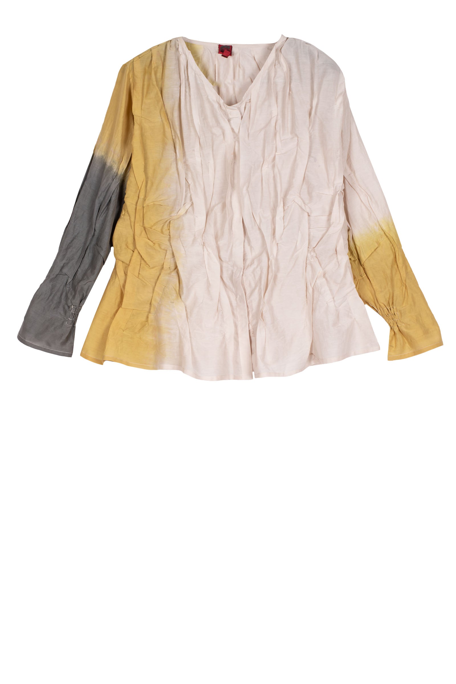DYED COTTON SILK VOILE WAVY V-NECK TUCKED BLOUSE - dc1542-oiv -