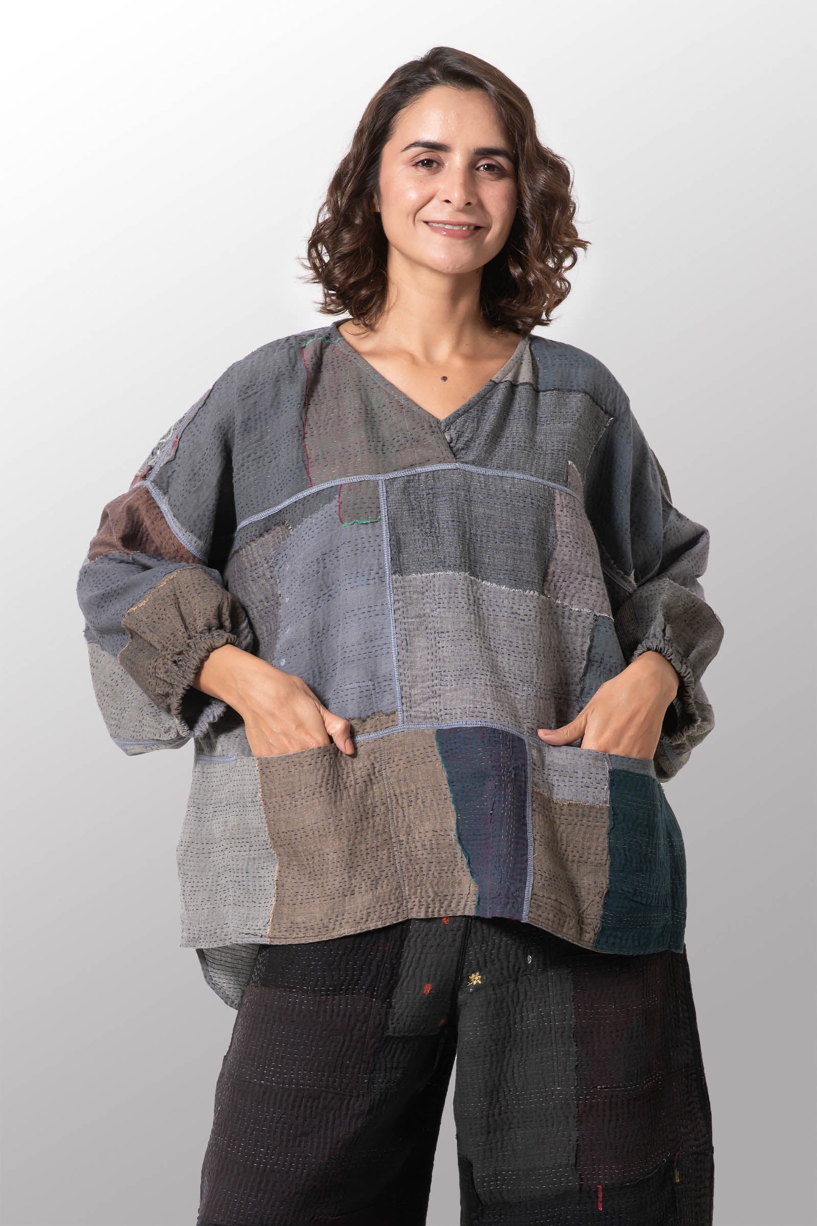 FRAYED PATCH KANTHA BLOCK TOP - fi2559-ntl -