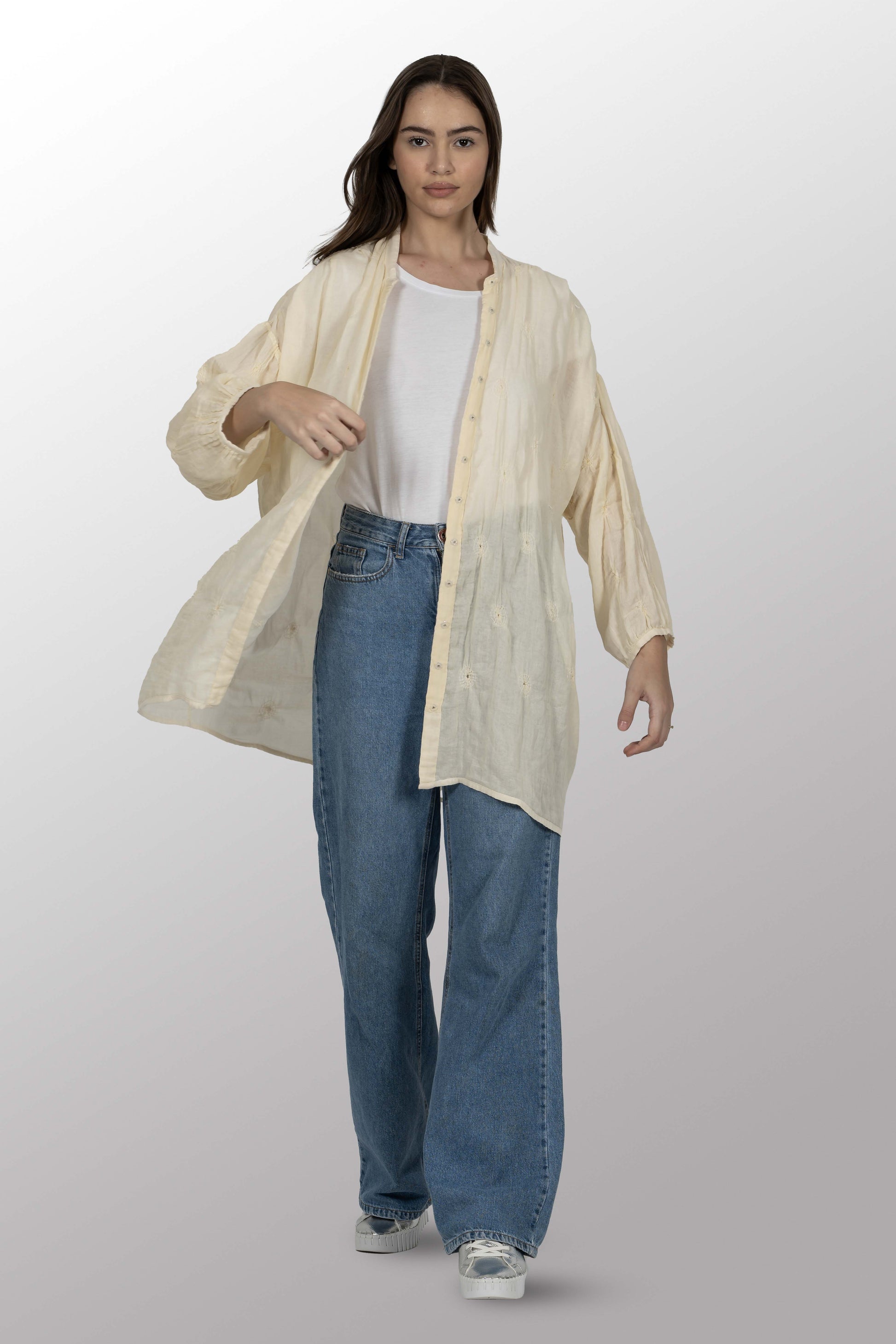 GAUZE SHIBORI GARMENT KANTHA BAND COLLAR OVERSIZED SHIRT - bl-gg2587-ivy -
