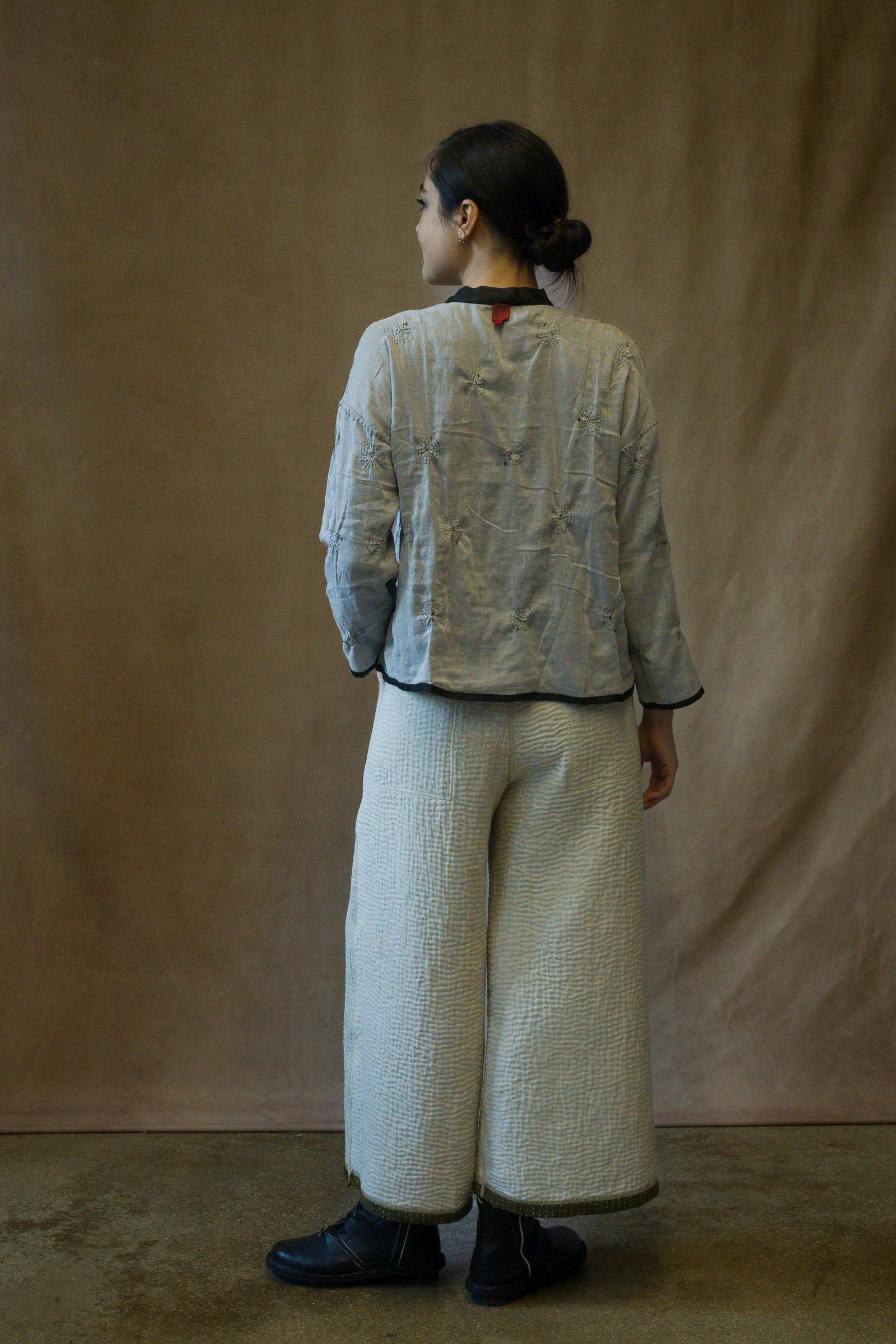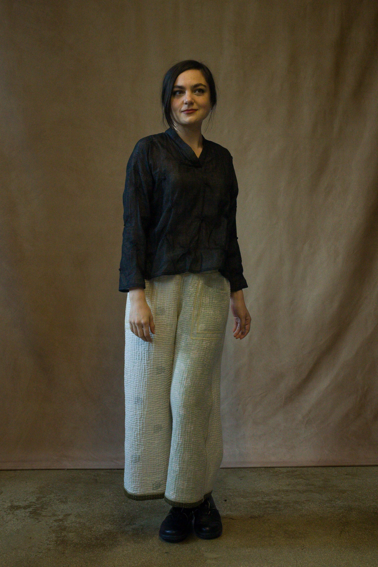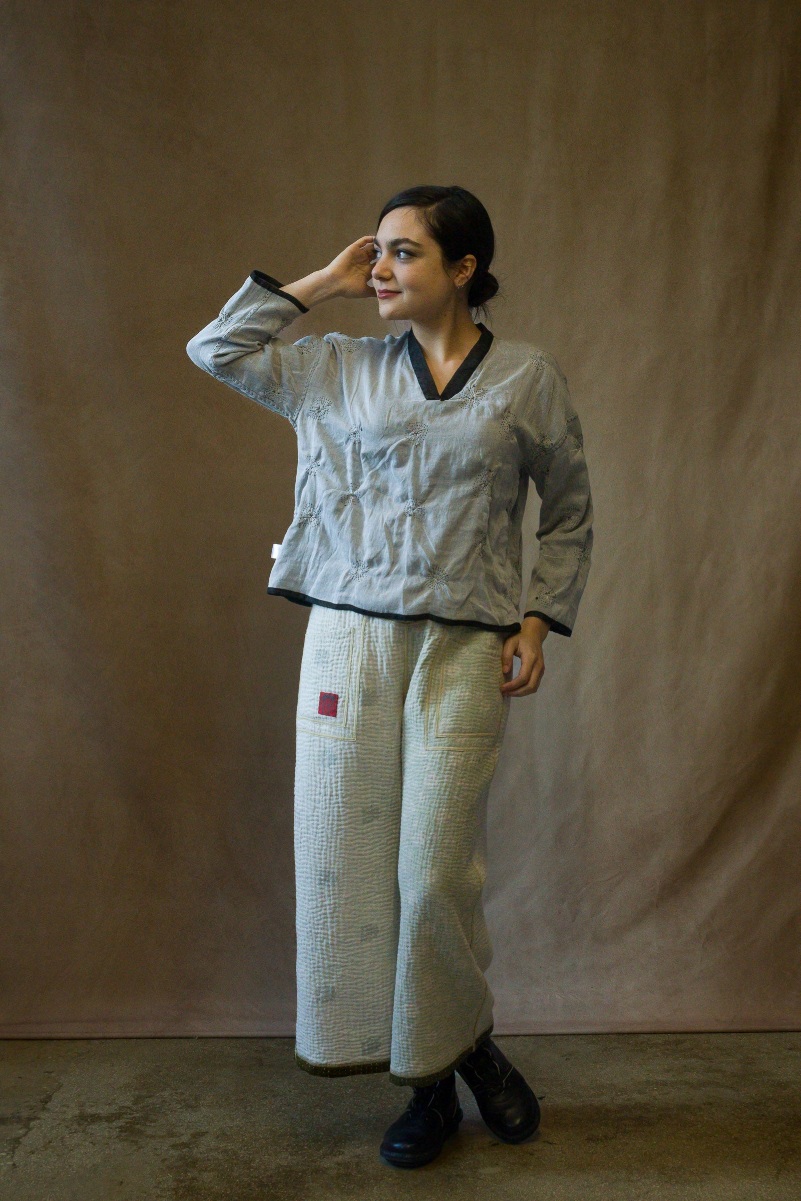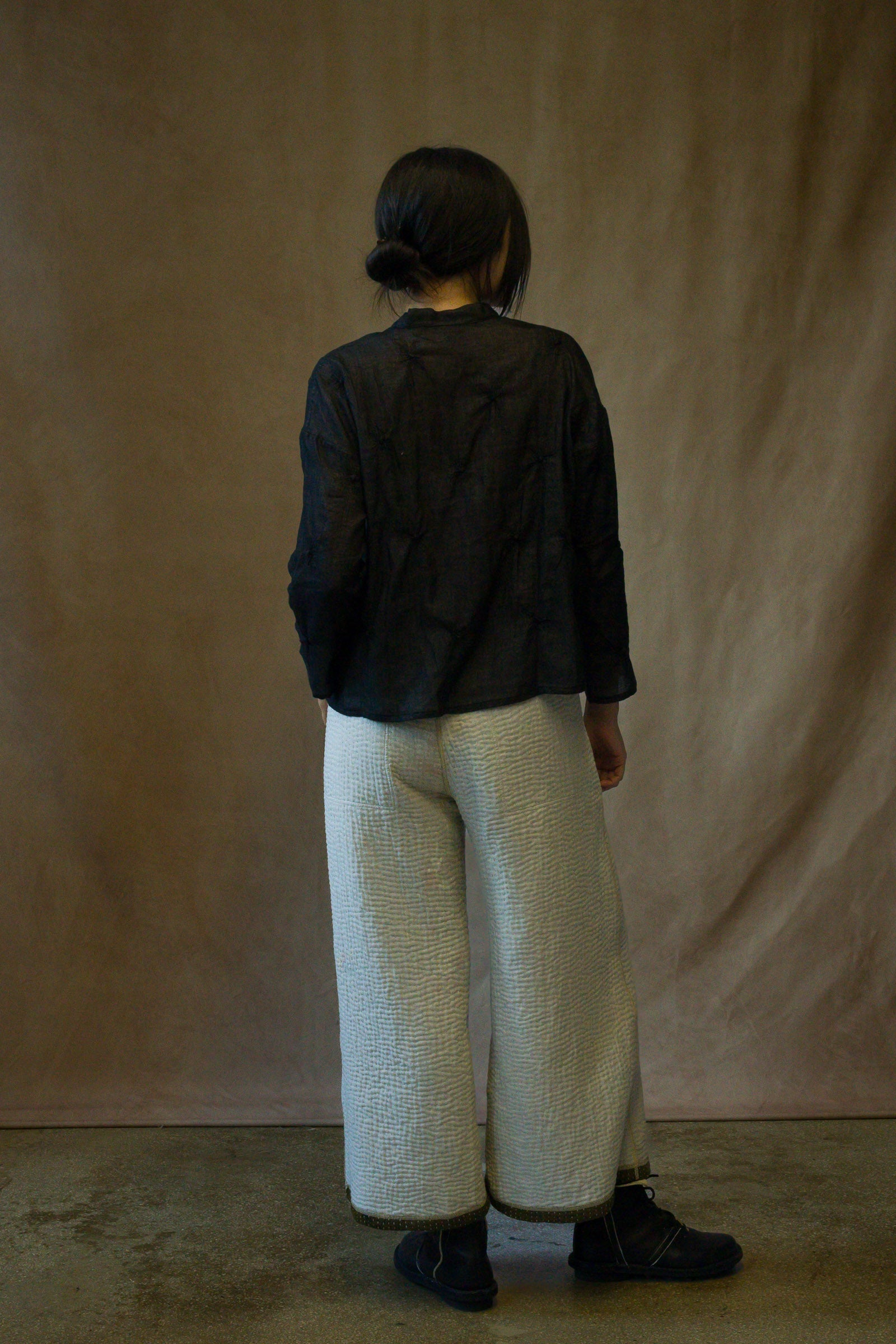 GAUZE SHIBORI GARMENT KANTHA SPIRAL KANTHA V-NECK LONG SLV. TOP - bl-gg2593-blk -