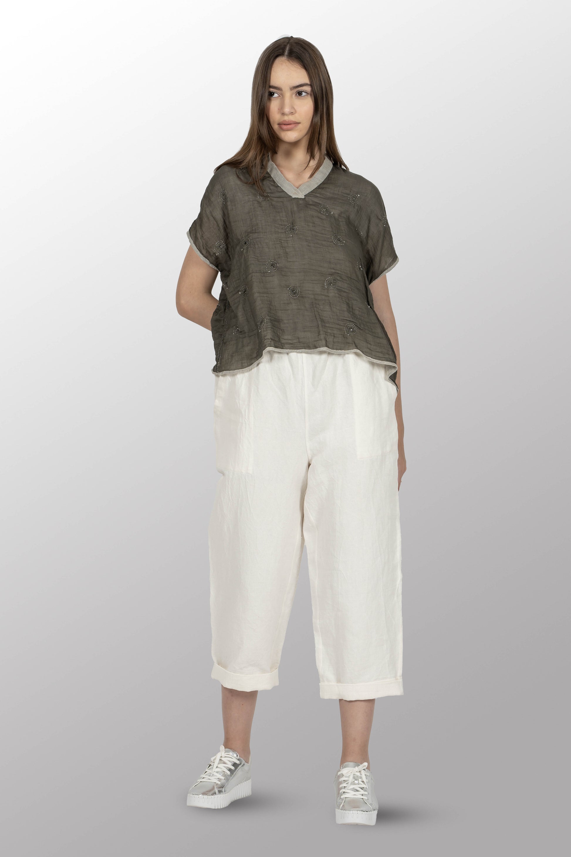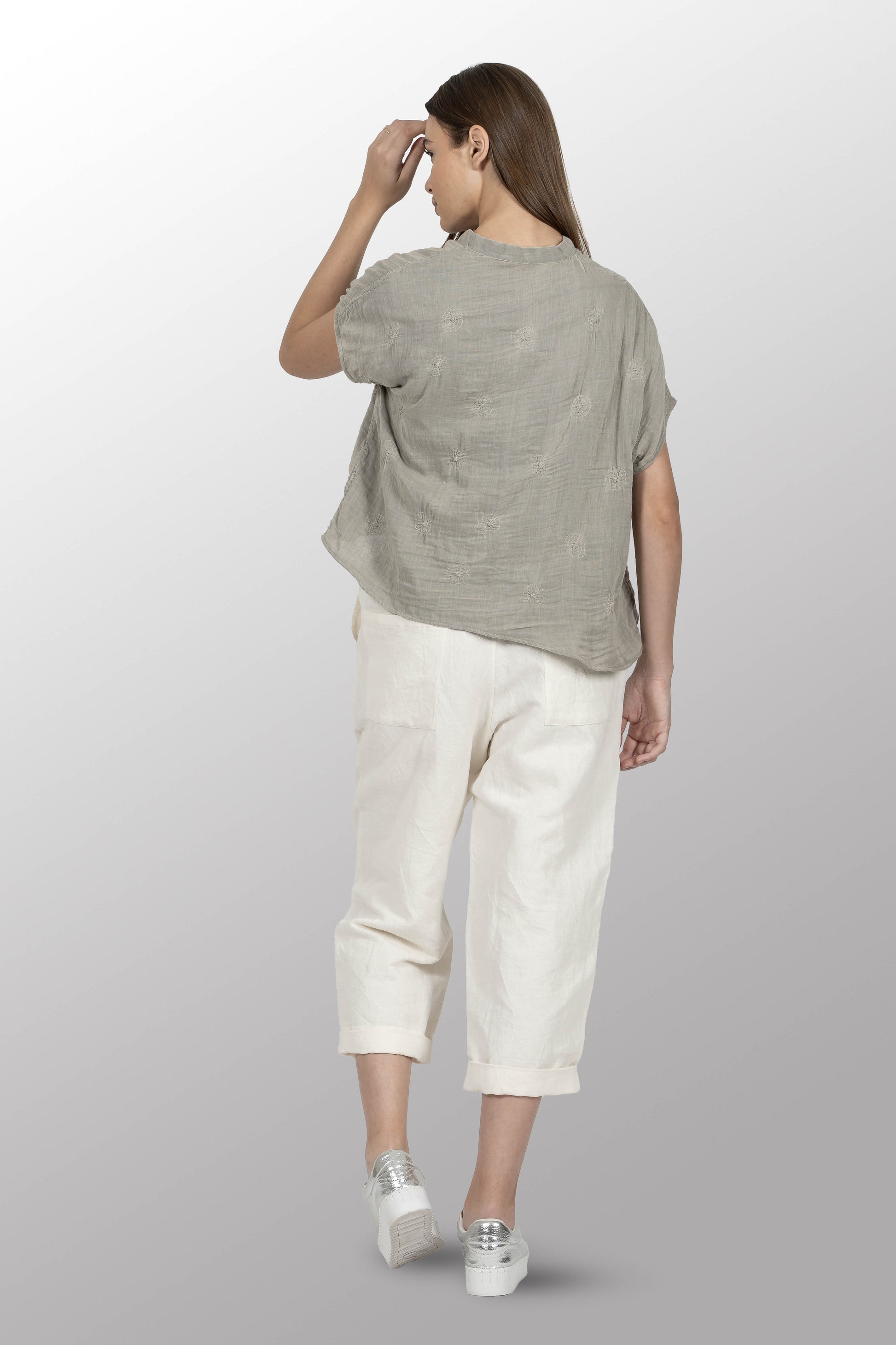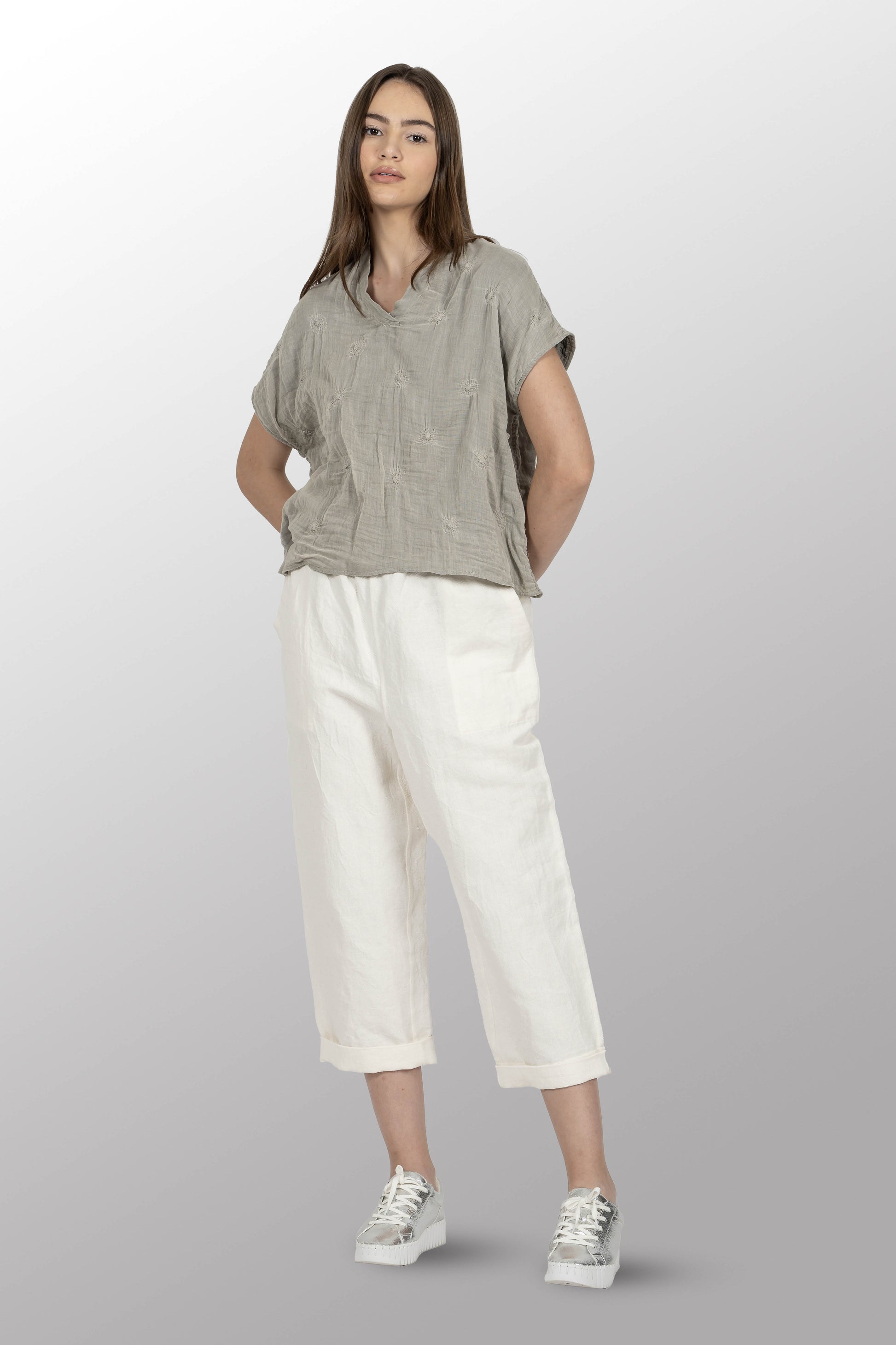 GAUZE SHIBORI GARMENT KANTHA V-NECK BINDING COLLAR TOP - bl-gg2589-gry -