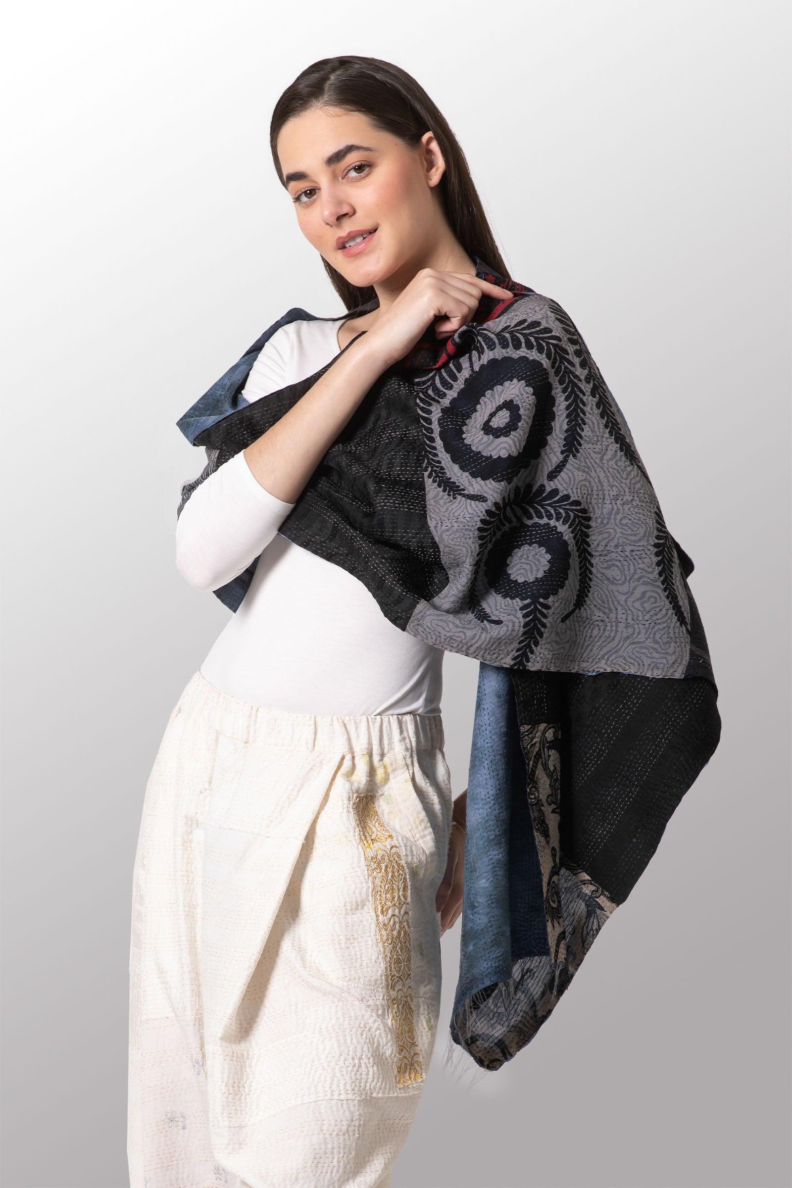 GEORGETTE JACQUARD VINTAGE SILK PATCH KANTHA SCARF STANDARD - gj2801-blk -