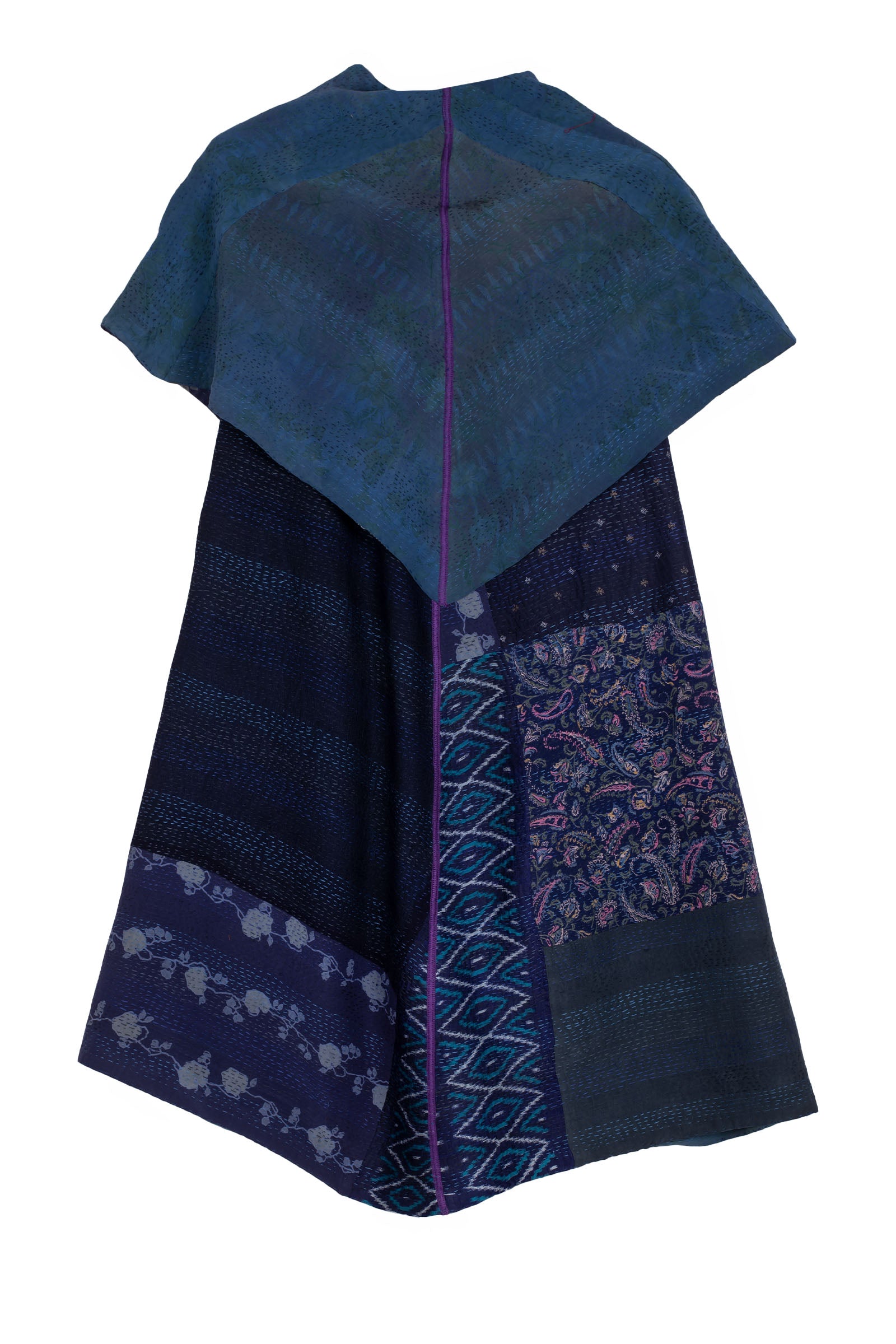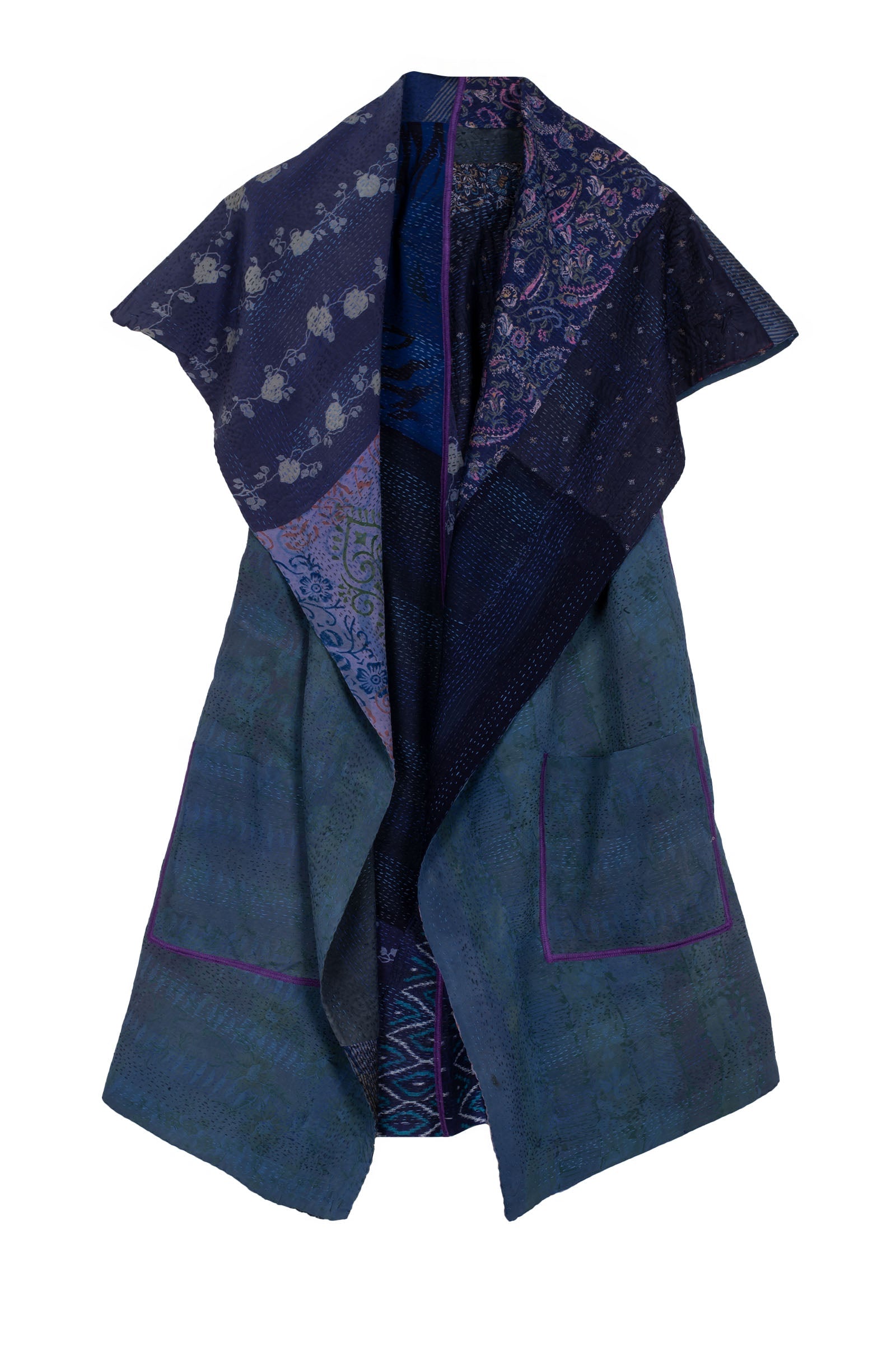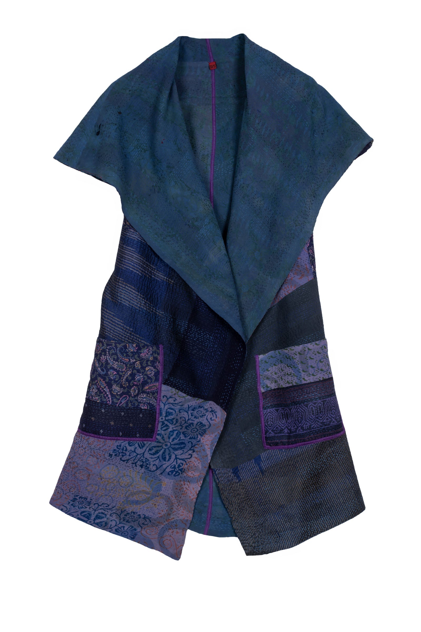 GEORGETTE VINTAGE SILK PATCH KANTHA CIRCULAR VEST - gs2201-nvy -