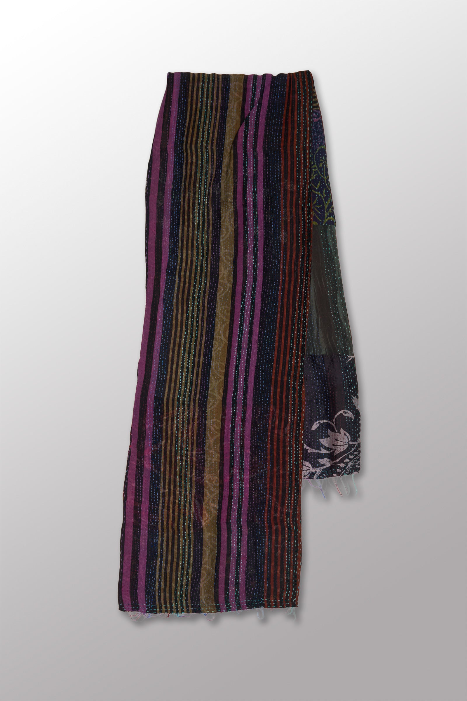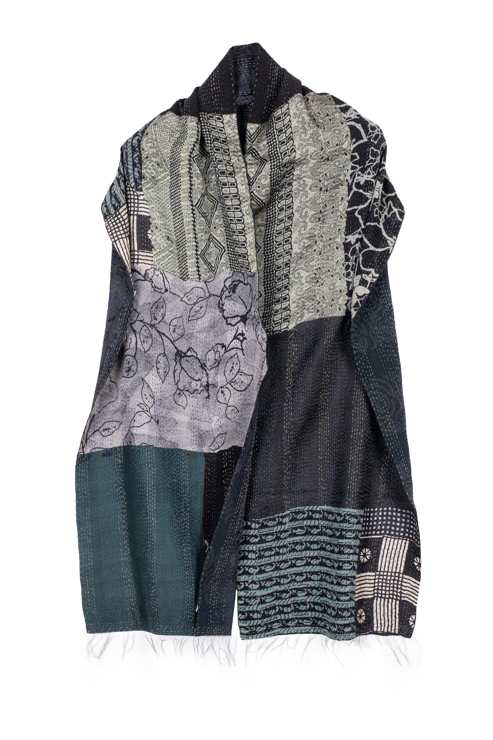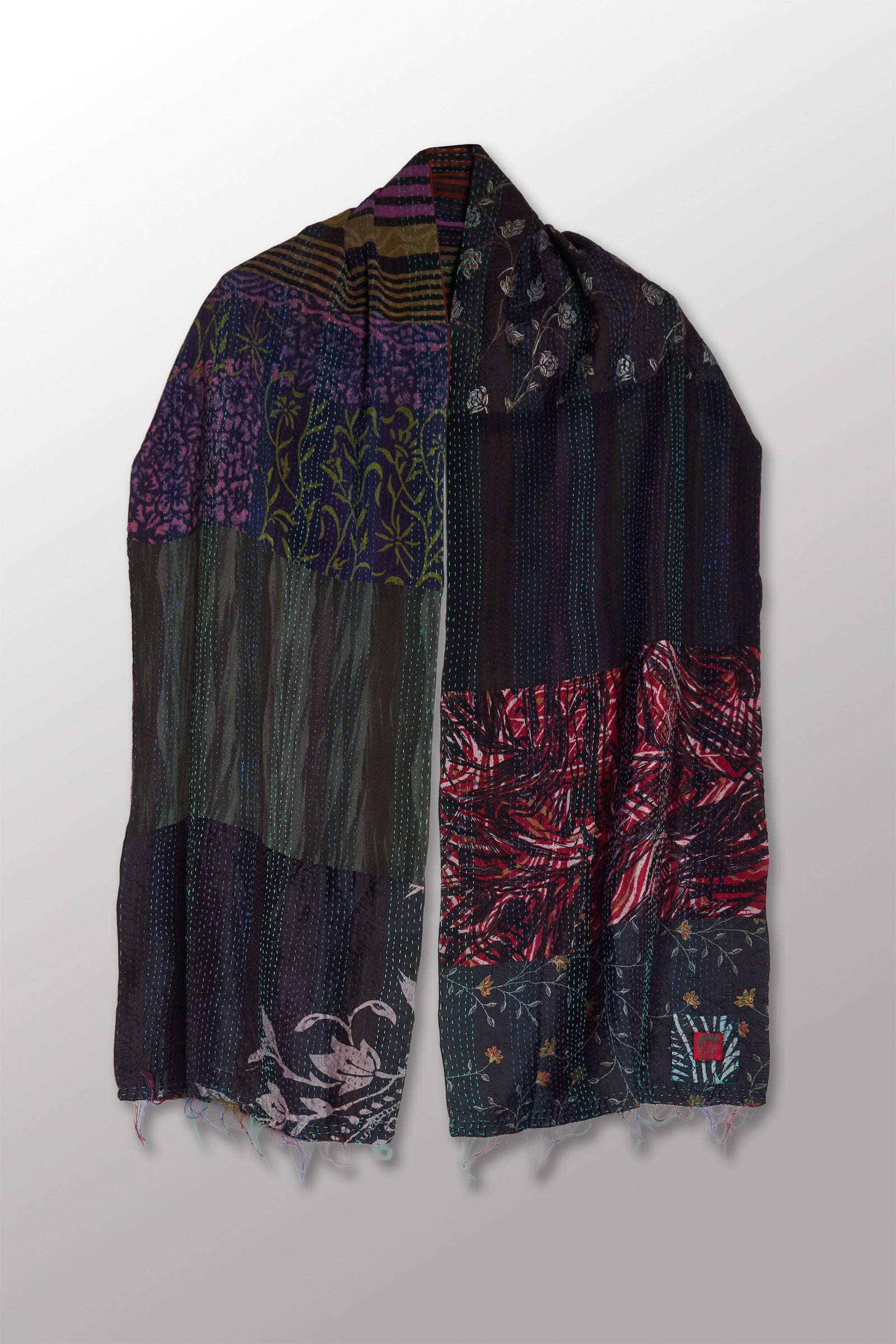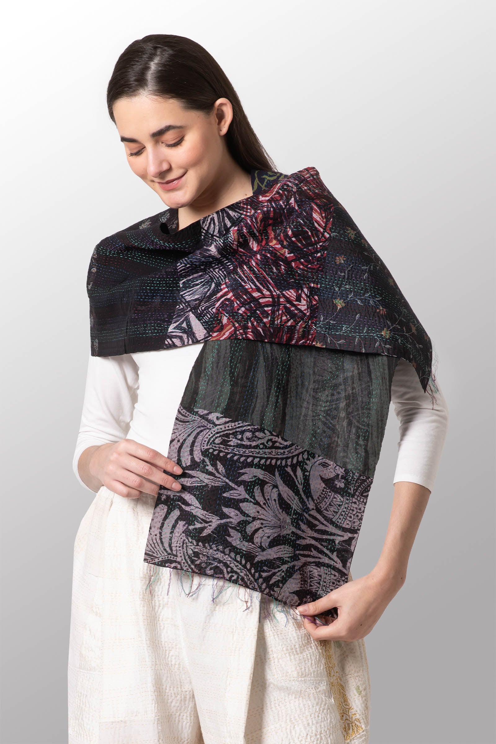 GEORGETTE VINTAGE SILK PATCH KANTHA SCARF SHORT - gs2805-blk -