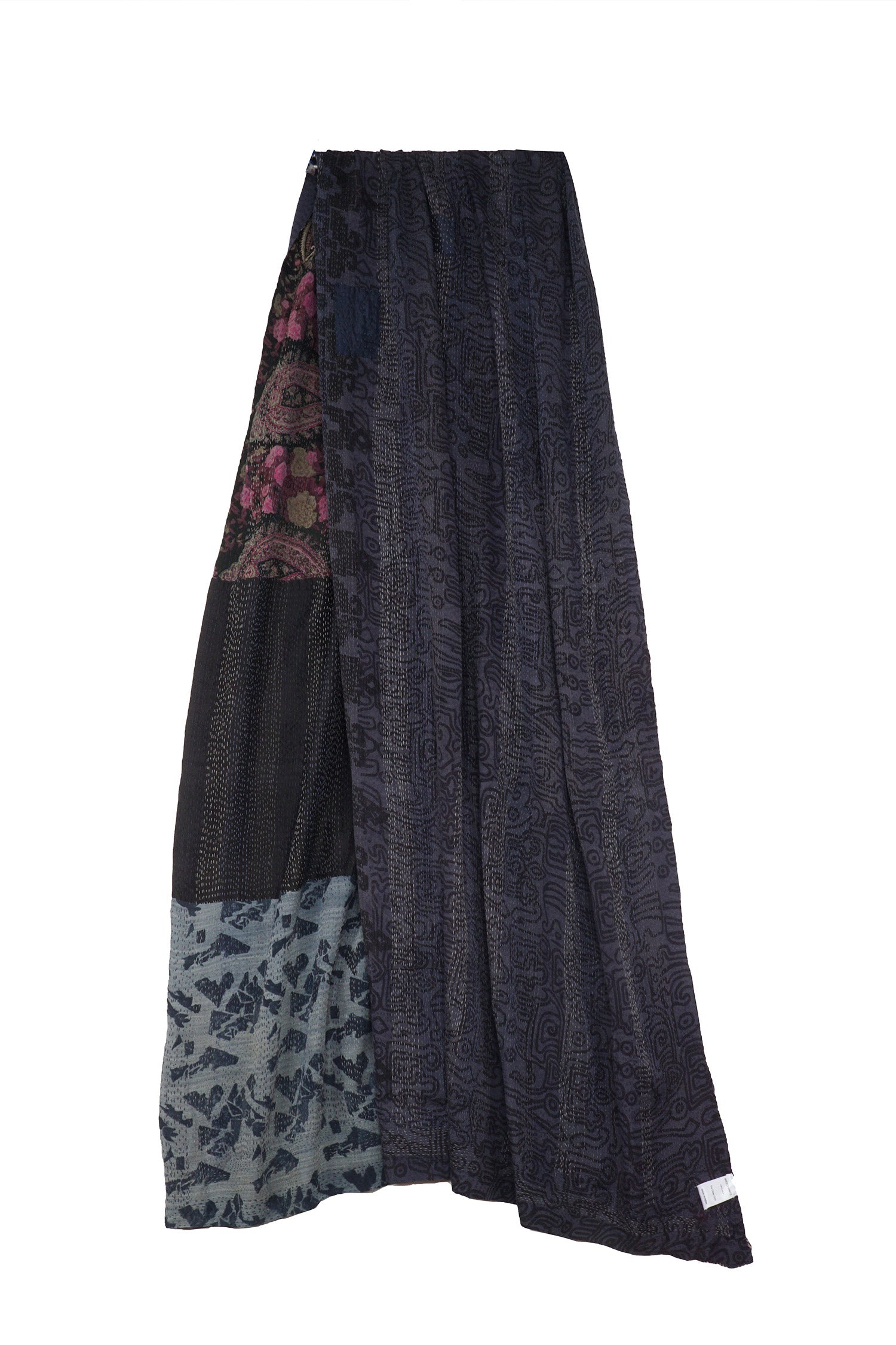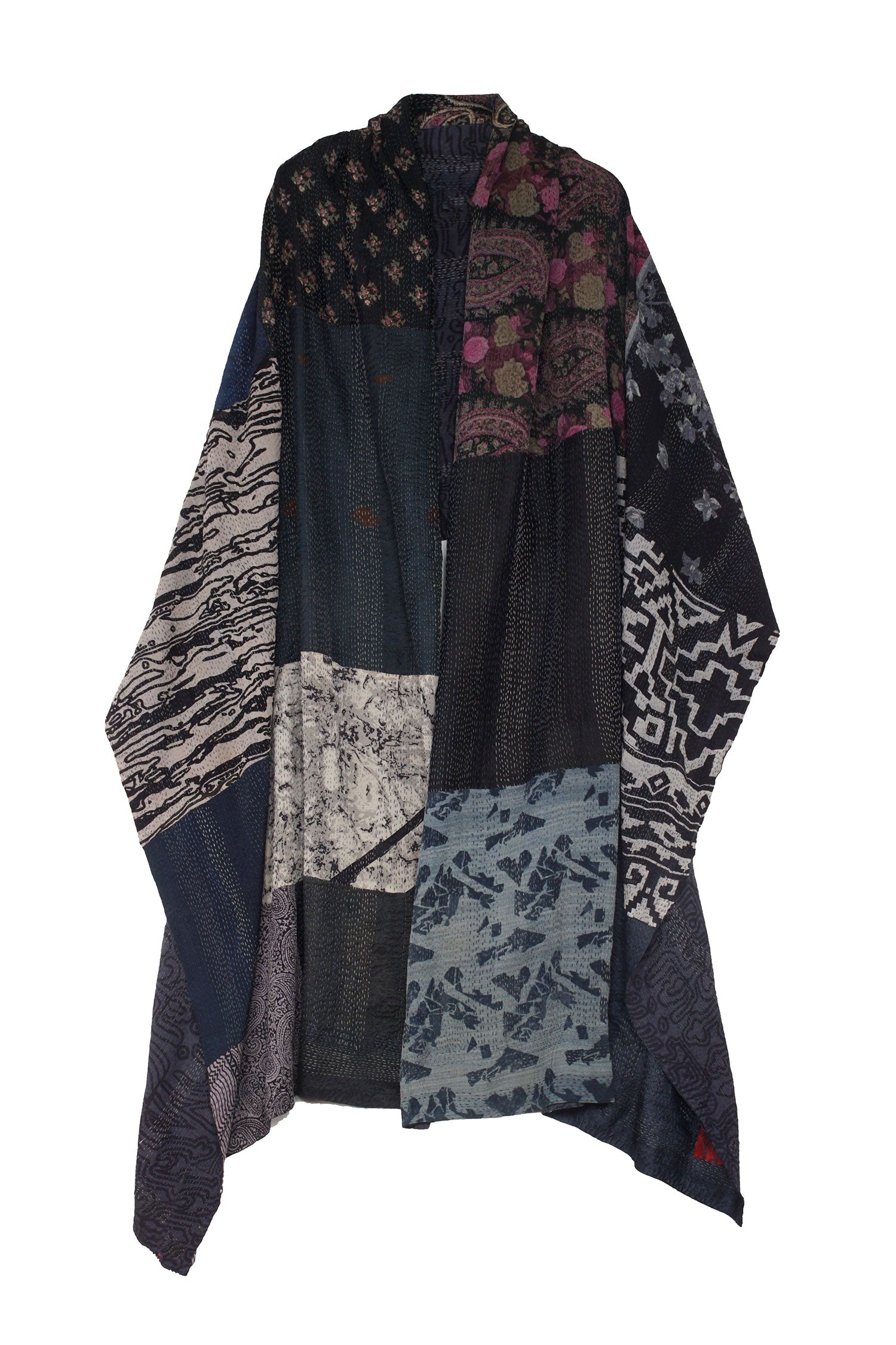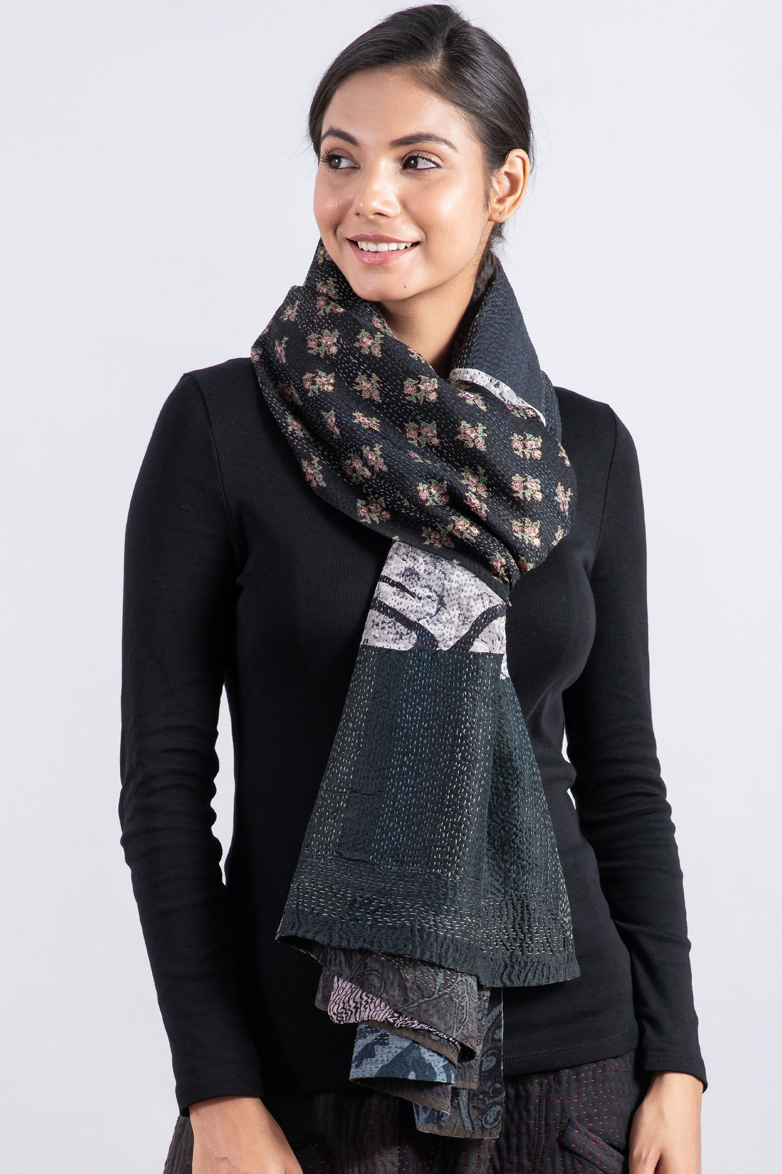 GEORGETTE VINTAGE SILK PATCH KANTHA SHAWL LARGE - gs2803-blk -