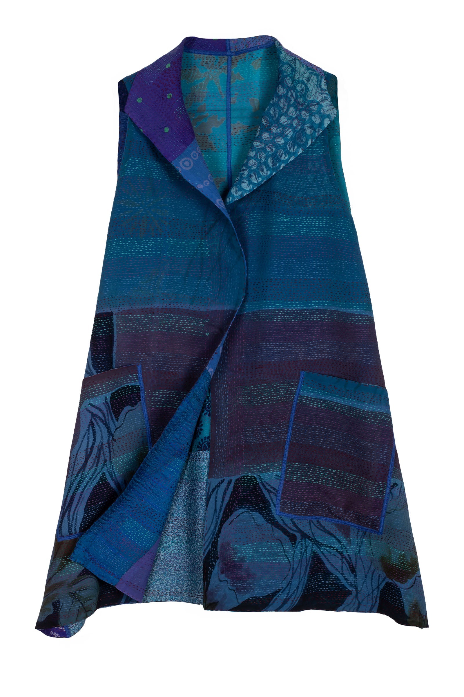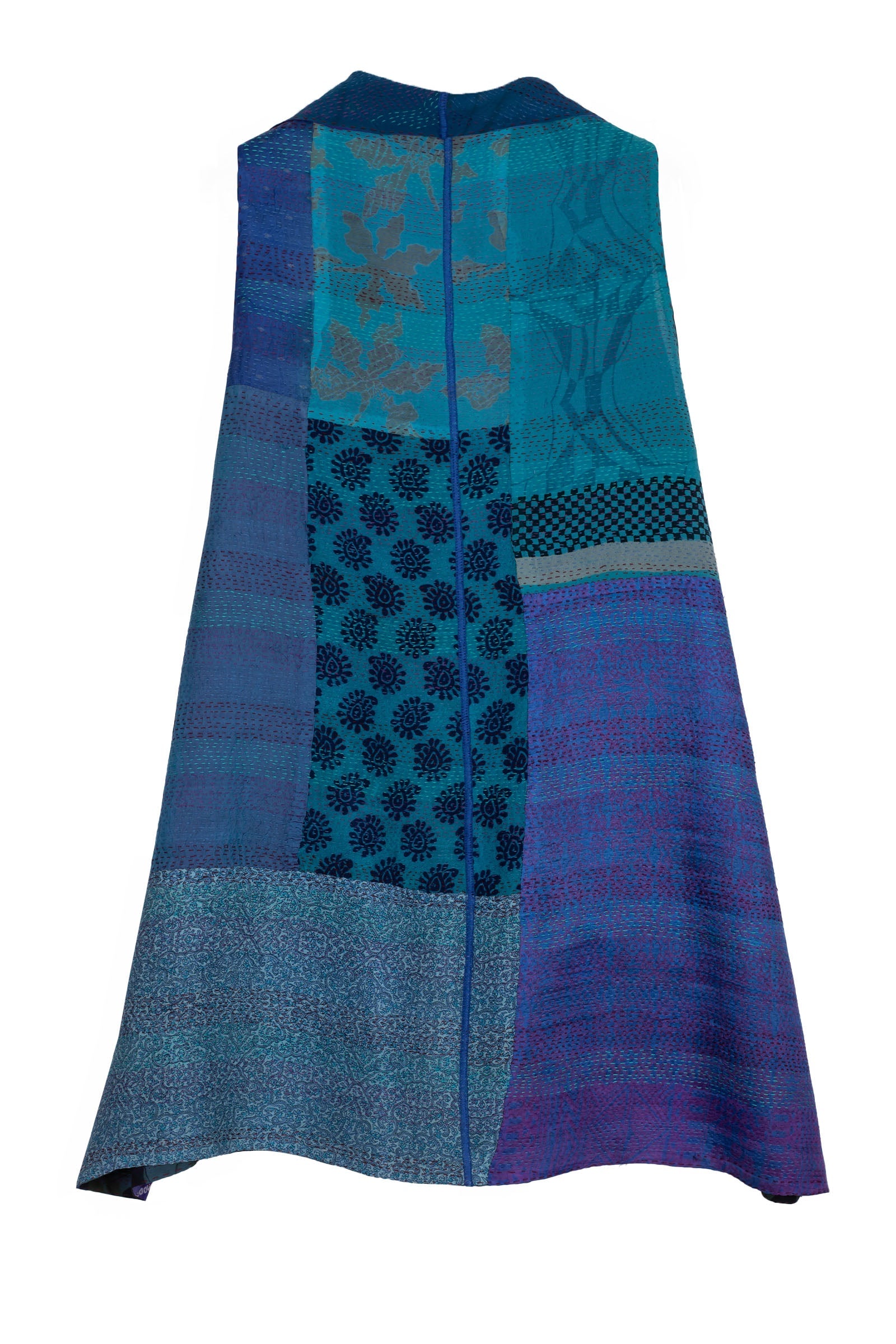 GEORGETTE VINTAGE SILK PATCH KANTHA WING COLLAR VEST - gs2207-blu -