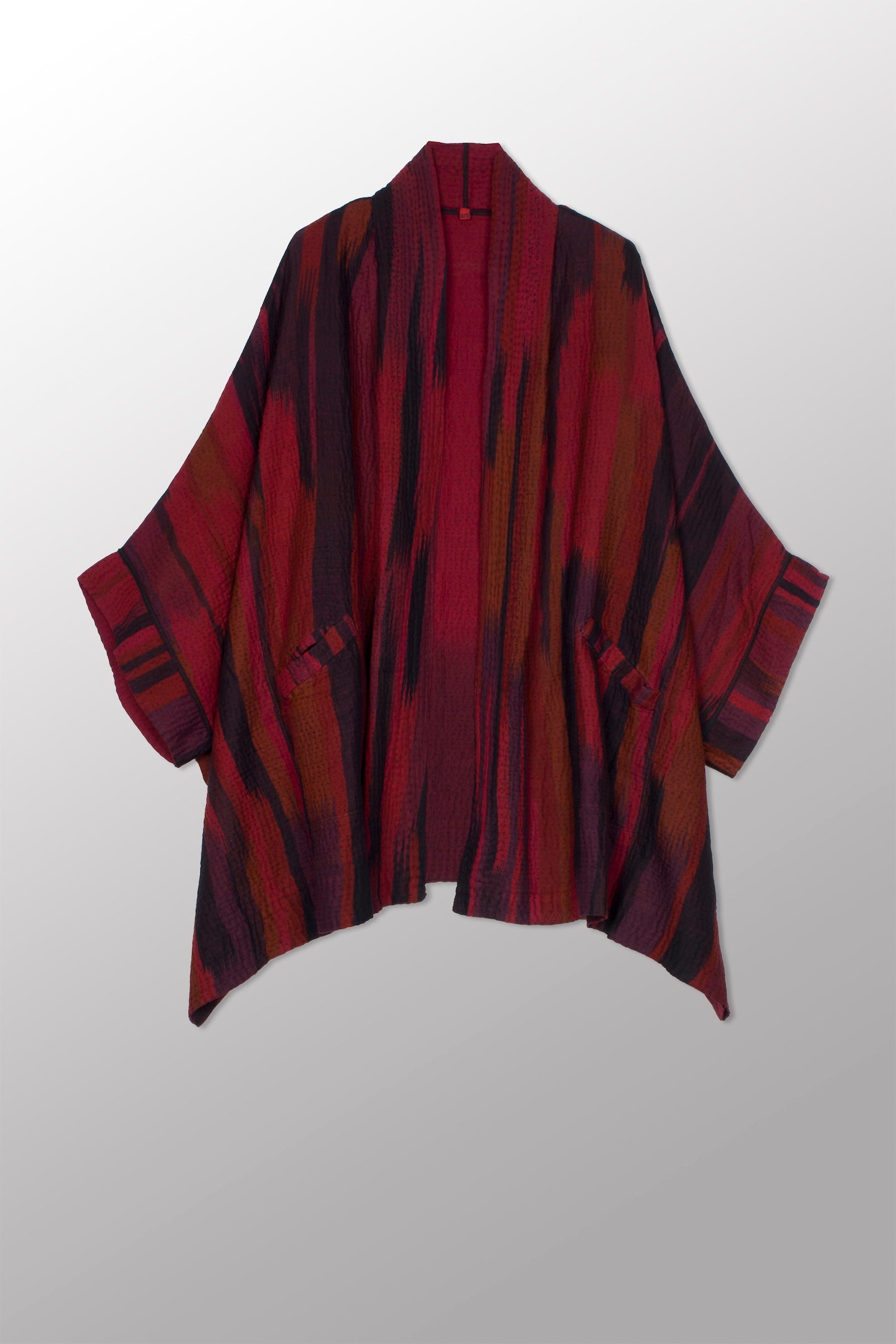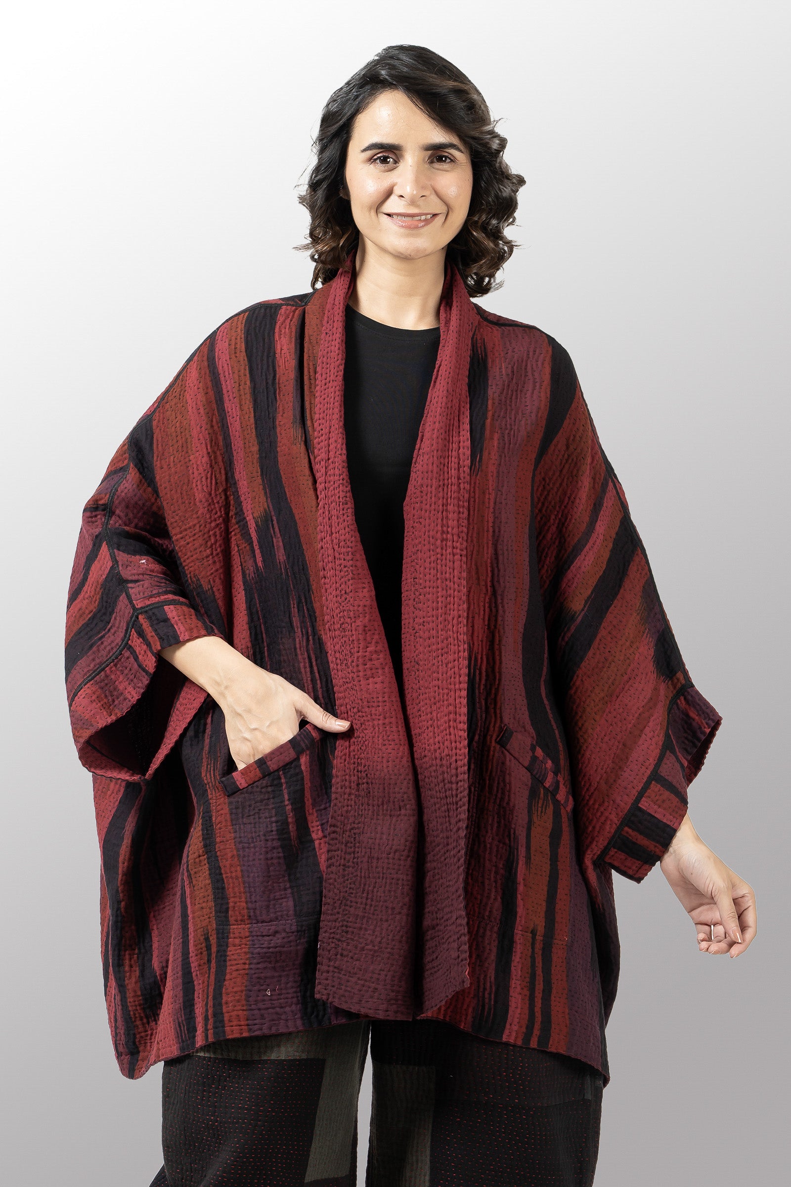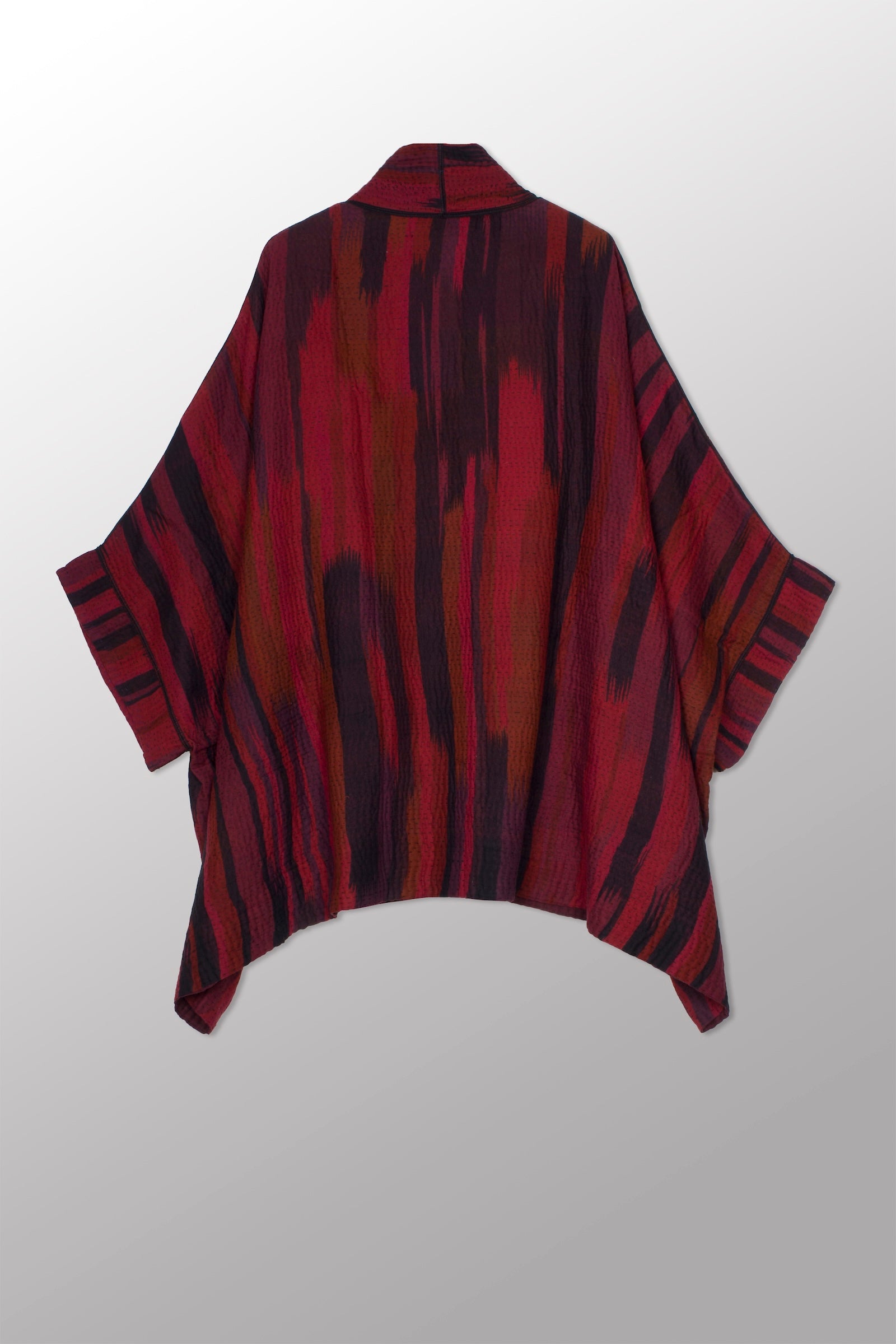 IKAT STRIPE KANTHA DOUBLE COLLAR PONCHO - is4323-DRD -