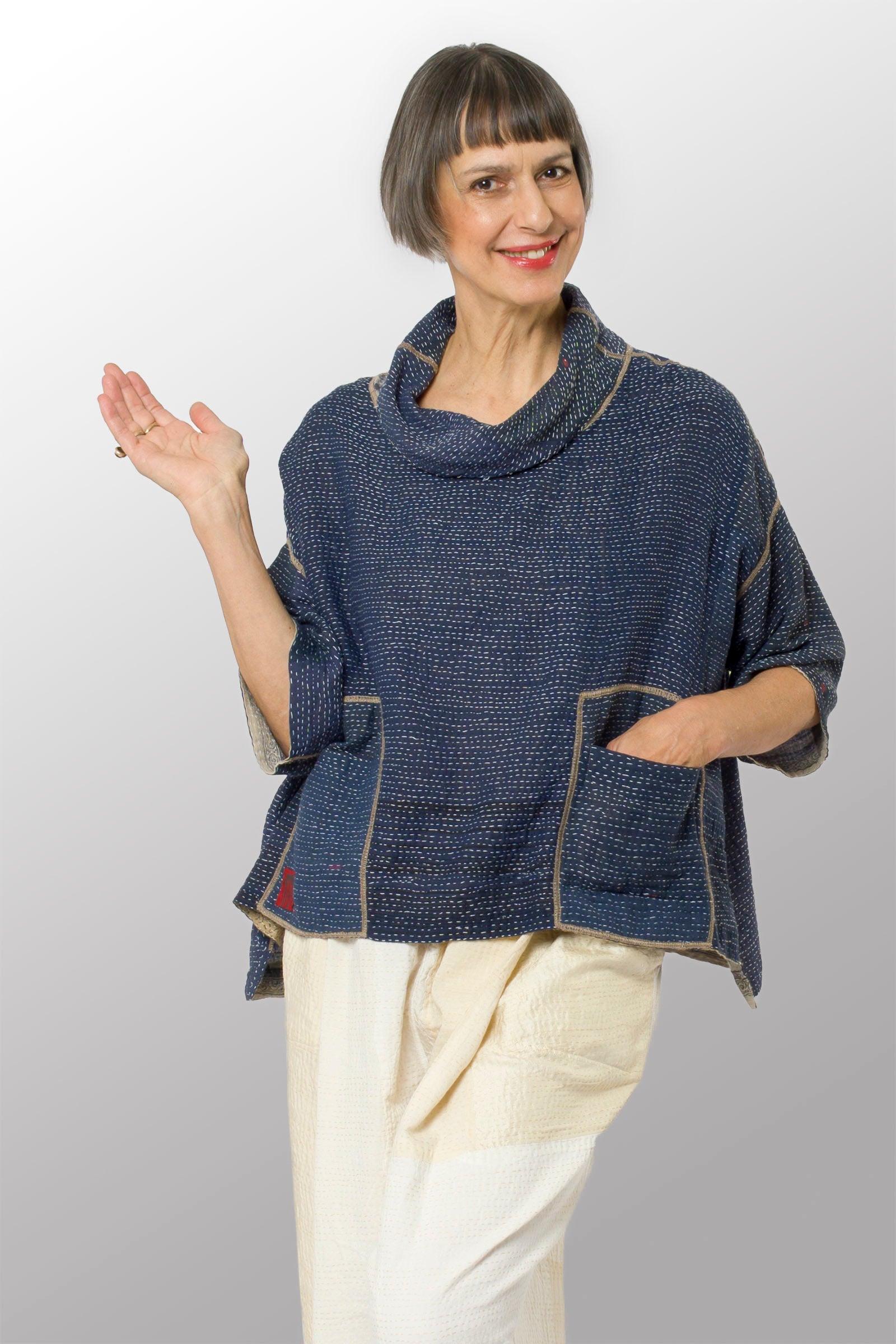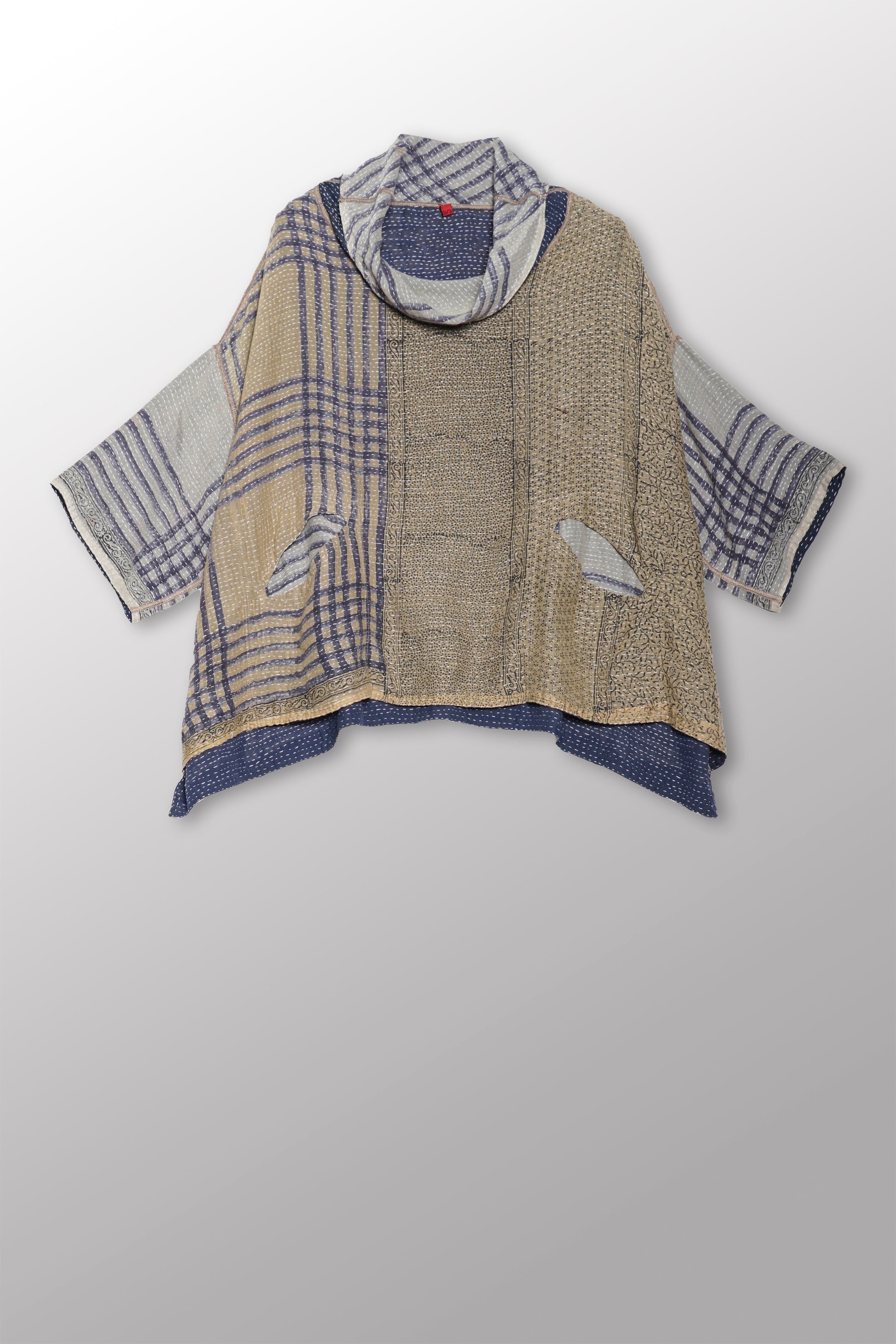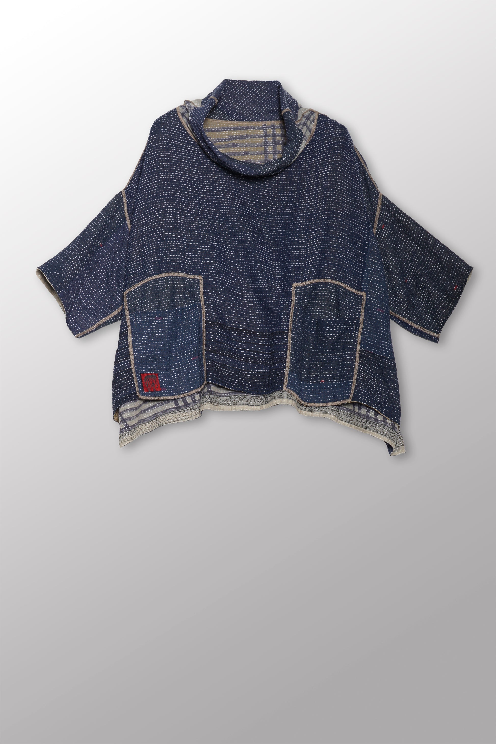 INDONESIAN PRINT VINTAGE INDIGO BACKING KANTHA COWL NECK PONCHO - bi2061-blu -
