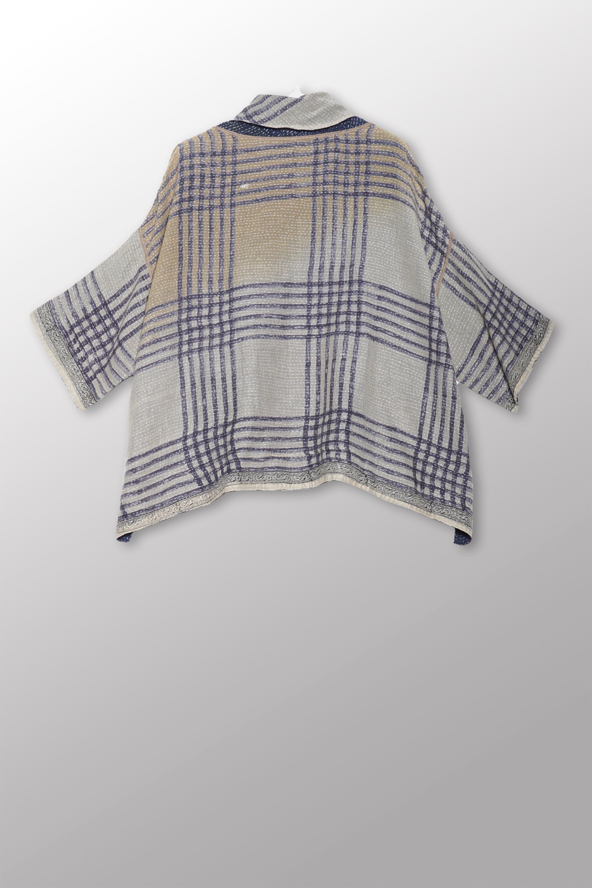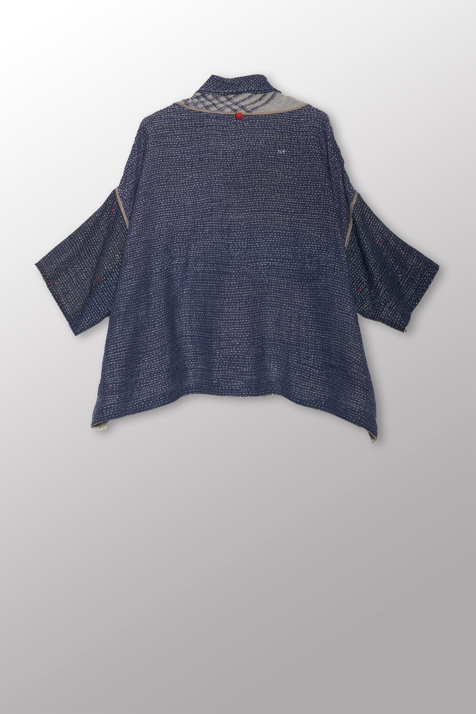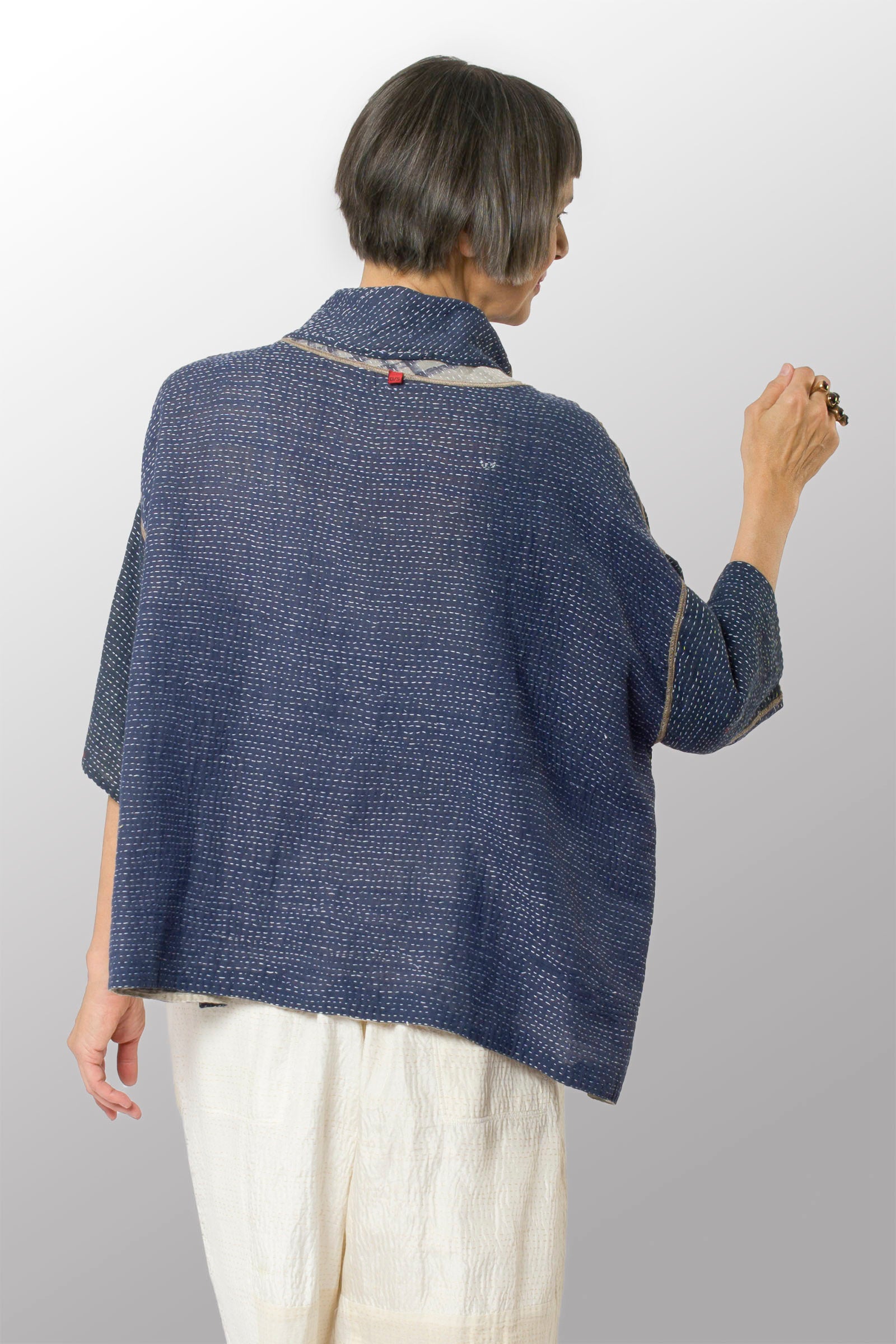 INDONESIAN PRINT VINTAGE INDIGO BACKING KANTHA COWL NECK PONCHO - bi2061-blu -