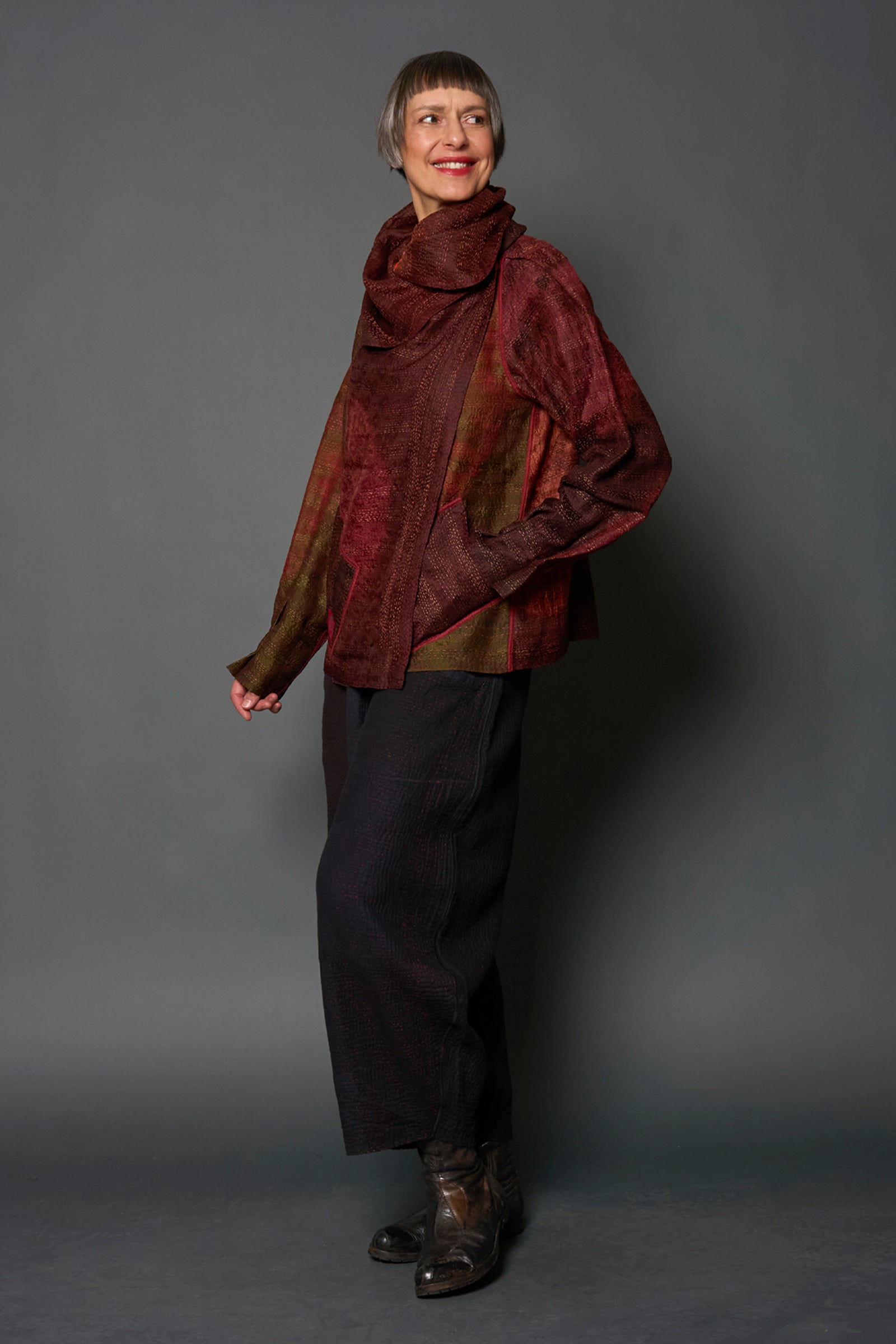 JACQUARD SILK PATCH TIE DYE CIRCLE SHIBORI KANTHA SCARF NECK BLOUSE - wj2561-brn -