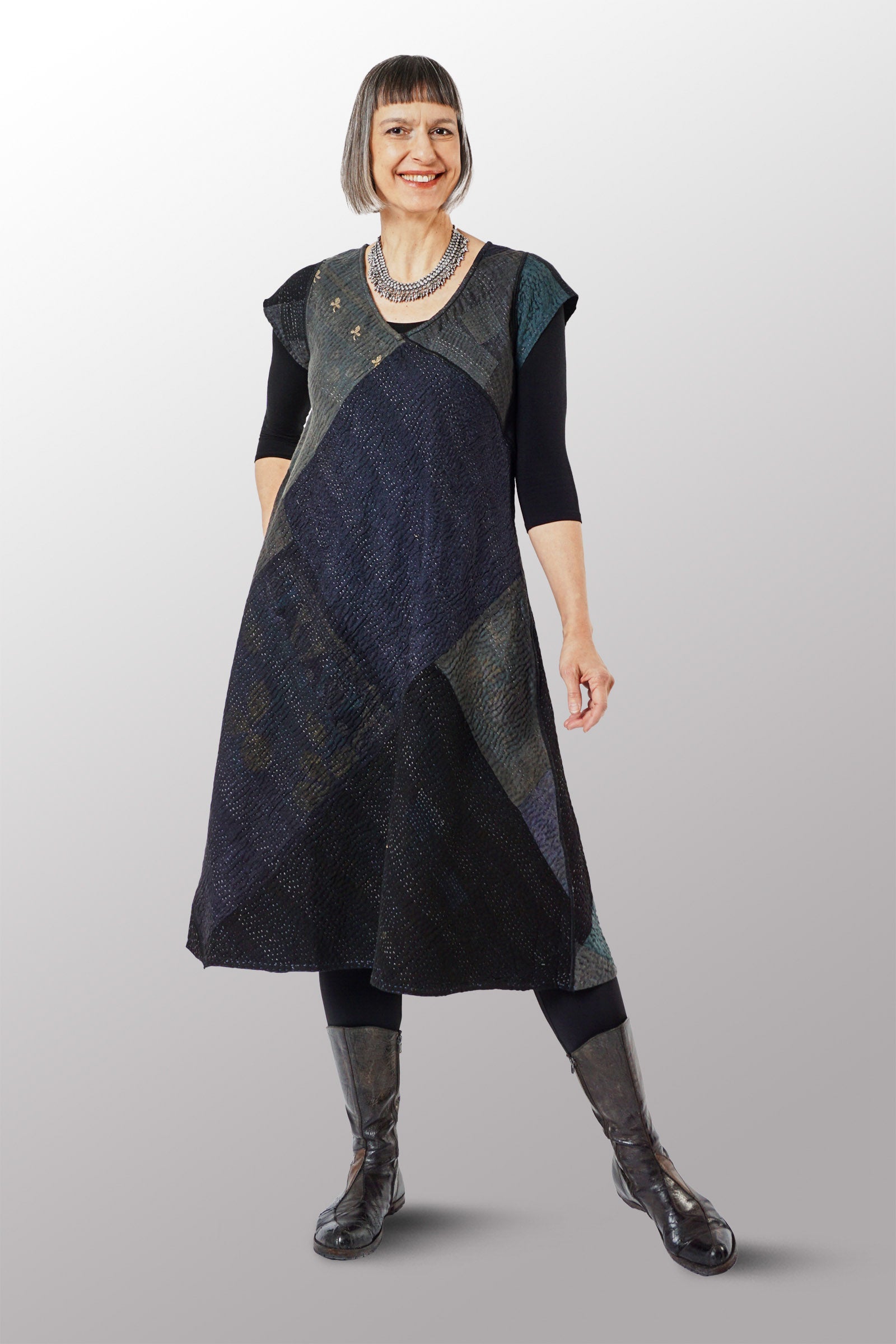 JAIPUR PATCH KANTHA CAP SLV. SEMI FLARE DRESS - jp4452-blk -