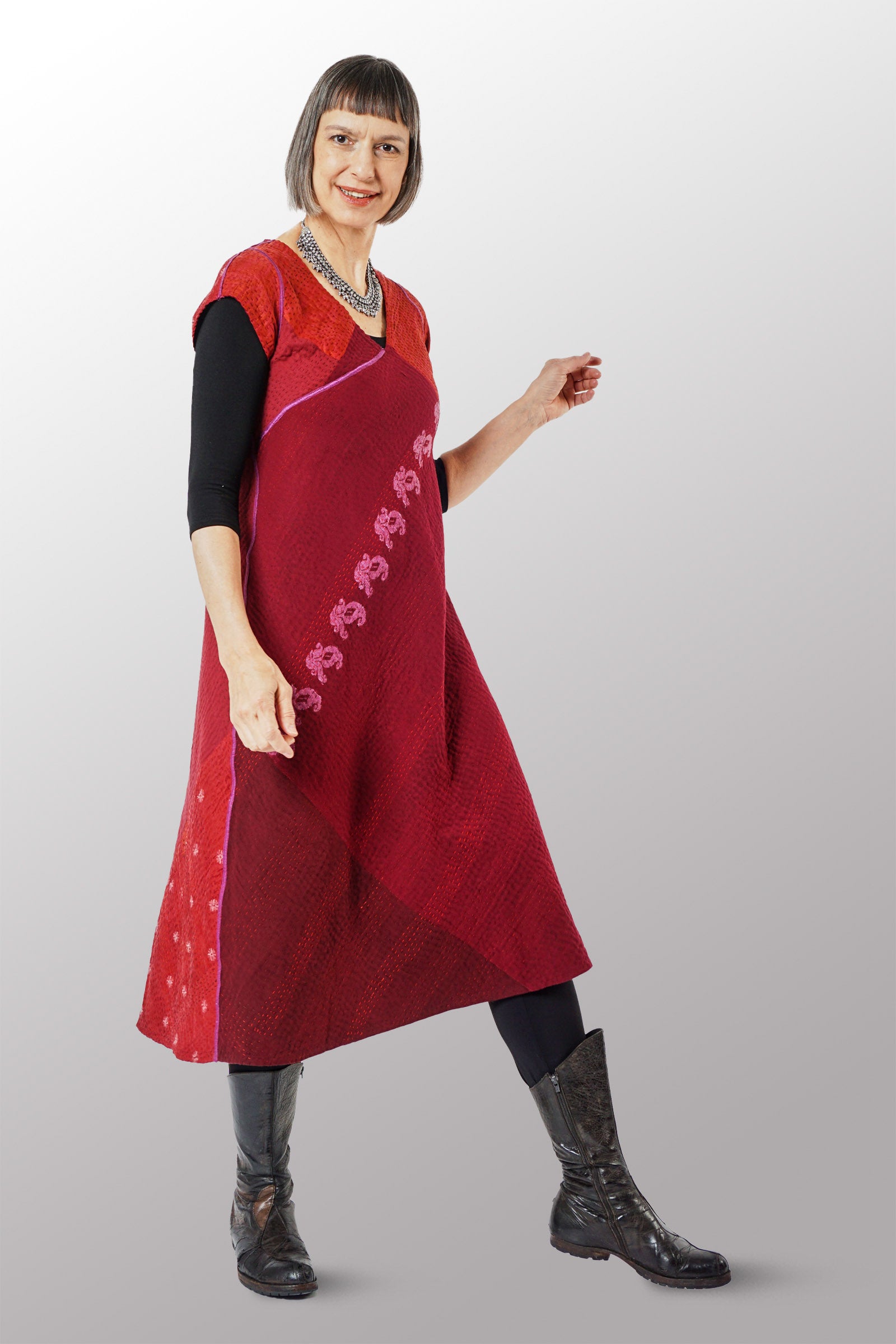 JAIPUR PATCH KANTHA CAP SLV. SEMI FLARE DRESS - jp4452-red -