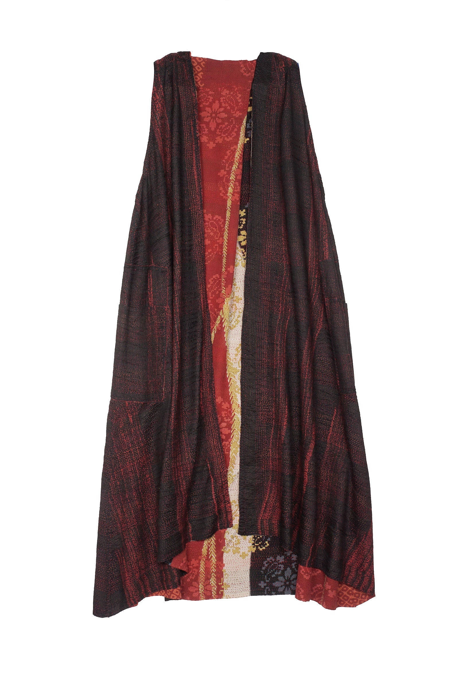KIMONO PRINT KANTHA BACK PLEATED VEST MAXI - kp2222-red -