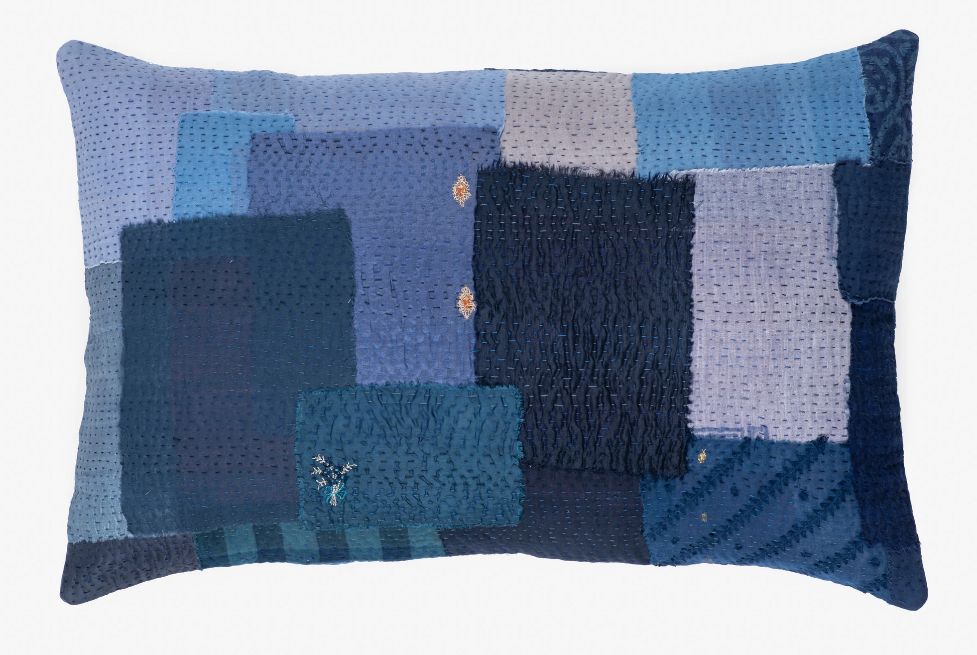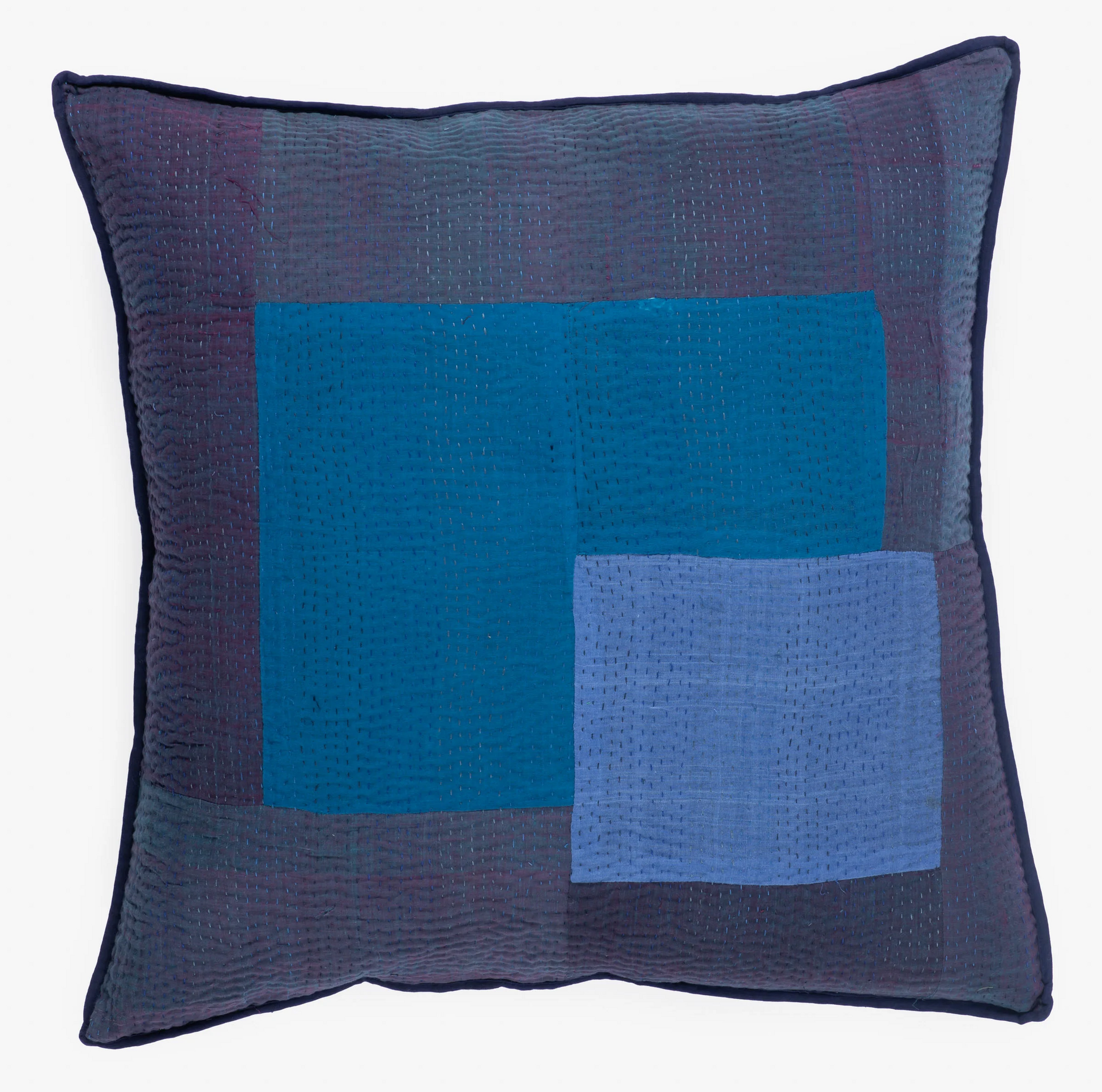 Undeniably Chic, Landscape Fray pillows are made of many different vintage patches. It has a thin layer of Wool along with four layers of cotton and silk recycled vintage saris. All the patches are articulately placed bind with threads of tonal shades leaving edges to fray. This luxuriously soft warm pillow inspires you to nestle into, be it in Bedroom or Lounge.