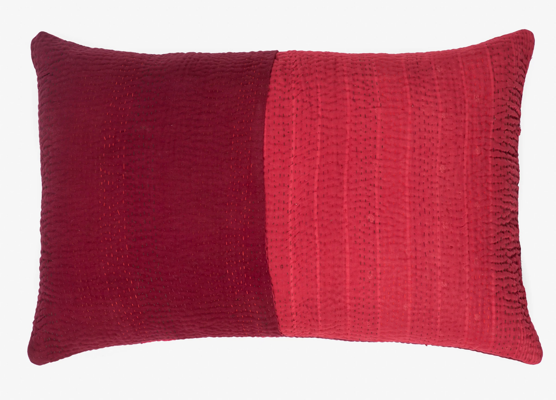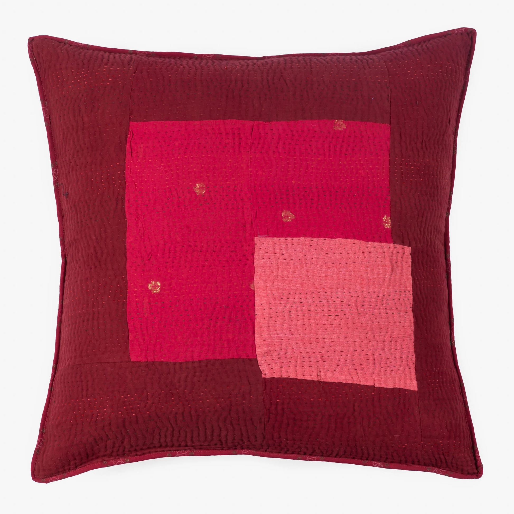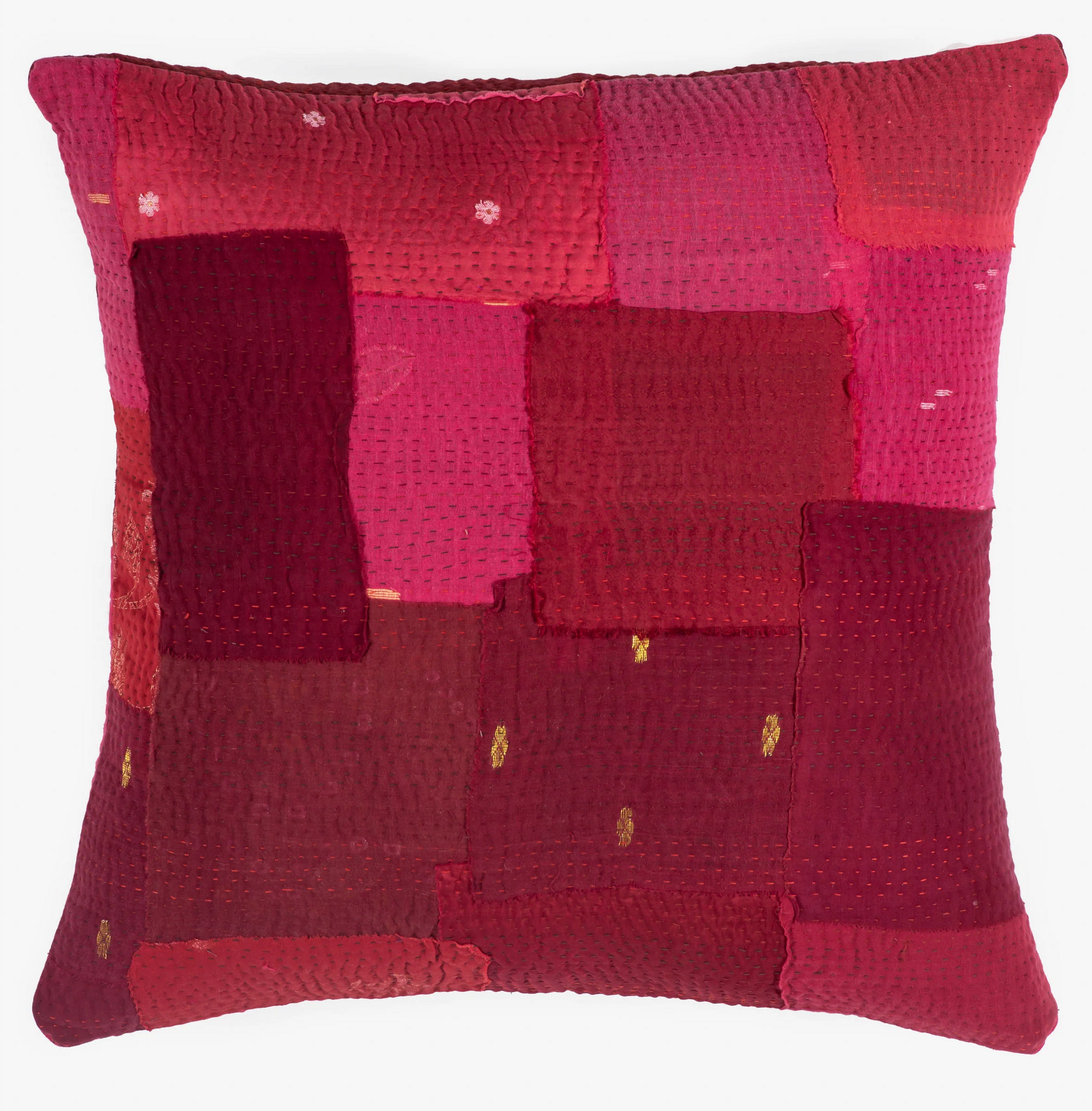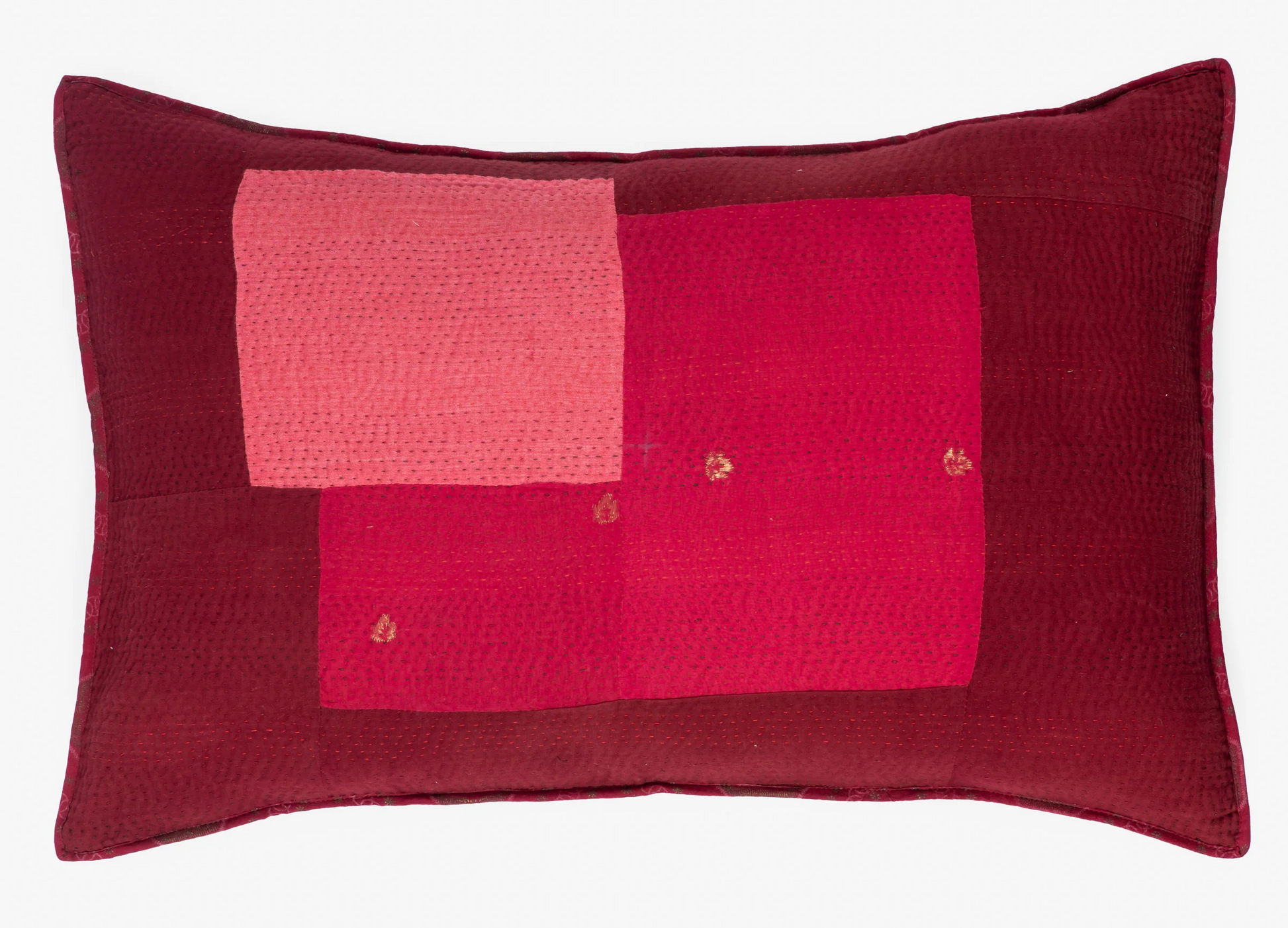 Undeniably Chic, Landscape Fray pillows are made of many different vintage patches. It has a thin layer of Wool along with four layers of cotton and silk recycled vintage saris. All the patches are articulately placed bind with threads of tonal shades leaving edges to fray. This luxuriously soft warm pillow inspires you to nestle into, be it in Bedroom or Lounge.